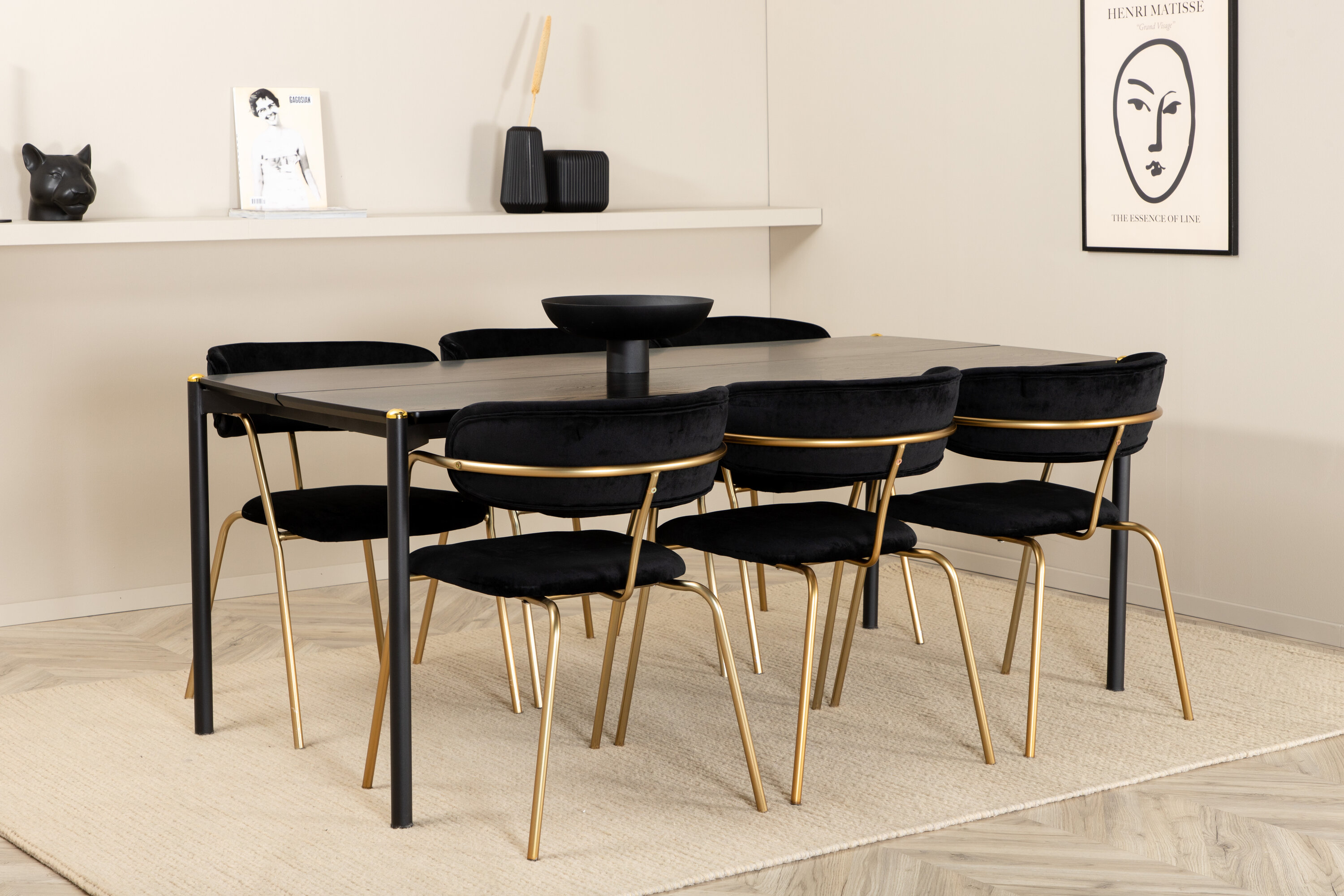 Stiilne, luksuslik ja ajatu – söögilaud Pelle loob teie kodus moeteadliku mulje! Disain on hästi läbimõeldud: sirged põhjamaised vormid, mis annavad stiilse tunde, kitsad rauast jalad, mille peal on dekoratiivne messingist punn, ja lauaplaadi keskel olev kulg, mis muutub maitsvaks detailiks. Lauaplaat on mustast spooniga MDF-st ja laua mõõdud: pikkus: 190cm, laius: 90cm, kõrgus: 75cm. Siia sobib 6 noolega söögitooli, millel on messingvärvi metallist toolijalad ja mustad pehmest sametkangast istmed. Tooli mõõdud: kõrgus: 79 cm, istme kõrgus: 47 cm, laius: 58 cm, sügavus: 61 cm.