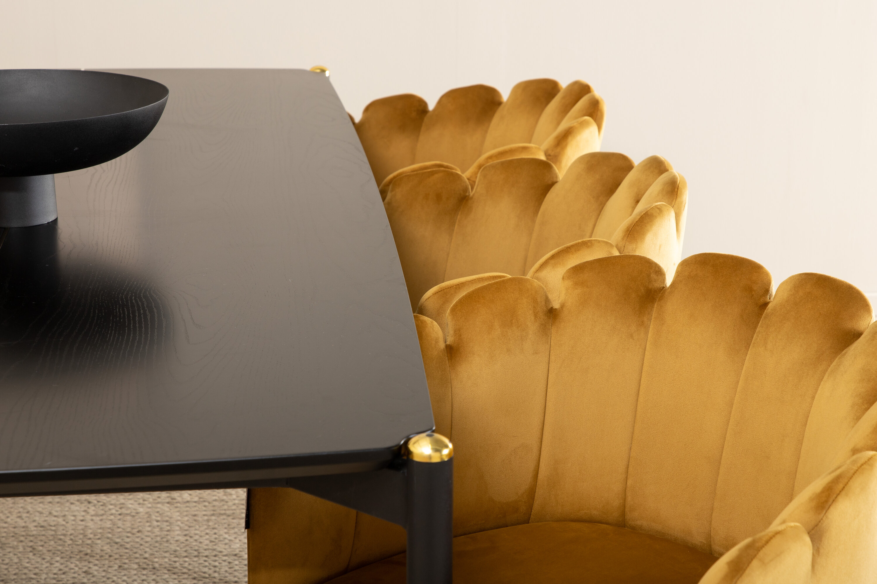Moodne värviklõps tõstab interjööri hõlpsalt järgmisele tasemele! Limhamni söögitool on oma pehmete vormide ja ussikujulise seljatoega, kollasest sametkangast ja mustadest pulbervärvitud metallist toolijalgadega tänapäevane lemmik paljudes majapidamistes. Toolidel on kutsuv disain dekoratiivse ussikujulise dekoratiivsete õmblustega seljatoega ja ümmargune kollasest sametkangast iste. Tooli mõõdud: kõrgus: 76,56 cm, istme kõrgus: 48 cm, laius: 61 cm, sügavus: 54 cm. Siin on 6 tooli sobitatud stiilse söögilauaga Pelle sarjast. Lauaplaat on mustast spooniga MDF-ist ja lauajalad mustast rauast ning peal on dekoratiivne messingist punn. Laua mõõdud: pikkus: 190 cm, laius: 90 cm, kõrgus: 75 cm.