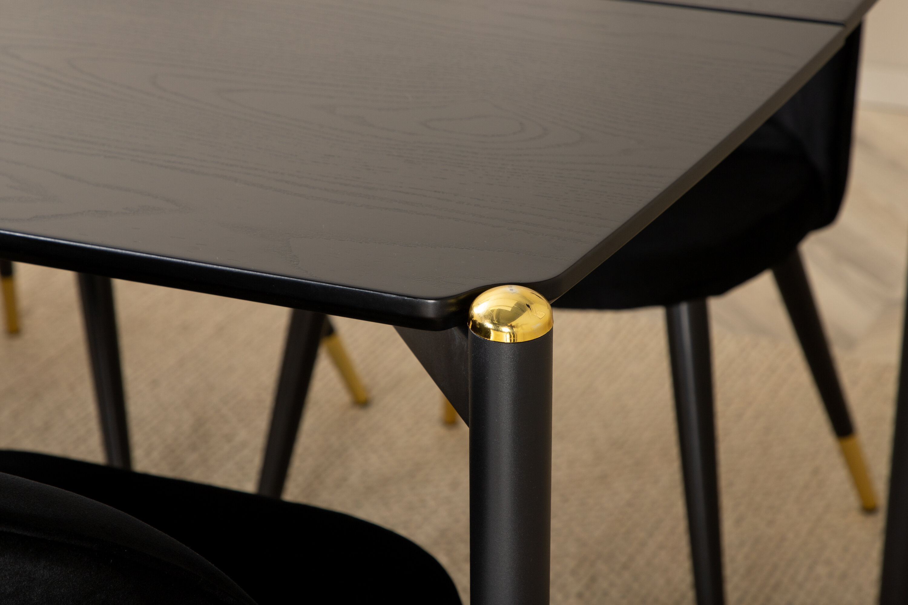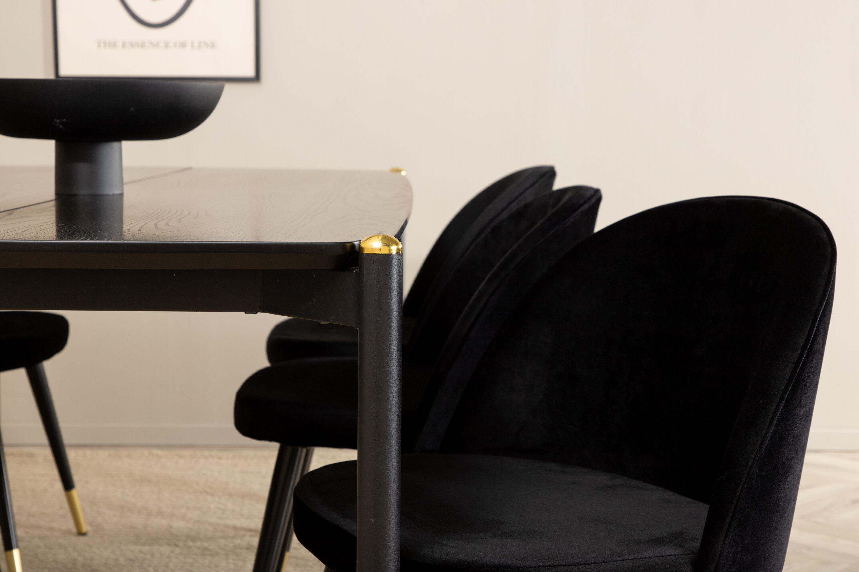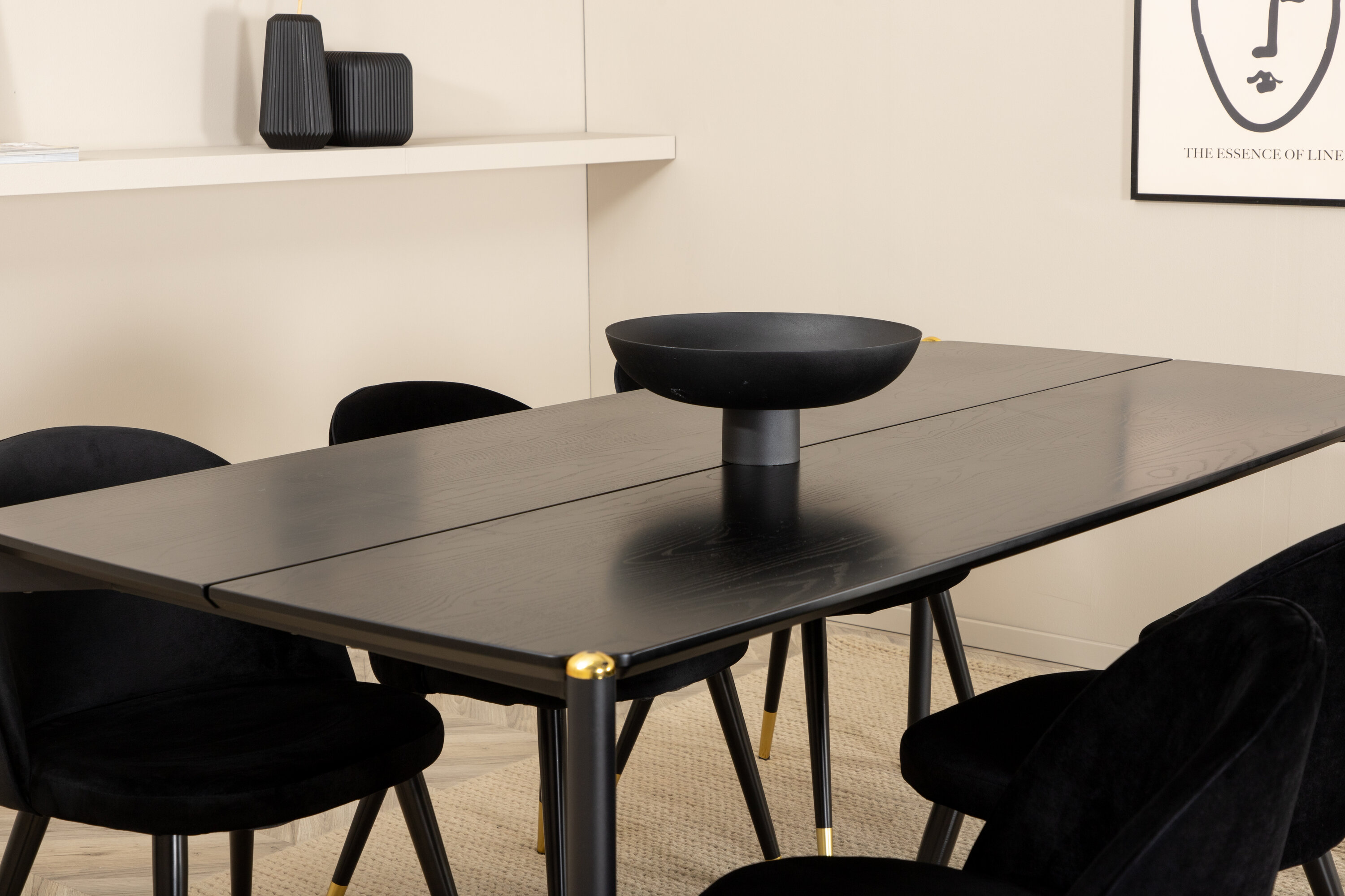 Ülemeelik must toidugrupp püsib üle aja ja sobib kergesti enamiku interjööristiilidega. Siin on söögilaud Pelle kombineeritud 6 pehme samettooliga sarjast Velvet. Laual on hästi läbimõeldud disain sirgete põhjamaiste kujunditega, mis annavad stiilse tunde, kitsad rauast jalad, mille peal on dekoratiivne messingist punn, ja lauaplaadi keskel olev kulg, mis muutub maitsvaks detailiks. Lauaplaat on mustast spooniga MDF-st ja laua mõõdud: pikkus: 190cm, laius: 90cm, kõrgus: 75cm. Toolidel on metallist mustad ja messingvärvi luud ning sametkangast mustad istmed. Tooli mõõdud: kõrgus: 76,5 cm, istme kõrgus: 46,5 cm, laius: 50 cm, sügavus: 57 cm.
