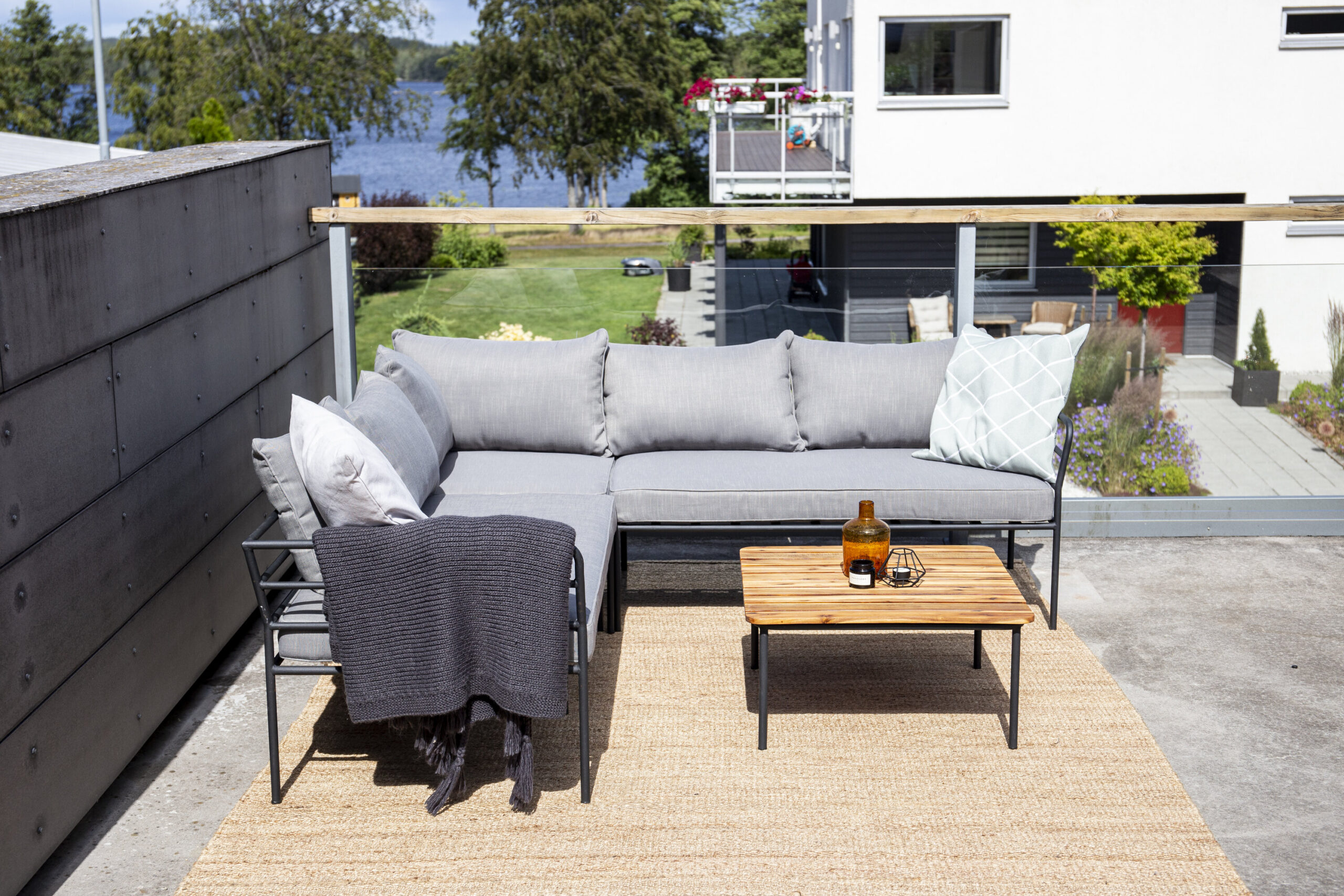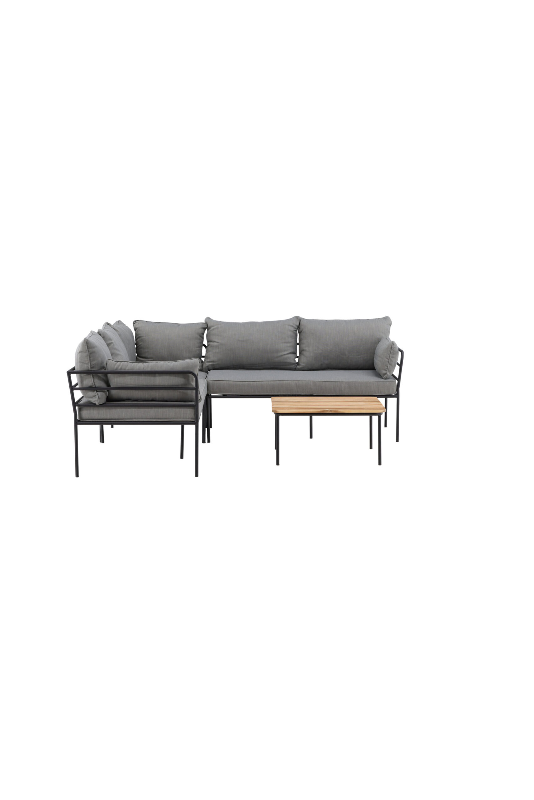 Stiilne ilus diivanirühm, mis sobib ideaalselt terrassile. Diivanigrupp koosneb nelja istme ja ühe nurgaga nurgadiivanist ning ilusast kohvilauast. Valmistatud mustast pulbervärvitud torumetallist, sealhulgas pehmed helehallid padjad. Stiilne kohvilaud õhukeste musta pulbriga torujalgadega, mis jätavad lauale ilusa ja stiilse mulje, ning ümarate nurkadega akaatsiapuust lauaplaat.