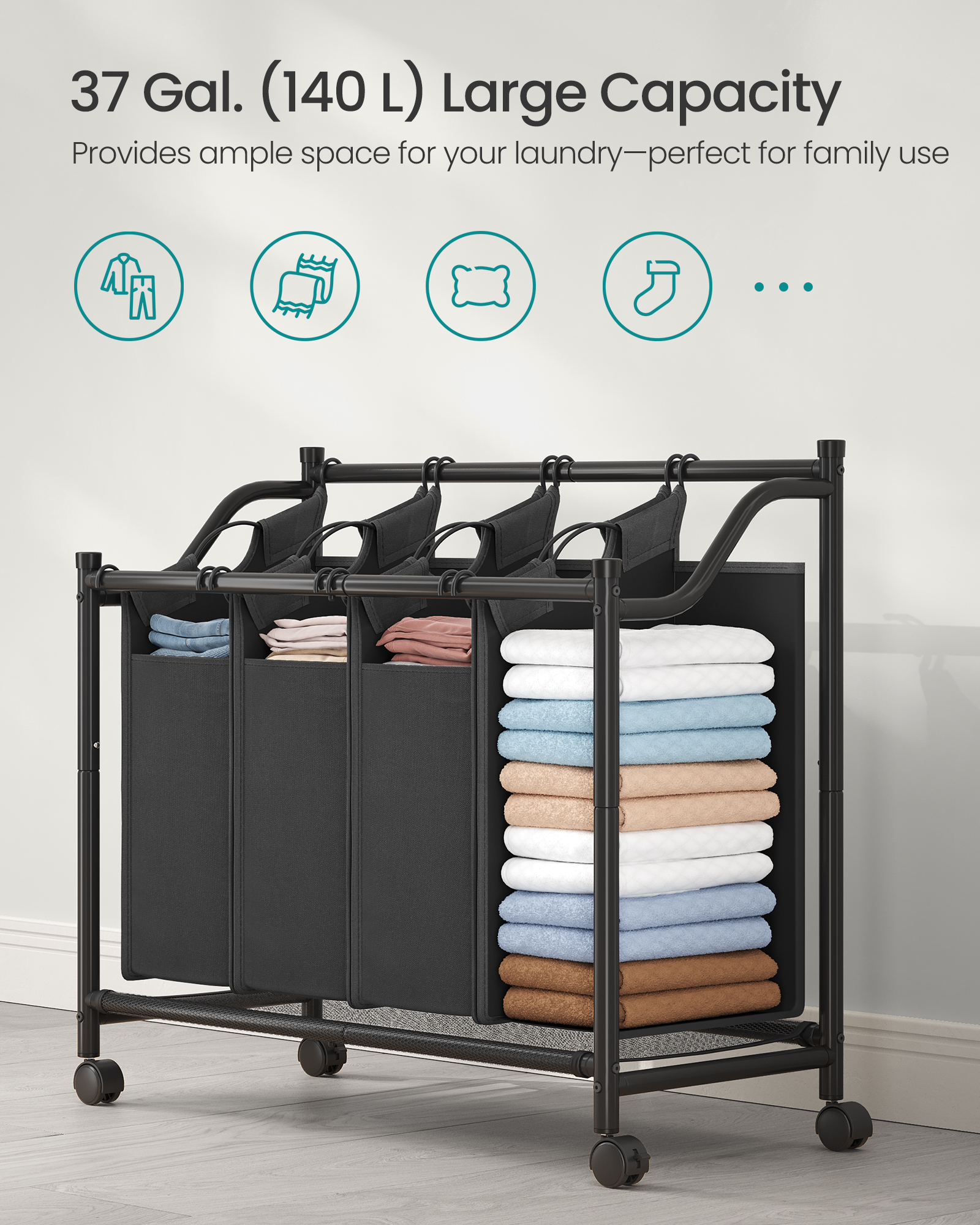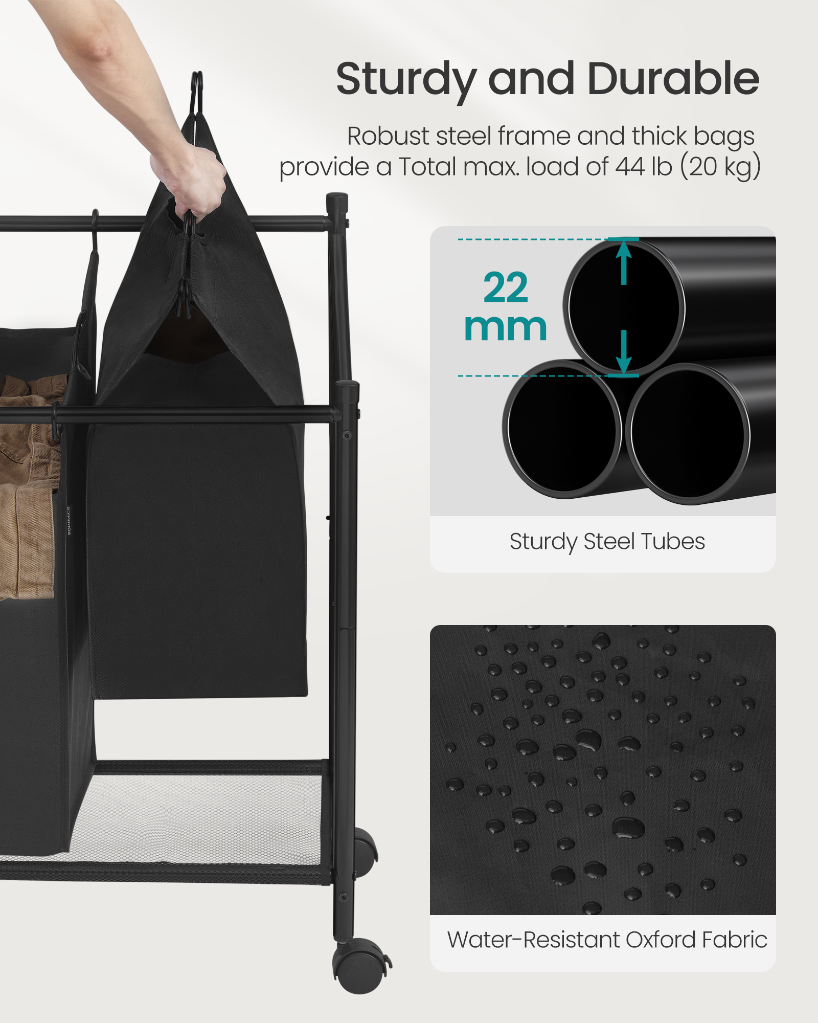 Spetsifikatsioonid: – Värvus: Tindimust – Materjal: Pulbervärvitud terastoru, 600D polüesterkiust kott, nailonist rattad – Toote kogumõõtmed: 86,5 x 38,5 x 81,5 cm (34,1″P x 15,2″L x 32,1″K) – Iga pesukoti suurus: 34 x 20 x 48,5/60,5 cm (13,4″P x 7,9″L x 19,1″/23,8″K) – Toote kaal: 3,7 kg (7,7 naela) – Maksimaalne staatiline kandevõime: 20 kg (44 naela) – Iga koti maksimaalne staatiline kandevõime: 5 kg (11 naela) Pakendi sisu: – 1 x 4 koti pesusorteerija – 1 x tarvikute komplekt – 1 x juhend