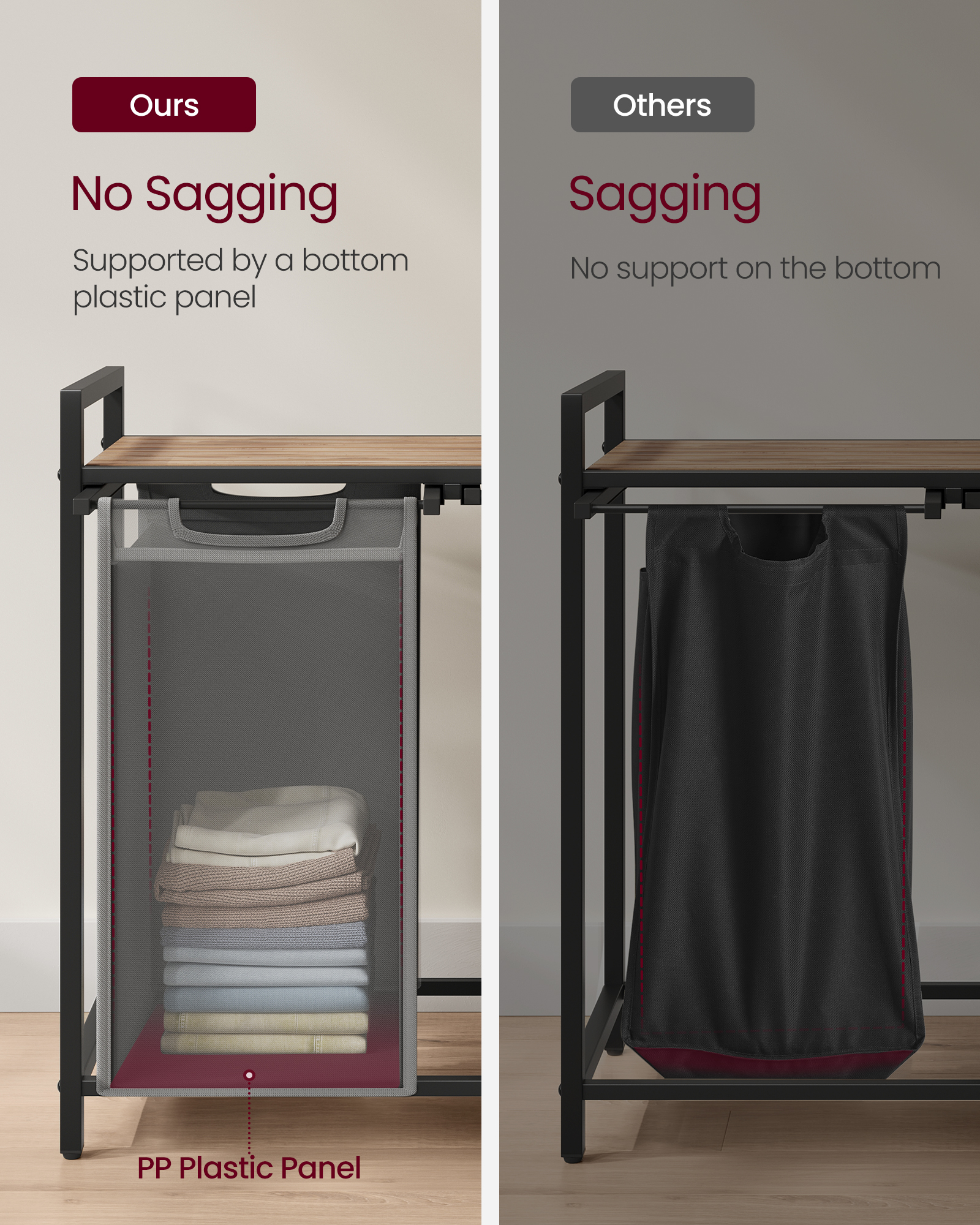 Spetsifikatsioonid: – Värvus: kaamelipruun, hall – Materjal: MDF (keskmise tihedusega puitkiudplaat), teras, Oxford-kangas – Toote mõõdud: 73 x 33 x 72 cm (P x L x K) – Iga voodri mõõdud: 30 x 30 x 51 cm (P x L x K) – Toote kaal: 6,6 kg – Maksimaalne staatiline kandevõime kokku: 30 kg – Iga voodri maksimaalne staatiline kandevõime: 10 kg – Riiuli maksimaalne staatiline kandevõime: 20 kg Pakisisu: – 1 x pesukorv – 2 x ümberkukkumisvastast komplekti – 1 x tarvikute kott – 1 x juhend VASAGLE Märkused: – Ohutuse tagamiseks ärge lubage lastel pesukorvi otsa ronida ega sellega mängida. – Ohutu kasutamise tagamiseks kinnitage pesukorv kaasasoleva ümberkukkumisvastase komplektiga seina külge. – Ärge istuge pesukorvil, kuna see võib ümber kukkuda. – Sõrmede muljumise vältimiseks olge pesukorvi väljatõmbamisel või sisselükkamisel ettevaatlik. – Riidest voodreid ei saa masinpesta.