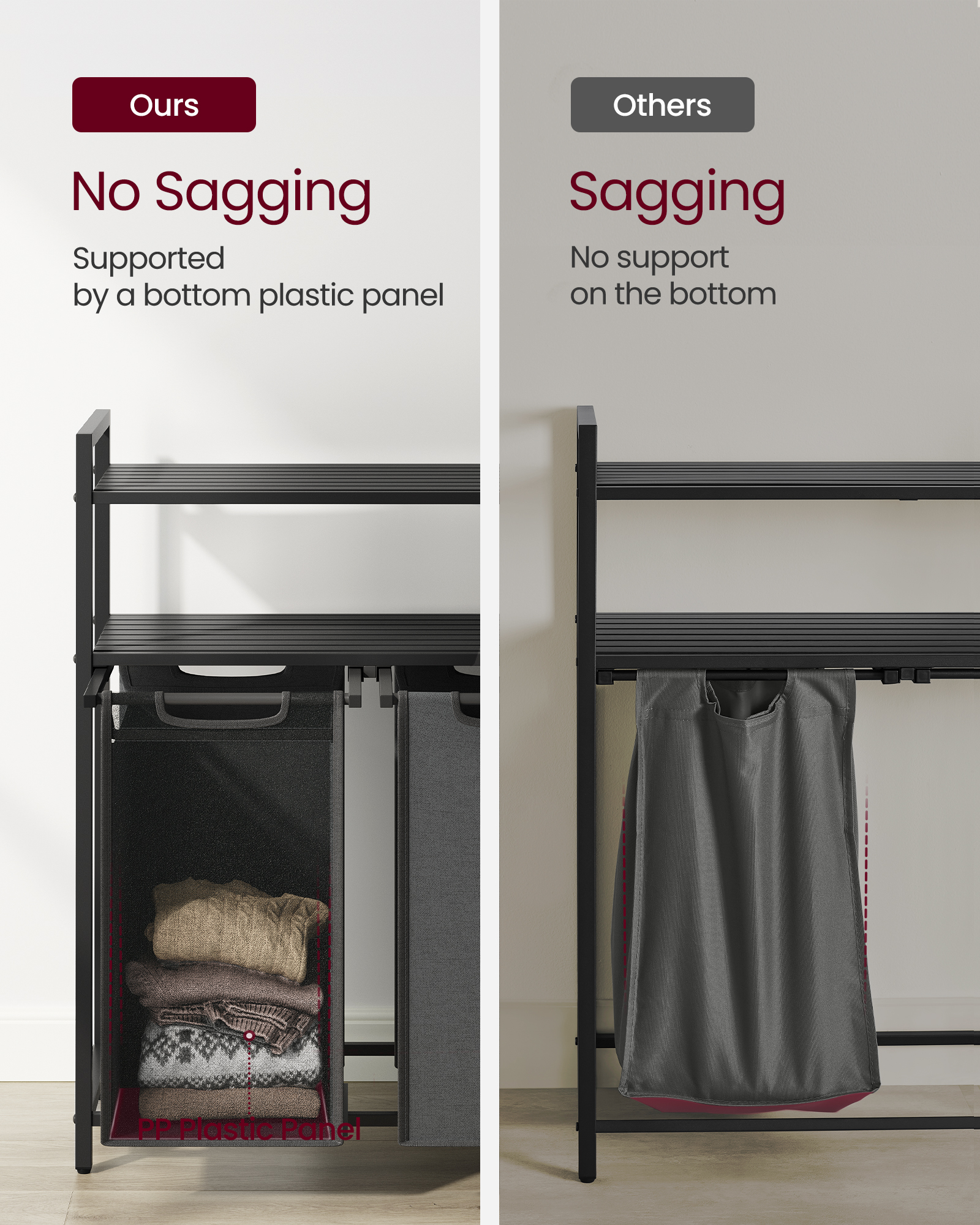Tooteinfo: – Värvus: mustjashall. – Materjal: MDF (keskmise paksusega puitkiudplaat), teras, Oxford-riie – Kogumõõdud: 73 x 33 x 92 cm (P x L x K) – Iga koti mõõdud: 30 x 30 x 51 cm (P x L x K) – Kaal: 9,3 kg – Maksimaalne staatiline koormus: 30 kg – Iga koti maksimaalne staatiline kandevõime: 10 kg – Iga riiuli maksimaalne staatiline kandevõime: 20 kg Pakend sisaldab: – 1 x pesukorv riiulitega – 2 x pesukorvi katet – 1 x tarvikute pakk – 1 x juhend