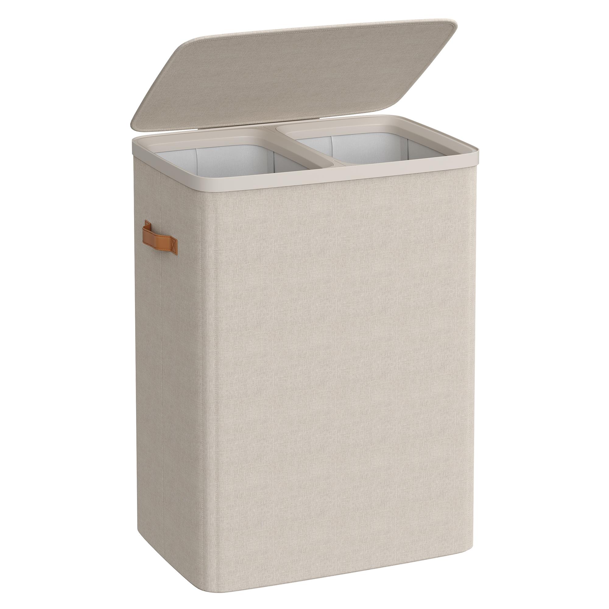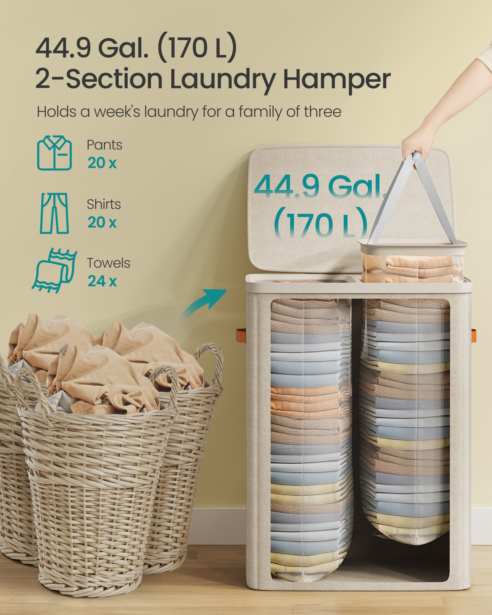 Spetsifikatsioonid: Värv: Cappuccino beež Materjal: 150 g/m² polüesterkangas, PP-plastik, klaaskiud Toote mõõdud: 56 x 40 x 75 cm (22″P x 15,7″L x 29,5″K) Toote kaal: 2,5 kg (5,4 naela) Iga sisekoti maksimaalne staatiline kandevõime: 10 kg (22 naela) Maksimaalne staatiline kandevõime kokku: 20 kg (44 naela) Pakisisu: 1 x pesukorv 1 x juhend
