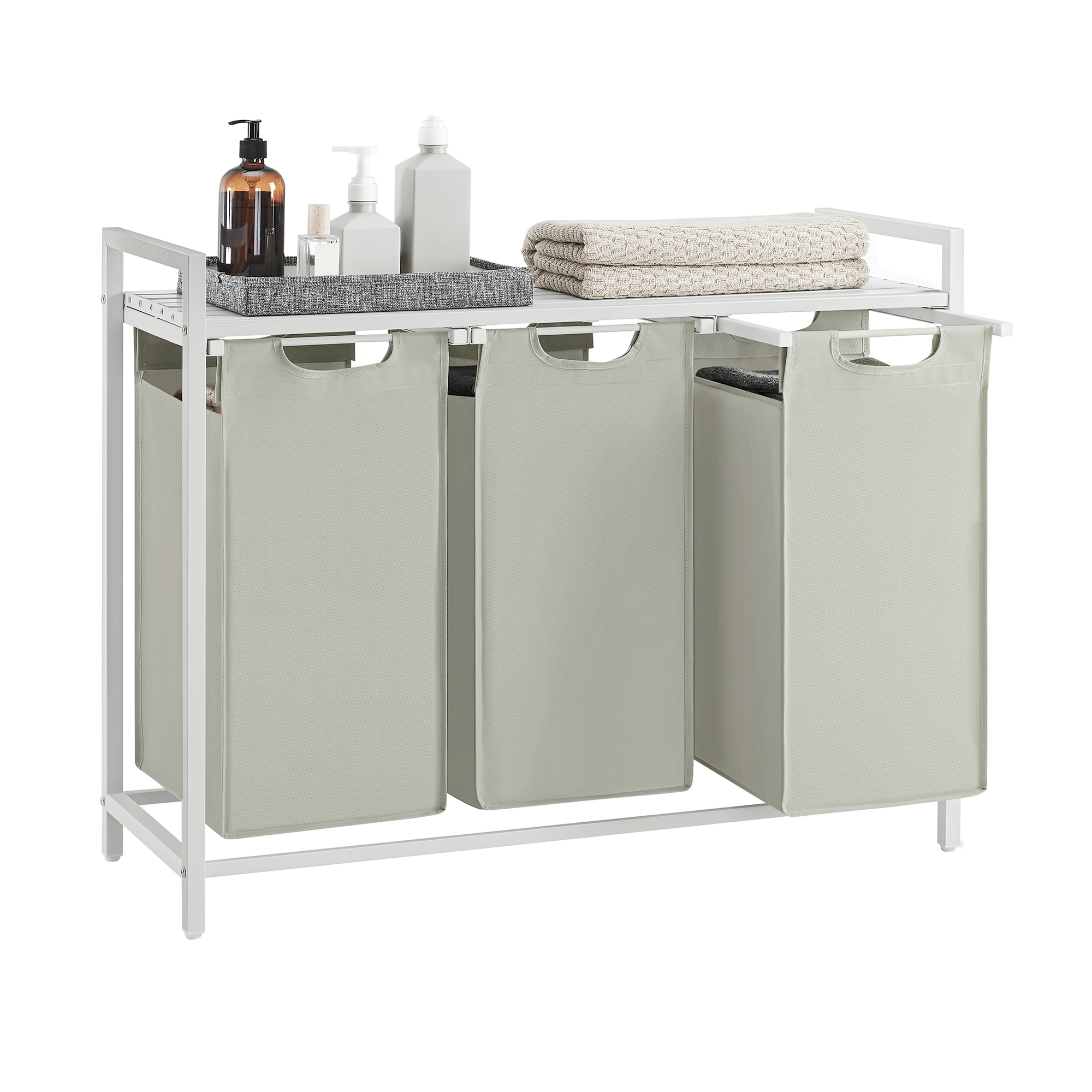 Omadused: Valge värv Materjalid: MDF-plaat, teras, Oxford-riie Toote mõõtmed: 92,5 x 33 x 72 cm (P x L x K) Koti mõõtmed: 25 x 30 x 51 cm (P x L x K) Kaal: 8,1 kg Maksimaalne staatiline kandevõime: 30 kg Koti maksimaalne staatiline kandevõime: 10 kg Aluse maksimaalne staatiline kandevõime: 20 kg Tarne: 1 x pesukorv 2 x kaldumisvastane seadeldis 1 x kinnituskomplekt 1 x kasutusjuhend
