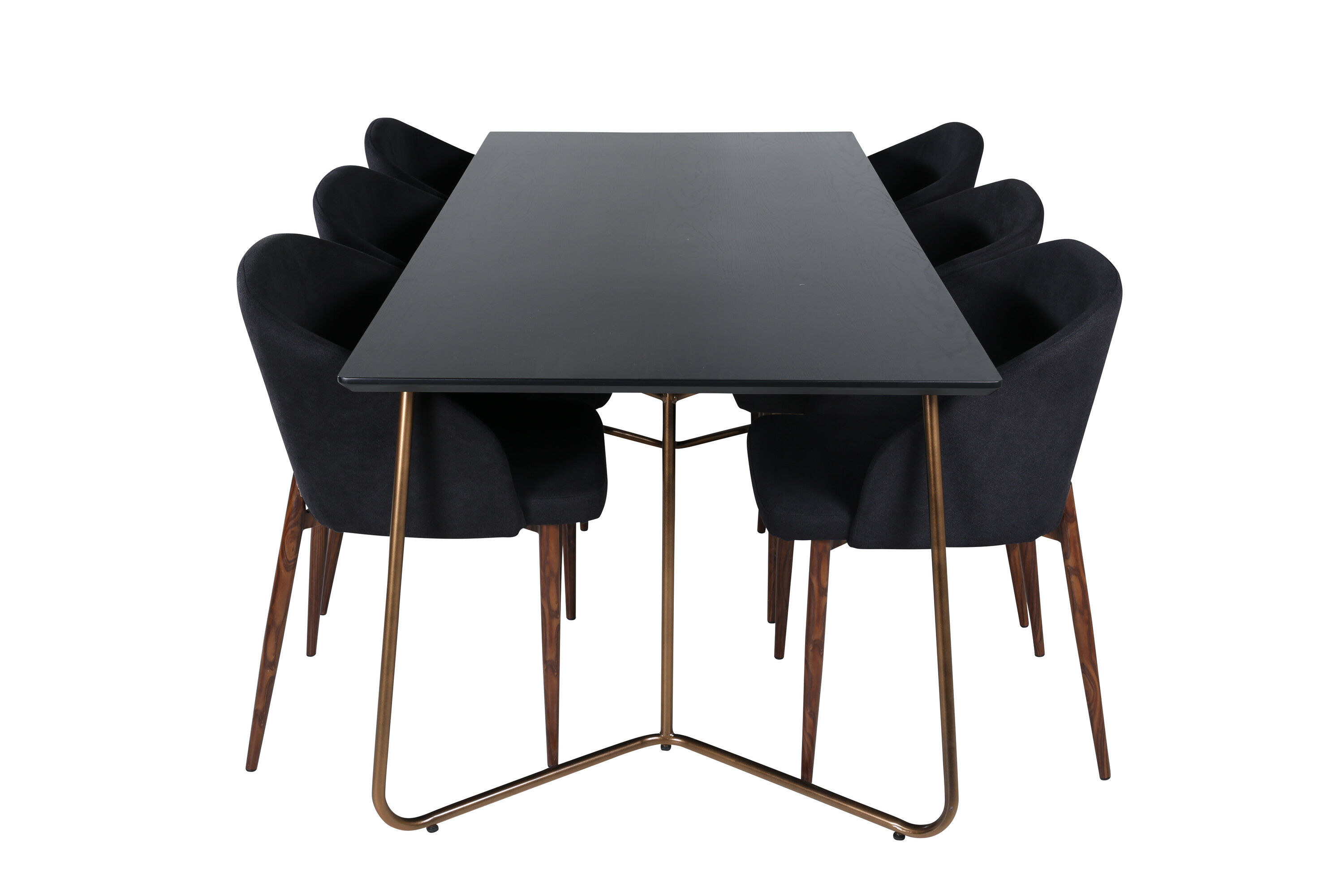 Saagu sellest kaunilt kokkusobivast tänapäevase tunnetusega toidugrupist loomulik kogunemispaik teie kodus. Söögilaud Petra on läbimõeldud disainiga Skandinaavia kujunditega, mis annab stiilse tunde, kitsad, kergelt laienevad rauast jalad ja lauaplaat mustast spooniga MDF-st. Laua mõõdud: pikkus: 190 cm, laius: 90 cm, kõrgus: 75 cm. Sobitatakse siin meie kuuenda maitsva söögitooliga Arch koos pähklivärvi metalltooli ja mustade polüestrist istmetega. Tooli mõõdud: kõrgus: 83 cm, istme kõrgus: 53 cm, laius: 48,5 cm, sügavus: 55 cm. Toidugrupp, kus kõigil on õigus lihtsalt!