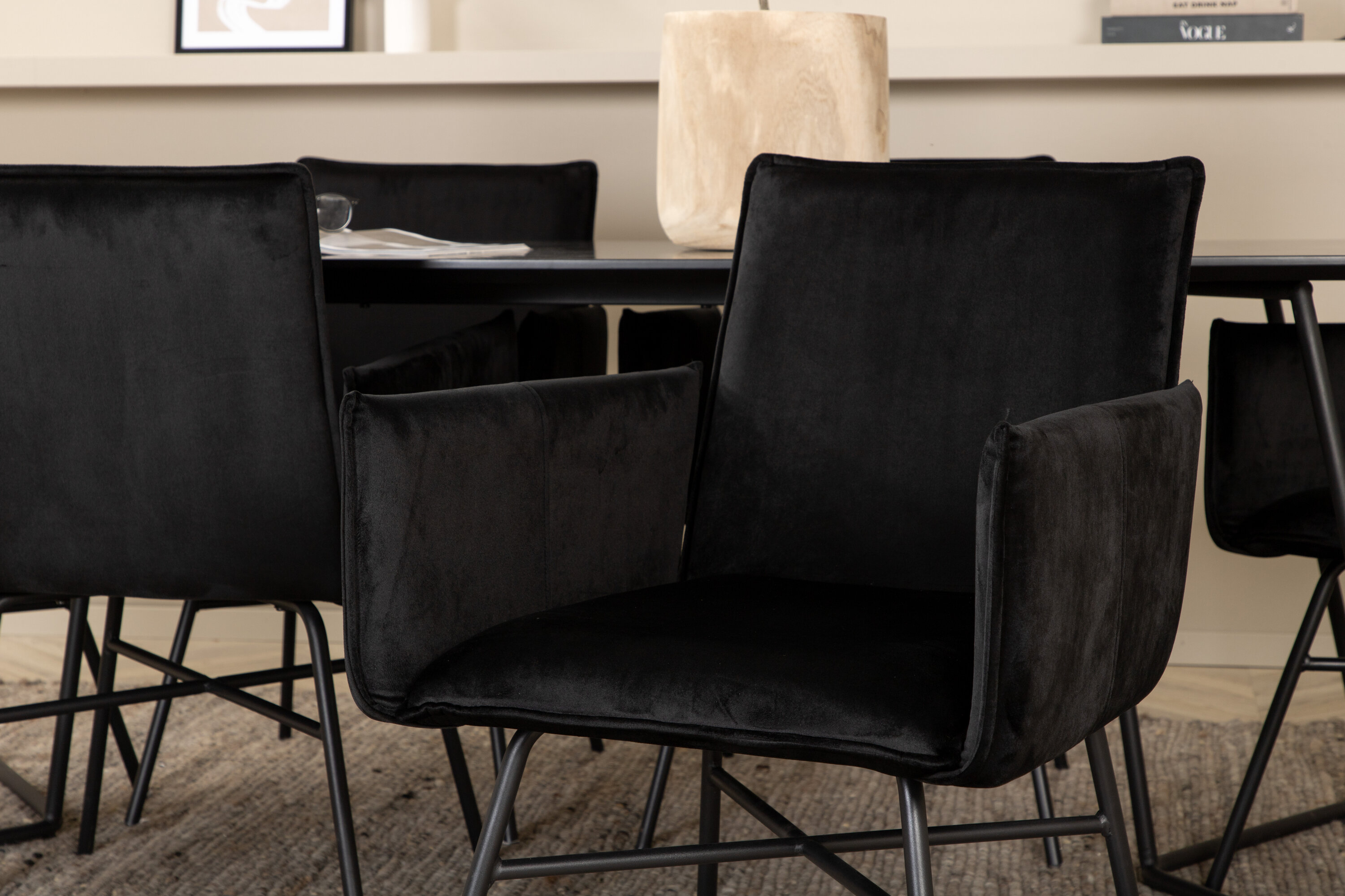 Looge pilkupüüdja, mis avaldab muljet! Söögitoolidel Petra on maitsev disain sirgete põhjamaiste vormidega, musta värvi pehme sametkangas ja mustast rauast toolijalad. Tooli mõõdud: kõrgus: 87 cm, istme kõrgus: 48 cm, laius: 57 cm, sügavus: 60 cm. Siin on 6 tooli kombineeritud söögilauaga Petra. Laual on läbimõeldud disain Skandinaavia kujunditega, mis annab stiilse tunde, kitsad, kergelt laienevad rauast jalad ja mustast spooniga MDF-ist lauaplaat. Laua mõõdud: pikkus: 190 cm, laius: 90 cm, kõrgus: 75 cm.