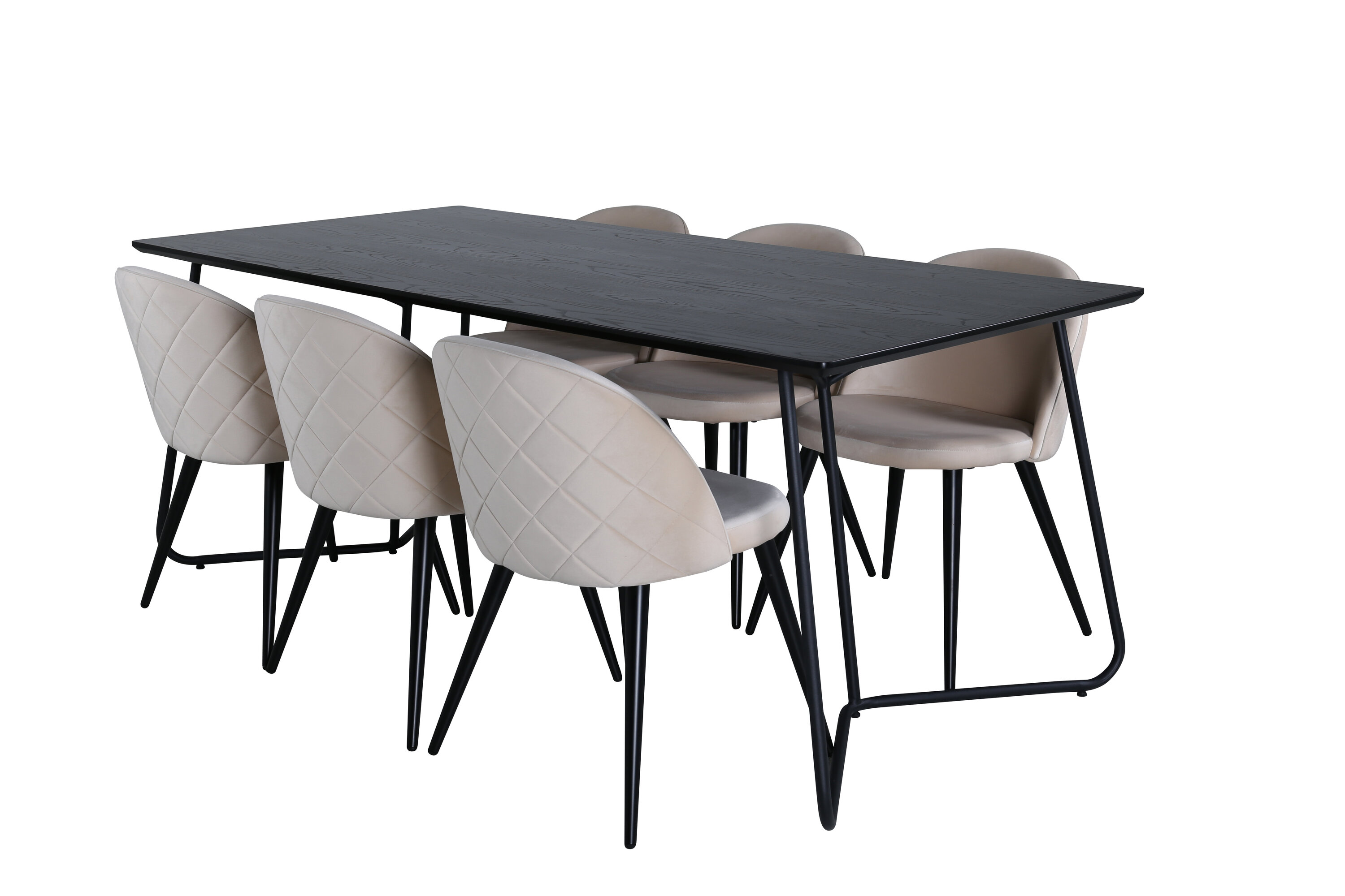 Mida rohkemat võikski tahta kui toidugruppi, mis on ühtaegu mugav, stiilne ja sisendab tuppa luksuslikku tunnet? Just seda see kaasaegne kombinatsioon pakub! Söögilaud Petra on läbimõeldud disainiga Skandinaavia kujunditega, mis annab stiilse tunde, kitsad, kergelt laienevad rauast jalad ja lauaplaat mustast spooniga MDF-st. Laua mõõdud: pikkus: 190 cm, laius: 90 cm, kõrgus: 75 cm. Siin koos 6 pehme disainiga sametist söögitooli, millel on mustad metallist toolijalad ja beežid polüestrist istmed. Tooli mõõdud: kõrgus: 76,5 cm, istme kõrgus: 46,5 cm, laius: 50 cm, sügavus: 57 cm.