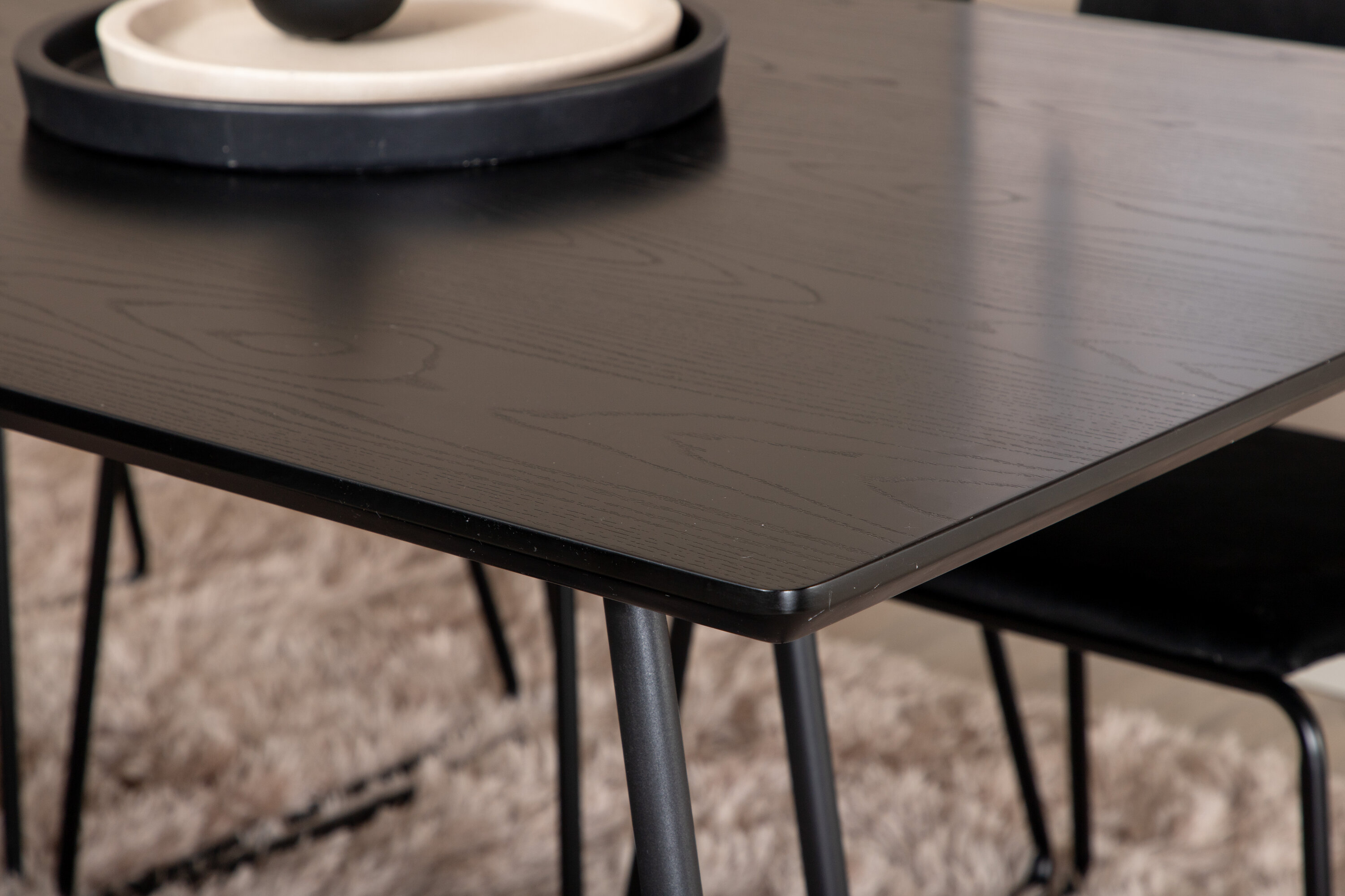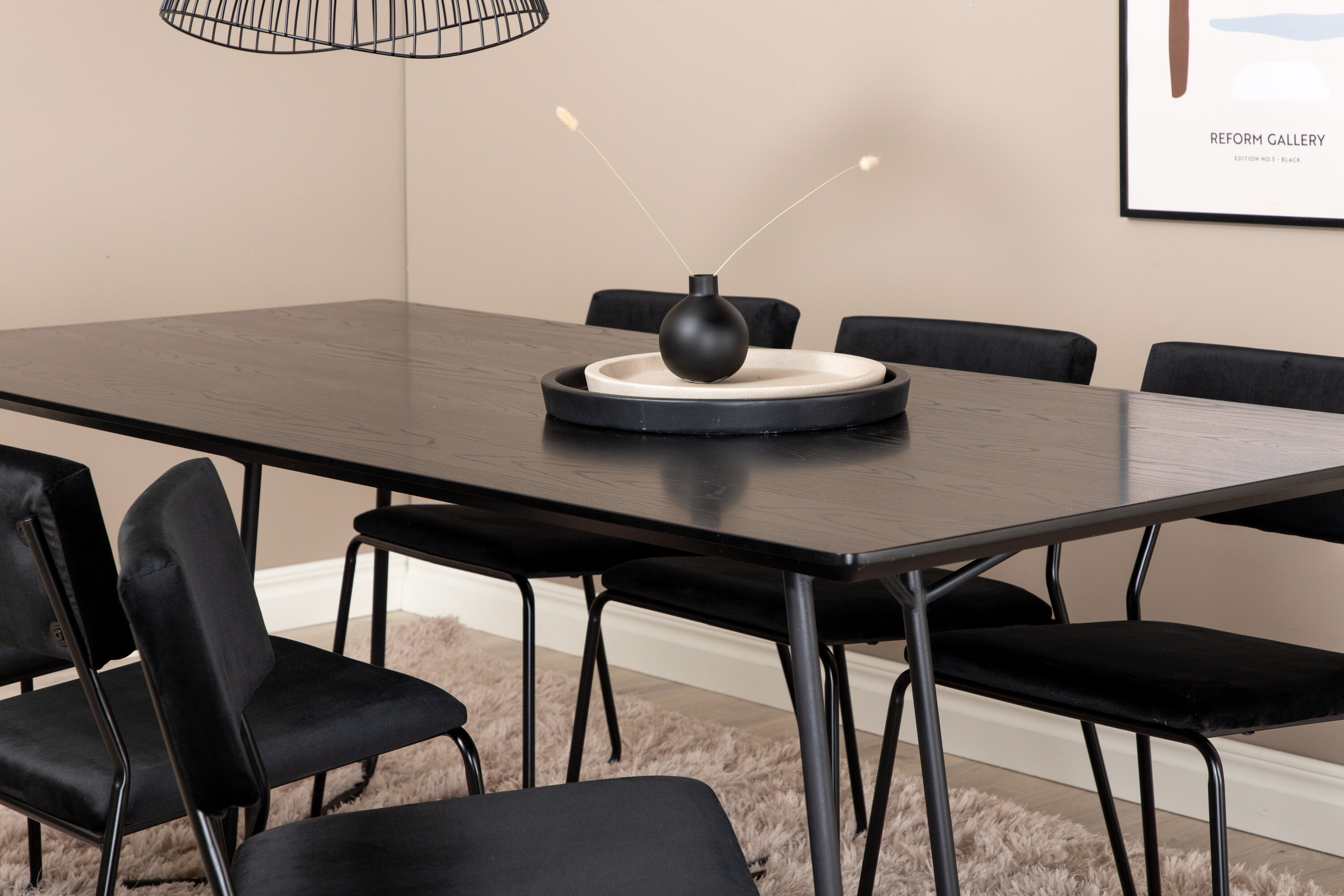 Kutsuv, stiilne ja ajatu – söögilaud Petra loob teie kodus moeteadliku mulje! Disain on hästi läbimõeldud skandinaavialike vormidega, mis annavad stiilse tunde, kitsad, kergelt laienevad rauast jalad ja mustast spooniga MDF-ist lauaplaat. Laua mõõdud: pikkus: 190 cm, laius: 90 cm, kõrgus: 75 cm. Siin sobib kokku 6 musta värvi Kenth söögitooli, millel on rauast toolijalad ja pehmest sametkangast istmed. Tooli mõõdud: kõrgus: 76 cm, istme kõrgus: 48,5 cm, laius: 40 cm, sügavus: 52 cm. Kaunistagu see pilkupüüdev toidugrupp kodu südant!