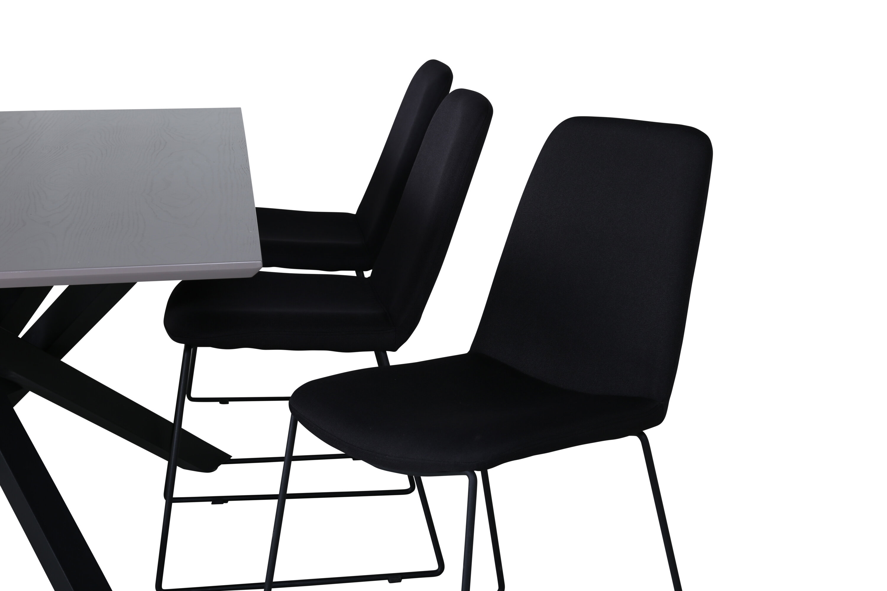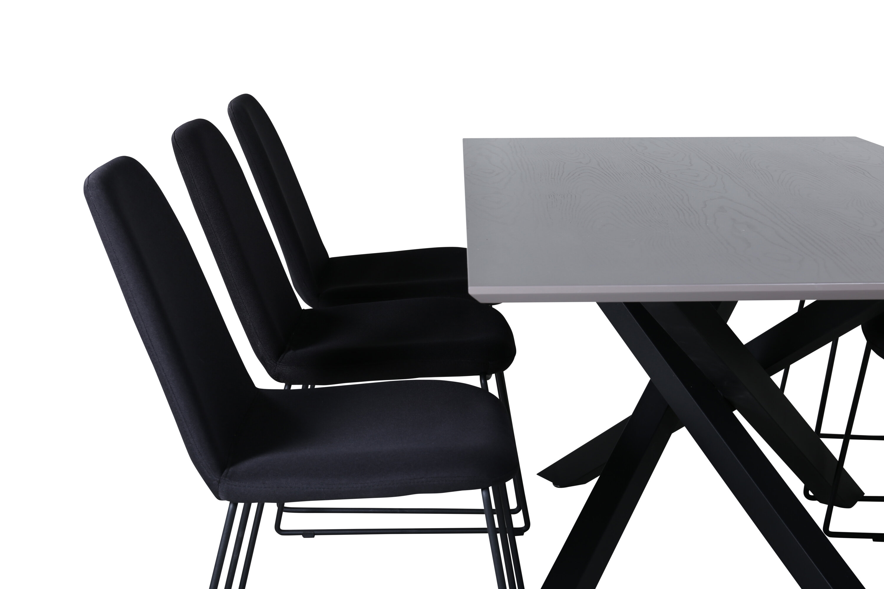 Piazza, meie populaarne ristkülikukujuline söögilaud, millel on luksuslik tunne ja trendikad detailid. Halli värvi lauaplaat on valmistatud MDF-st. Kere on hõrgu välimusega mustast rauast ristjalgadega, mis loovad ühtlase pilgupüüdja. Laua mõõdud: pikkus: 190 cm, laius: 90 cm, kõrgus: 76 cm. Siin sobib kokku 6 musta Muce söögitooli, mille kitsad raudjalad jätavad õhulise mulje ja pehme polüestrist iste tagab kõrge mugavuse. Tooli mõõdud: kõrgus: 84 cm, istme kõrgus: 47 cm, laius: 43 cm, sügavus: 63 cm. Sisustus kuldse serva jaoks igapäevaelus – koju tulles peaks olema mõnus tunne!