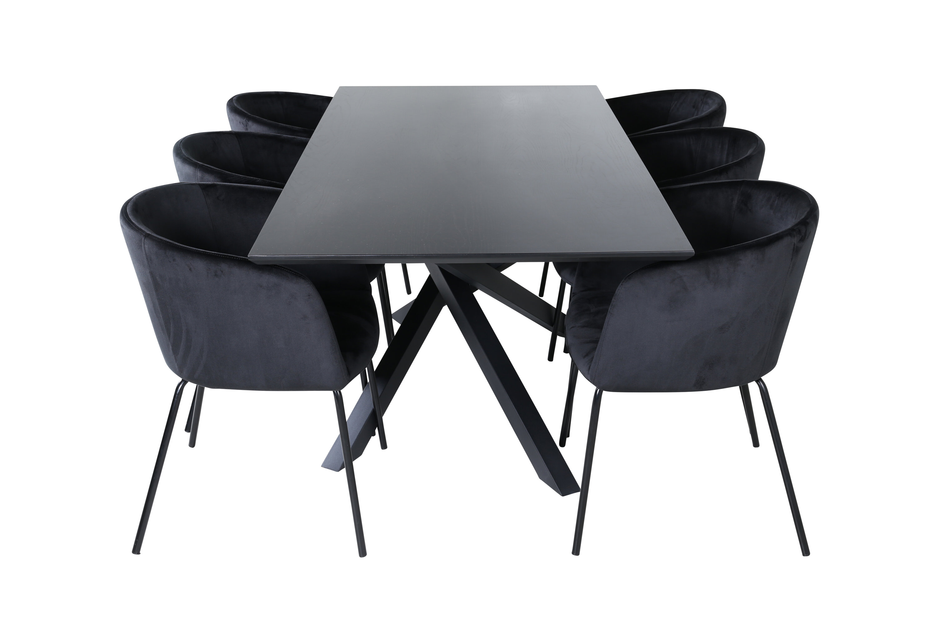 Trendikas toidugrupp, kus kõik on õiged! Piazza on meie populaarne ristkülikukujuline söögilaud, millel on luksuslik tunne ja trendikad detailid. Lauaplaat on valmistatud määrdunud musta värvi MDF spoonist ja korpus loob ühtlase pilgupüüdja mustast rauast ristjalgadega. Siin suurepärases kombinatsioonis meie elegantsete Beriti seeria söögitoolidega. Tool on luksusliku disainiga mustast sametkangast ja toolijalad on stiilselt kitsad mustast rauast. Sisustage kutsuvalt ja looge oma koju stiilne välimus!