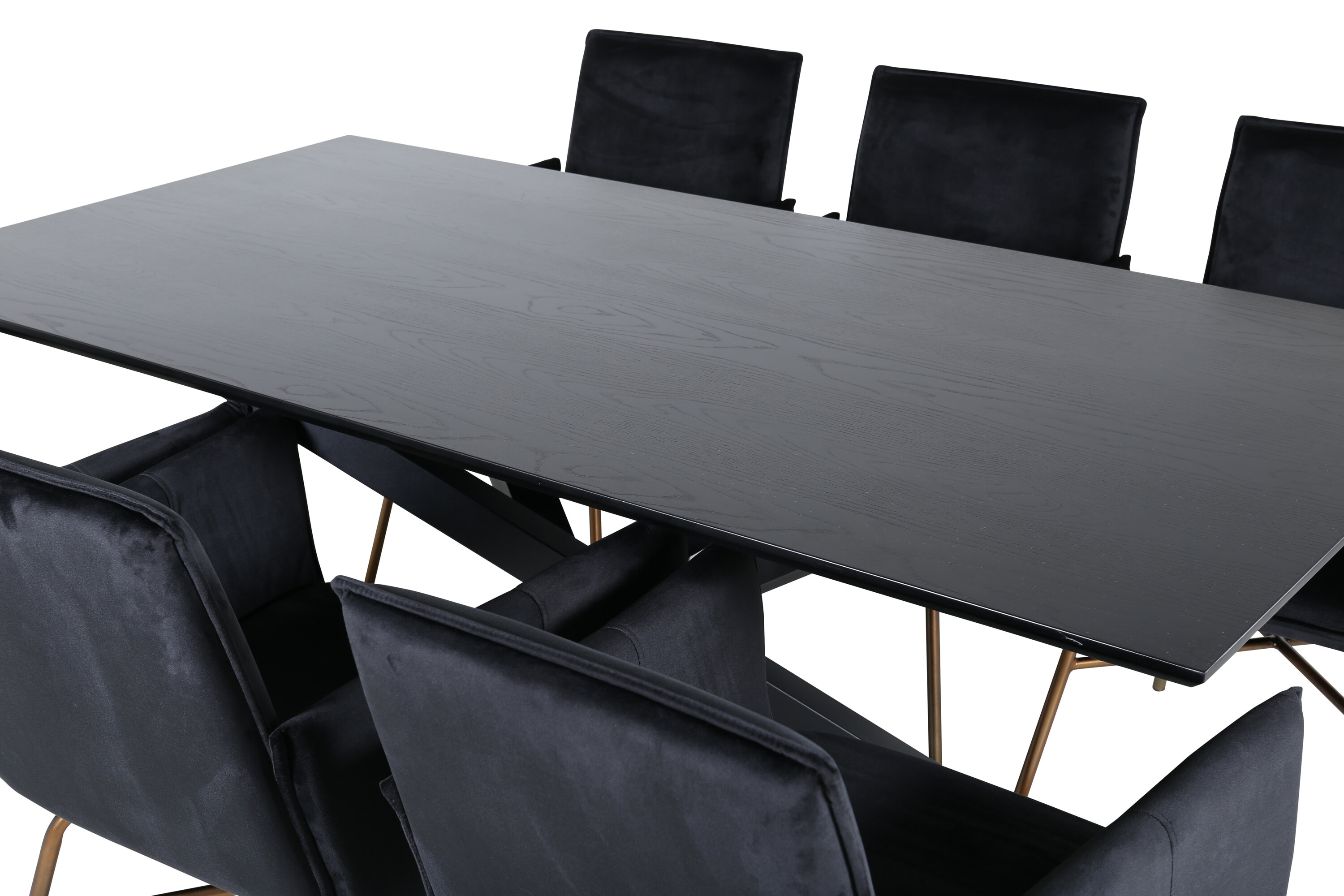 Stiilne, mugav ja elegantne – mida veel tahta? Piazza on meie populaarne ristkülikukujuline söögilaud, millel on luksuslik tunne ja trendikad detailid. Lauaplaat on valmistatud määrdunud musta värvi MDF spoonist ja korpus loob ühtlase pilgupüüdja mustast rauast ristjalgadega. Siin koos meie maitsvate söögitoolidega Petra. Toolidel on mugav istumissügavus, toolijalad on stiilselt kitsad vasevärvi rauast ja iste on mustast sametkangast, mis annab ruumile mõnusa läike. Nautige ees ootavaid mõnusaid eineid!