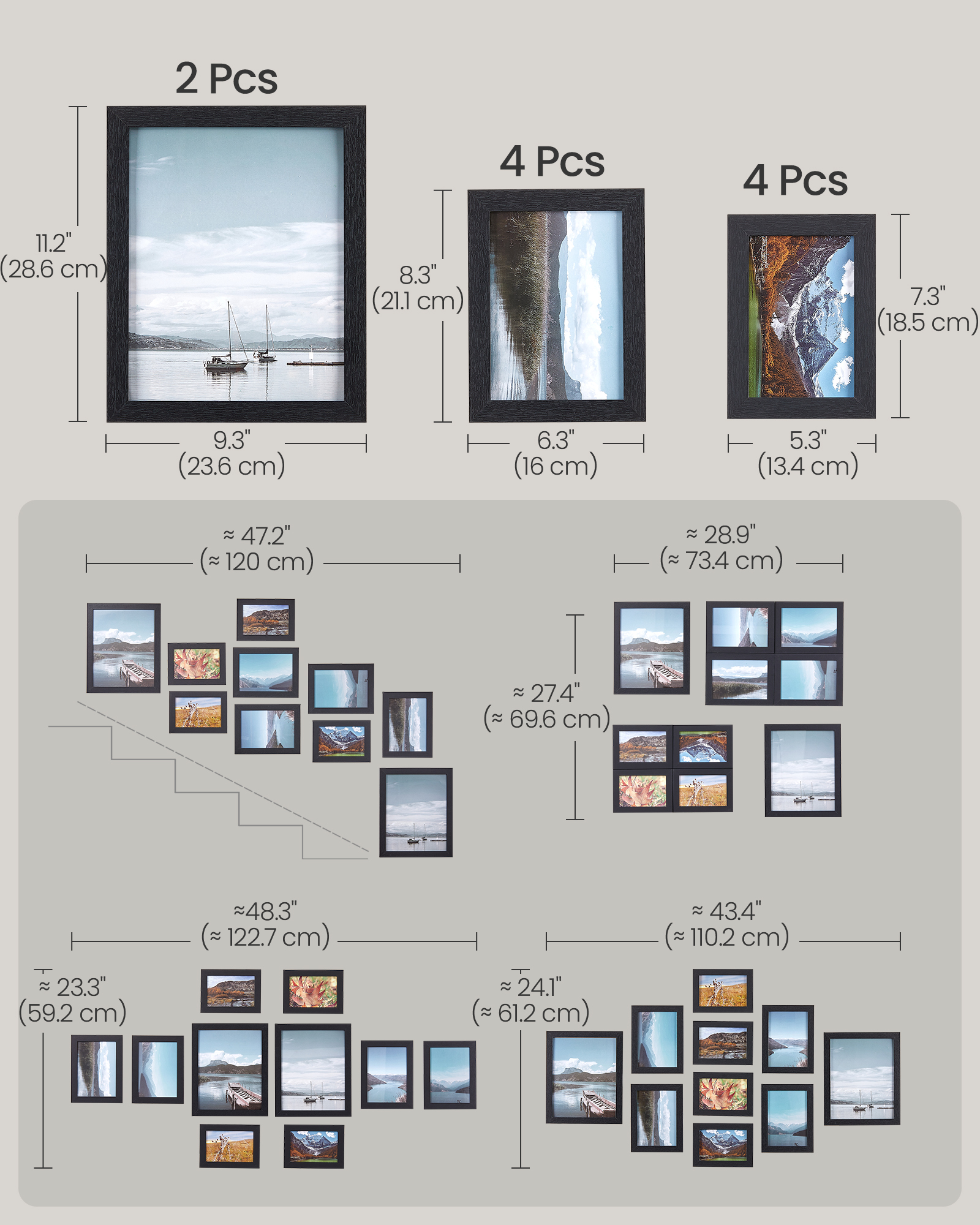 Spetsifikatsioonid: – Värvus: Must – Materjal: MDF (keskmise tihedusega puitkiudplaat), PS (polüstüreen) – Toote mõõdud: – 28,6×23,6cm – 21,1x16cm – 18,5×13,4cm – Sobiva pildi mõõdud: 20 x 25 cm, 13 x 18 cm, 10 x 15 cm – Avatud pildi mõõdud: 19,5 x 24,5 cm, 12 x 17 cm, 9,5 x 14,5 cm – Toote kogukaal: 2,9 kg Pakisisu: – 10 x pildiraami
