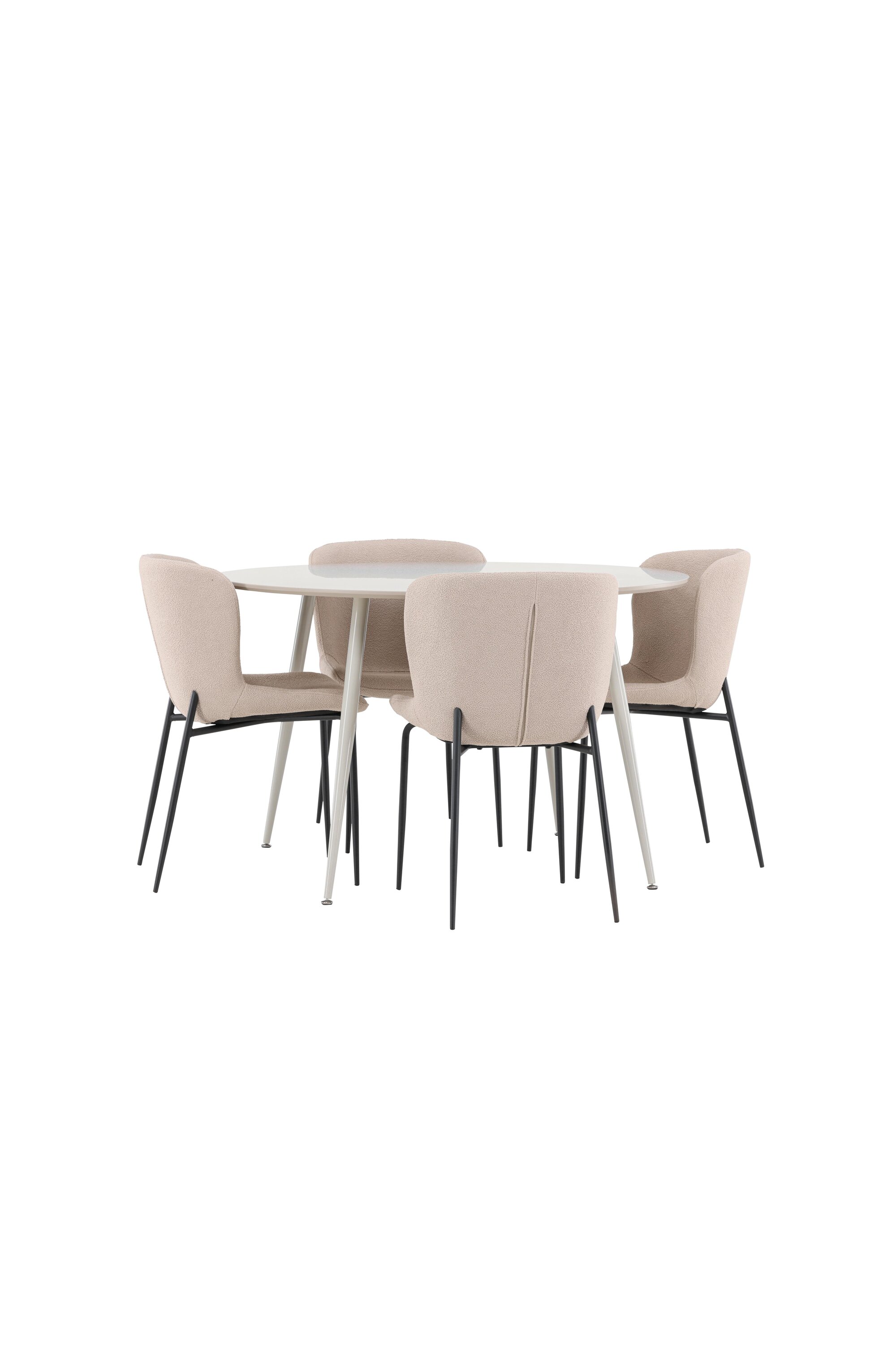 Looge elegantne ja kaasaegne söögituba meie keeruka söögikomplektiga, mis ühendab elegantse Plaza laua mugavate Modesto toolidega. See söögikomplekt, mis sobib ideaalselt nii igapäevaseks õhtusöögiks kui ka pidulikuks sündmuseks, annab teie söögitoale šiki ja kutsuva tunde. MDF-st valmistatud Plaza laud on helebeeži värviga, mis lisab pehmet ja harmoonilist atmosfääri. 120 cm läbimõõduga laud pakub rohkelt ruumi söögiks ja vestlusteks, ümar kuju loob aga tasakaalustatud ja kutsuva keskkonna. Laua tugev konstruktsioon tagab pikaajalise kasutamise ja stabiilsuse. Neli Modesto tooli täiendavad lauda suurepäraselt oma elegantsete valge polsterdatud istmete ja klanitud mustade jalgadega. Need toolid pakuvad nii mugavust kui ka stiili, muutes need ideaalseks pikkadeks ja nauditavateks eineteks pere ja sõpradega. Nende kaasaegne disain koos kõrgete seljatugede ja pehmete istmetega annab teie söögitoale rafineeritud ja kaasaegse ilme. See söögikomplekt on täiuslik segu esteetikast ja funktsionaalsusest, mistõttu on see suurepärane valik neile, kes otsivad elegantset ja mugavat söögituba. Täiustage oma söögituba Plaza laua ja Modesto toolide kombinatsiooniga ning looge koht, kus jagatakse mälestusi ja rõõmu.
