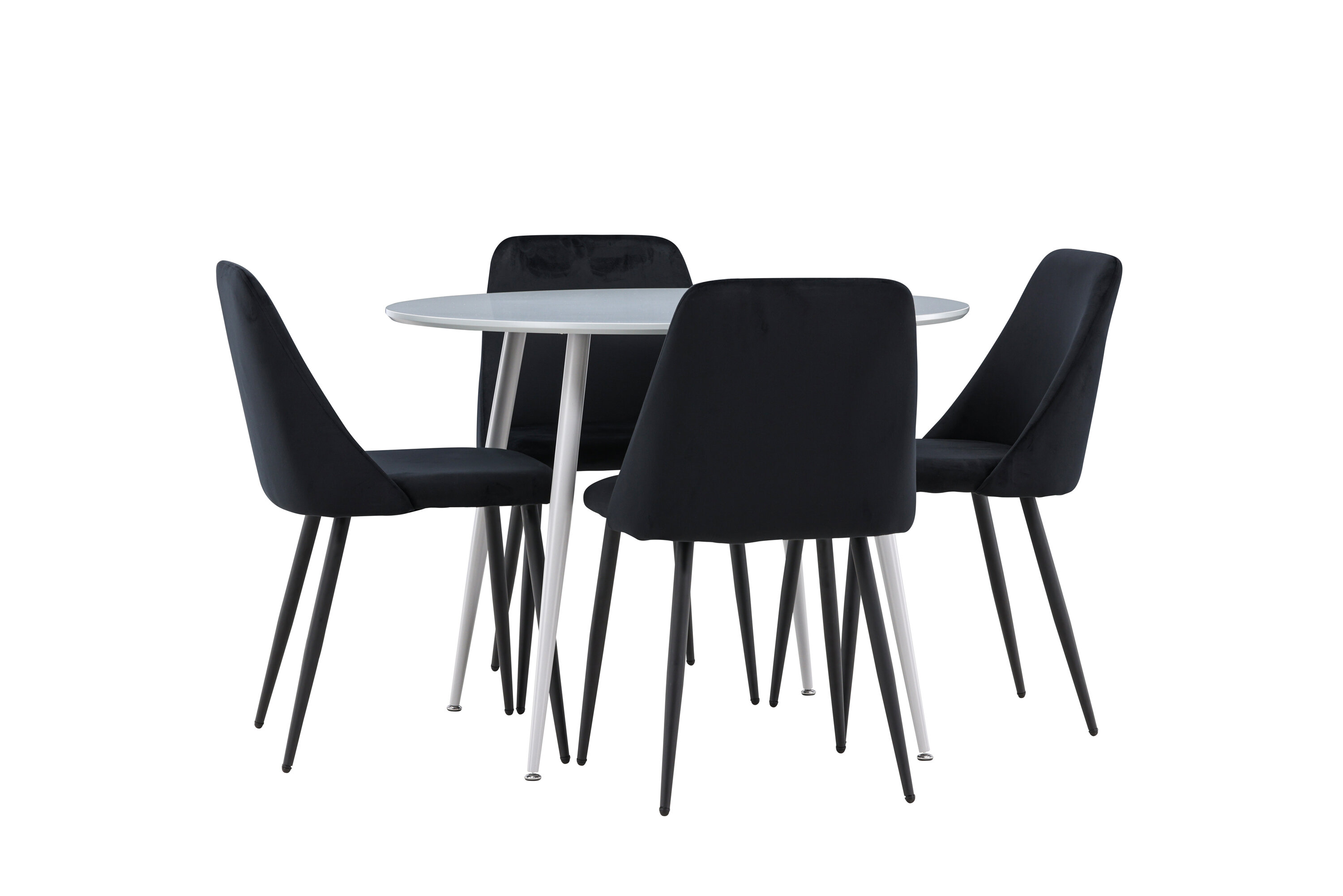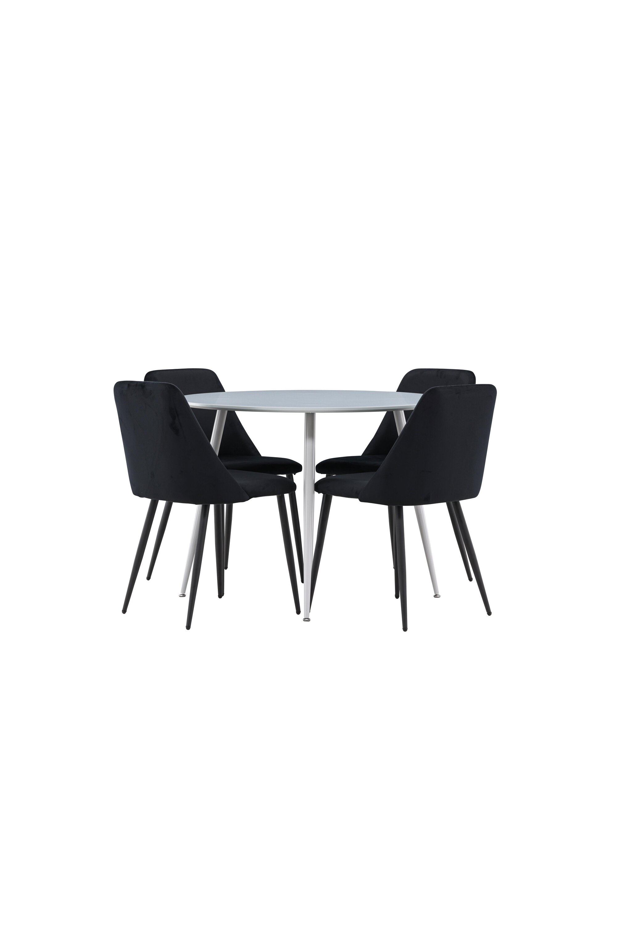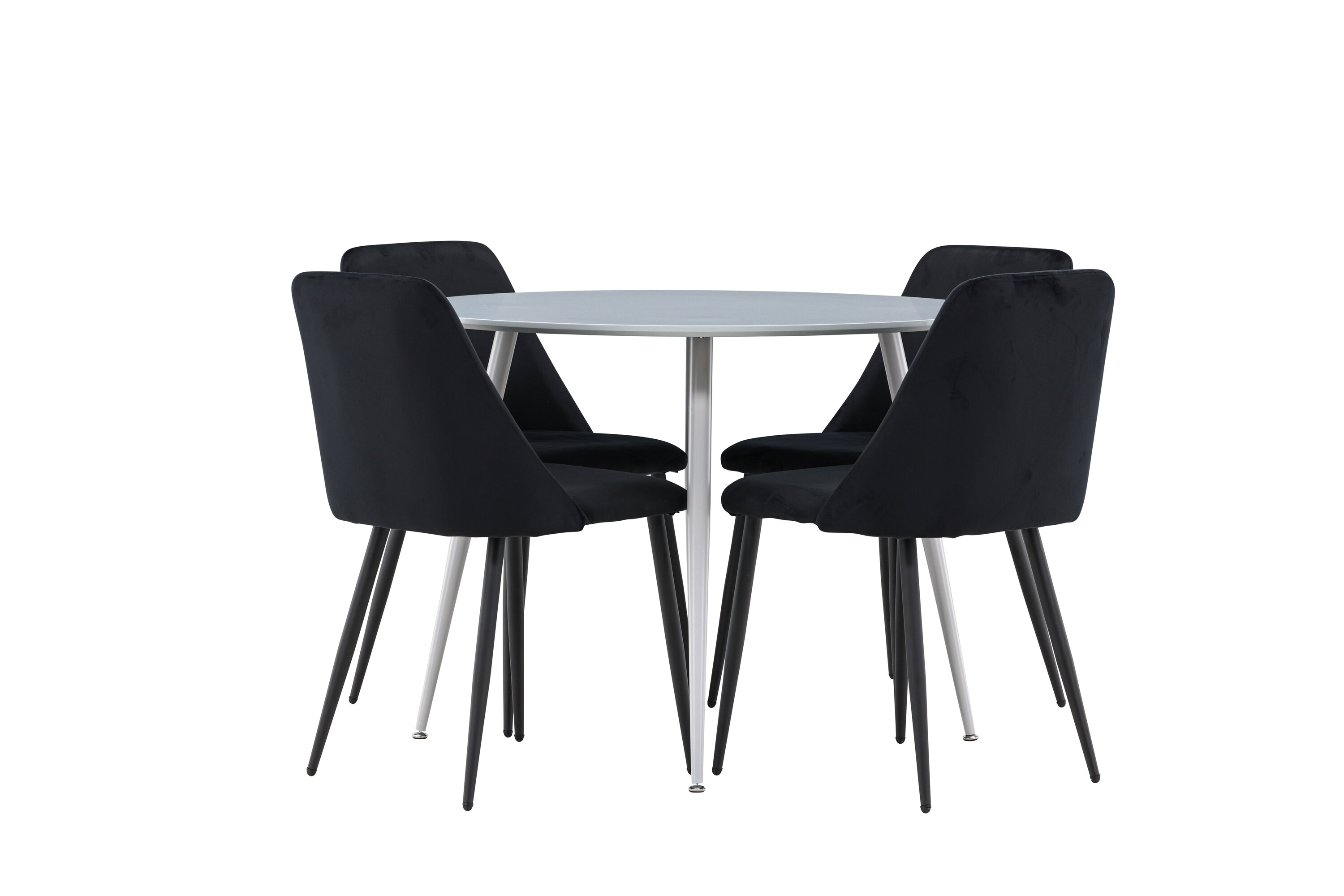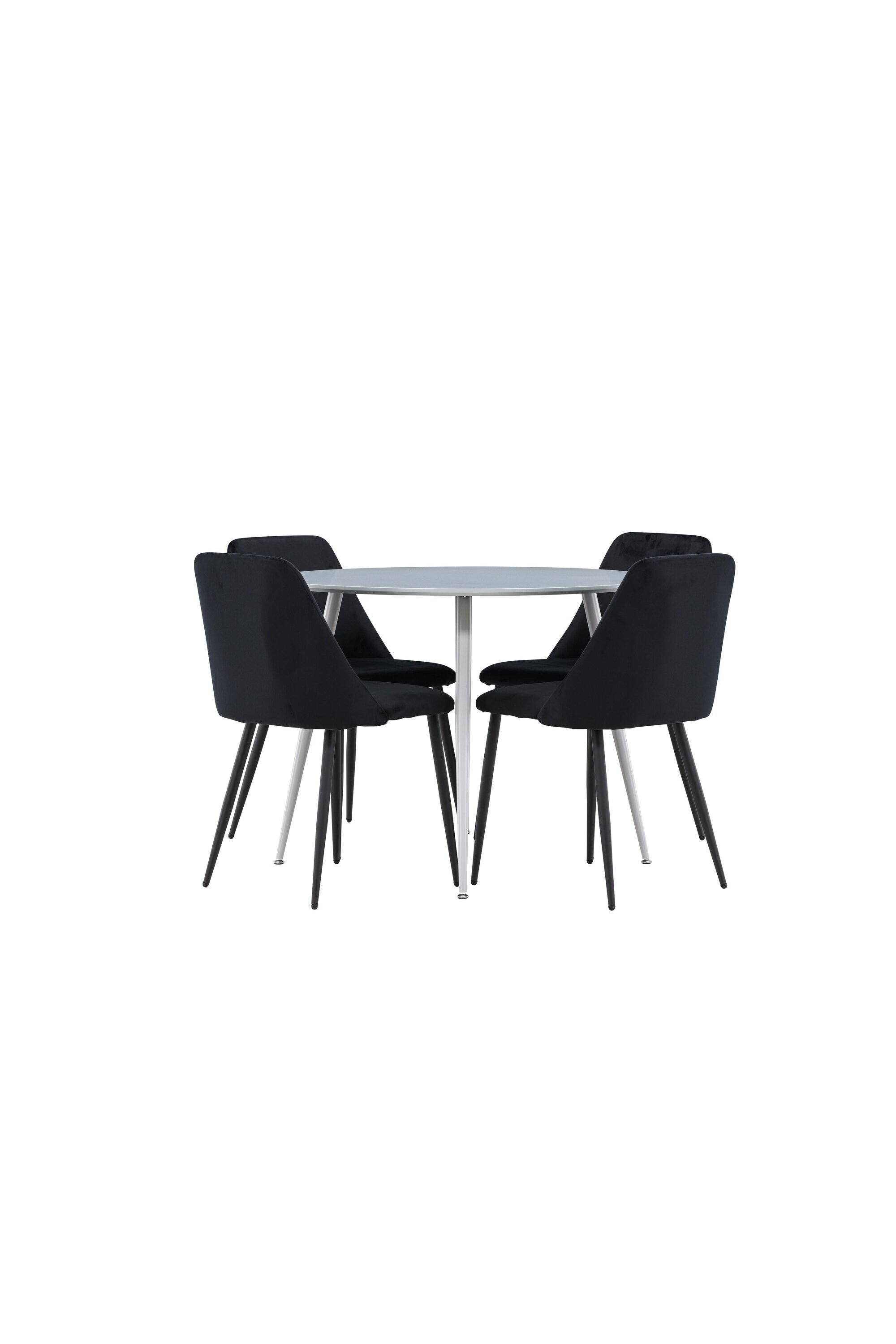 Anna oma söögitoale moodne elegants söögikomplektiga, mis koosneb Plaza lauast ja öötoolidest. See söögikomplekt pakub täiuslikku tasakaalu stiili ja mugavuse vahel ning on ideaalne täiendus teie koju. Plaza laud on oma halli värvi ja MDF-konstruktsiooniga peen keskosa. 100 cm läbimõõduga laud pakub piisavalt ruumi söögikordadeks ja seltskondlikeks koosviibimisteks, samas kui selle kompaktne suurus sobib ideaalselt nii väikesesse kui ka suurde ruumi. Hall varjund lisab teie söögitoale modernset ja elegantset hõngu ning vastupidavat pinda on lihtne puhastada ja hooldada, tagades kauakestva ilu ja funktsionaalsuse. Kaasas olevad neli Night tooli täiendavad lauda suurepäraselt oma elegantse disaini ja kõrge mugavusega. Toolid on polsterdatud musta sametiga, pakkudes pehmet ja kutsuvat istumiskogemust. Sametkangas on tuntud oma elegantsi ja mugavuse poolest, võimaldades teil ja teie külalistel pikkade einete ja meeldivate vestluste ajal mugavalt istuda. Mustad toolid loovad halli laua taustal stiilse kontrasti, andes teie söögitoale kaasaegse ja peene atmosfääri. Öötoolidega söögikomplekt Plaza on ideaalne valik neile, kes soovivad luua elegantse ja funktsionaalse söögikeskkonna. Moodsa disaini ja kõrge mugavuse kombinatsioon muudab iga toidukorra nauditavaks kogemuseks. Tere tulemast uuele stiili ja mugavuse tasemele oma kodus koos Plaza and Nightiga!