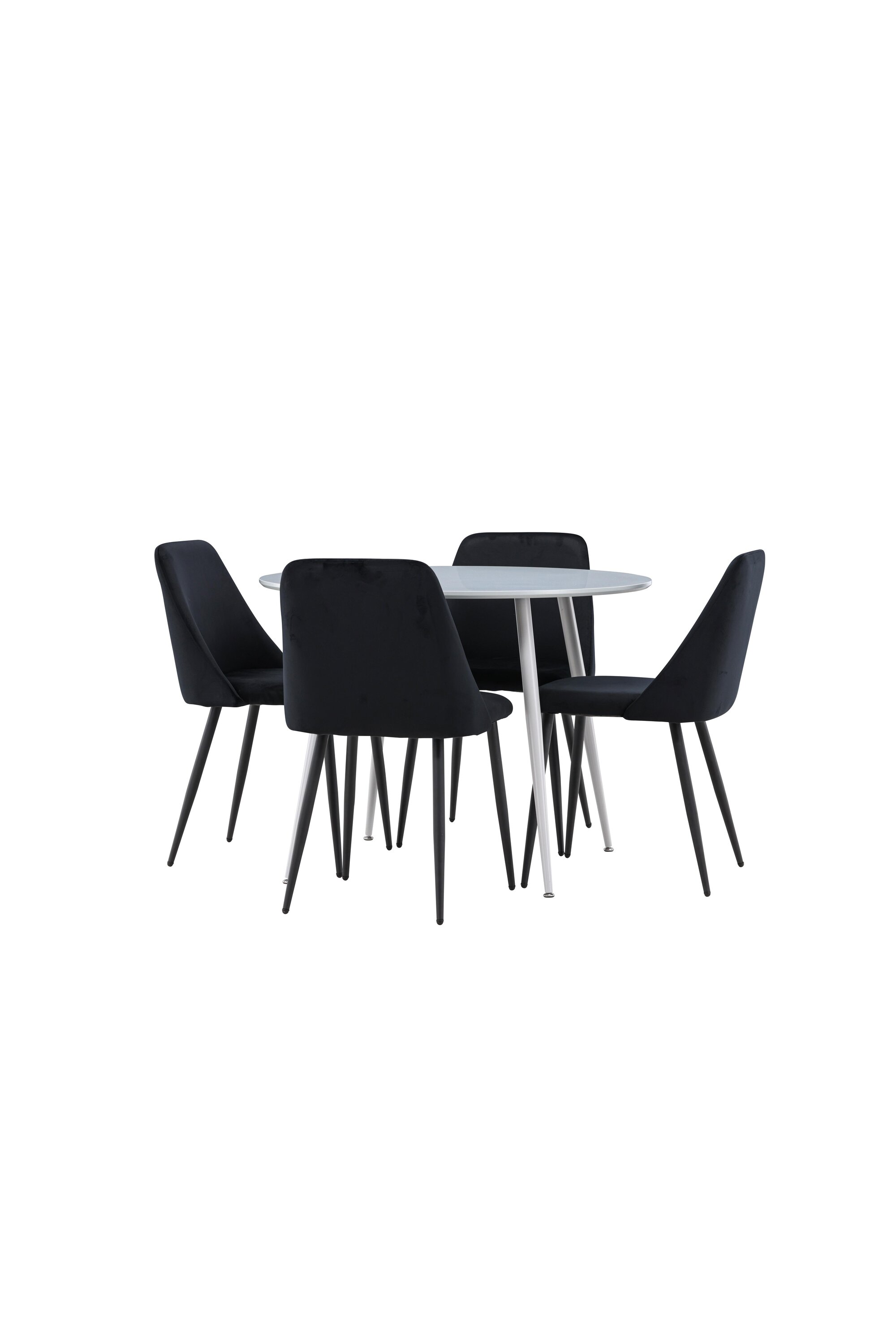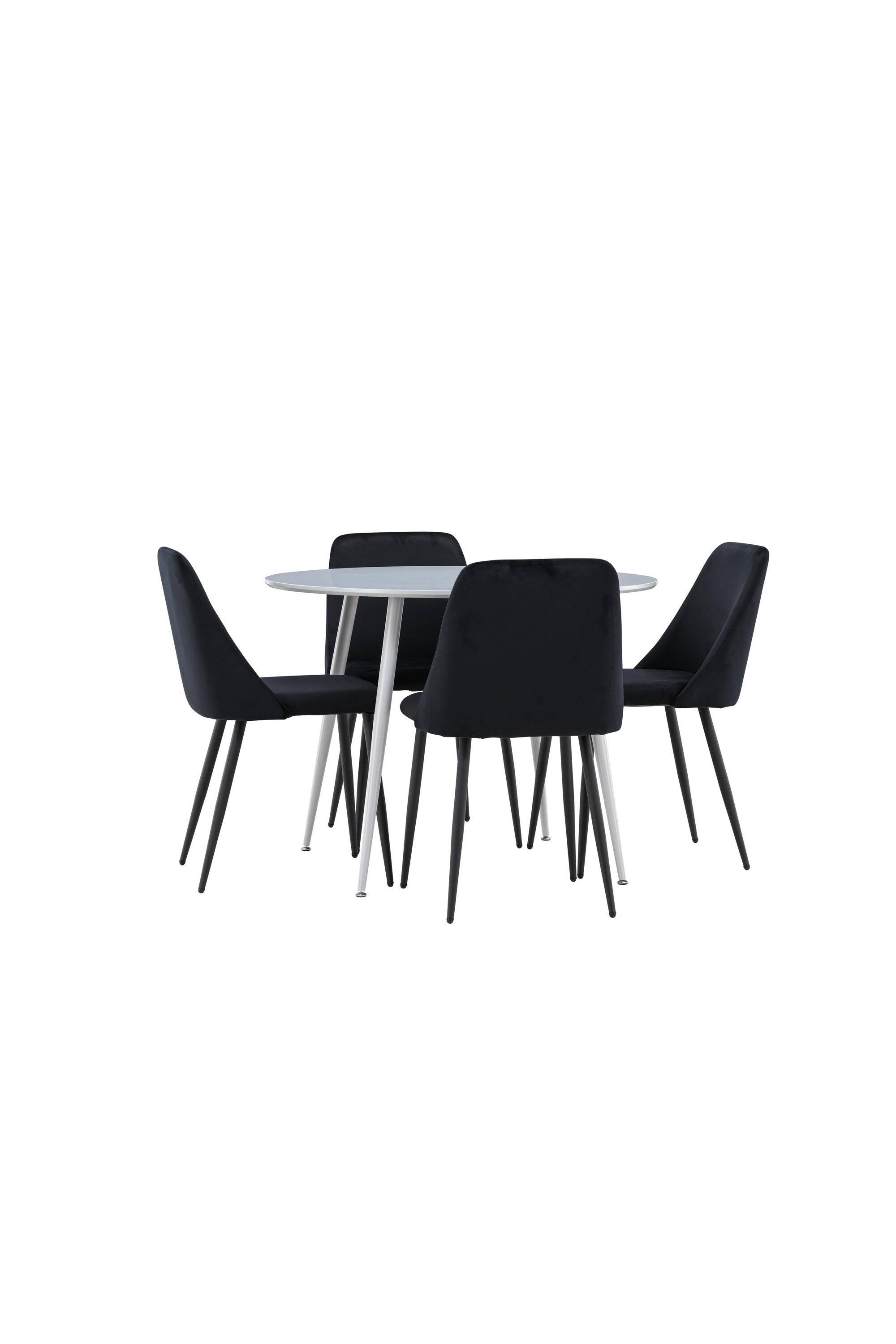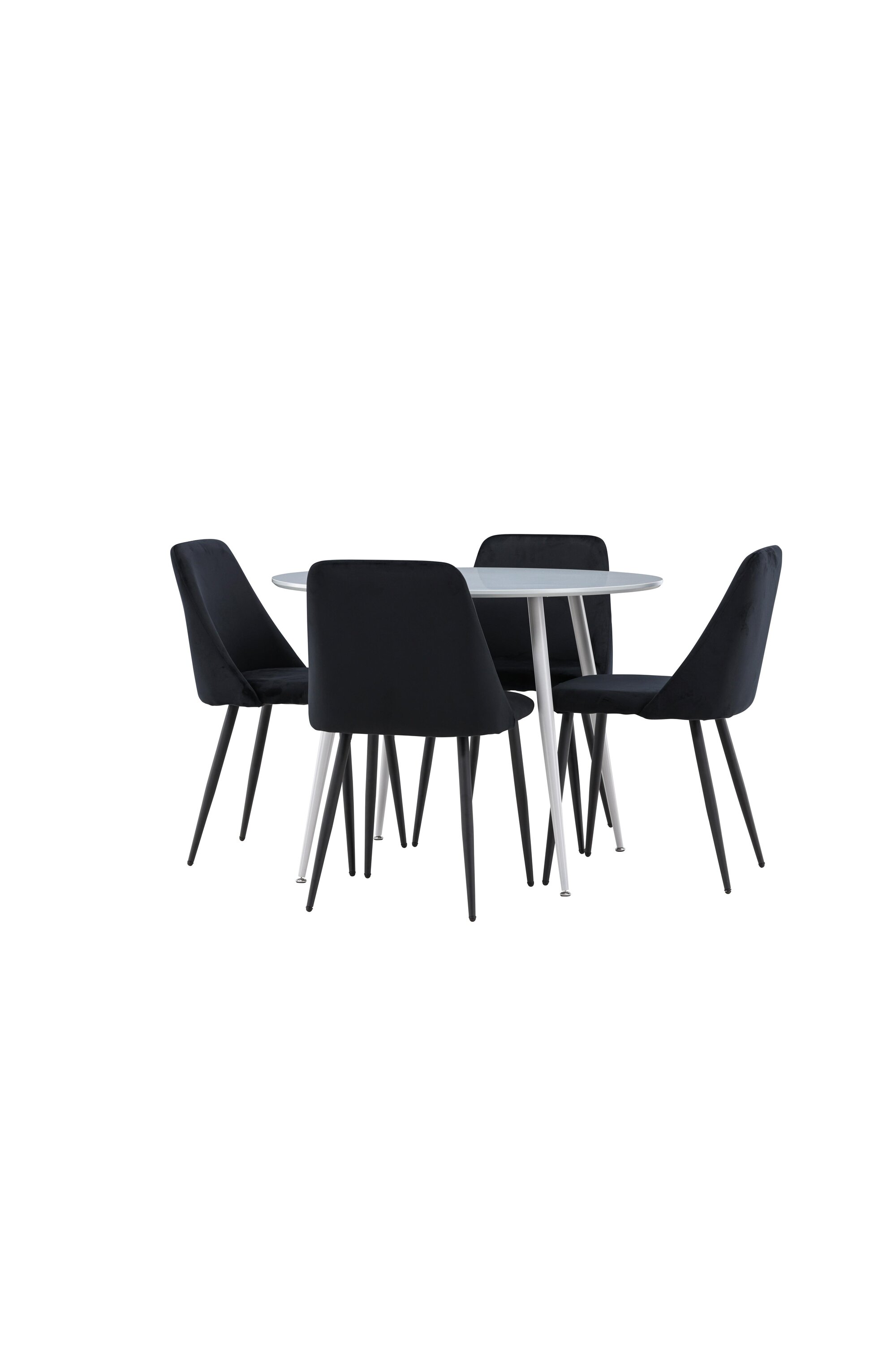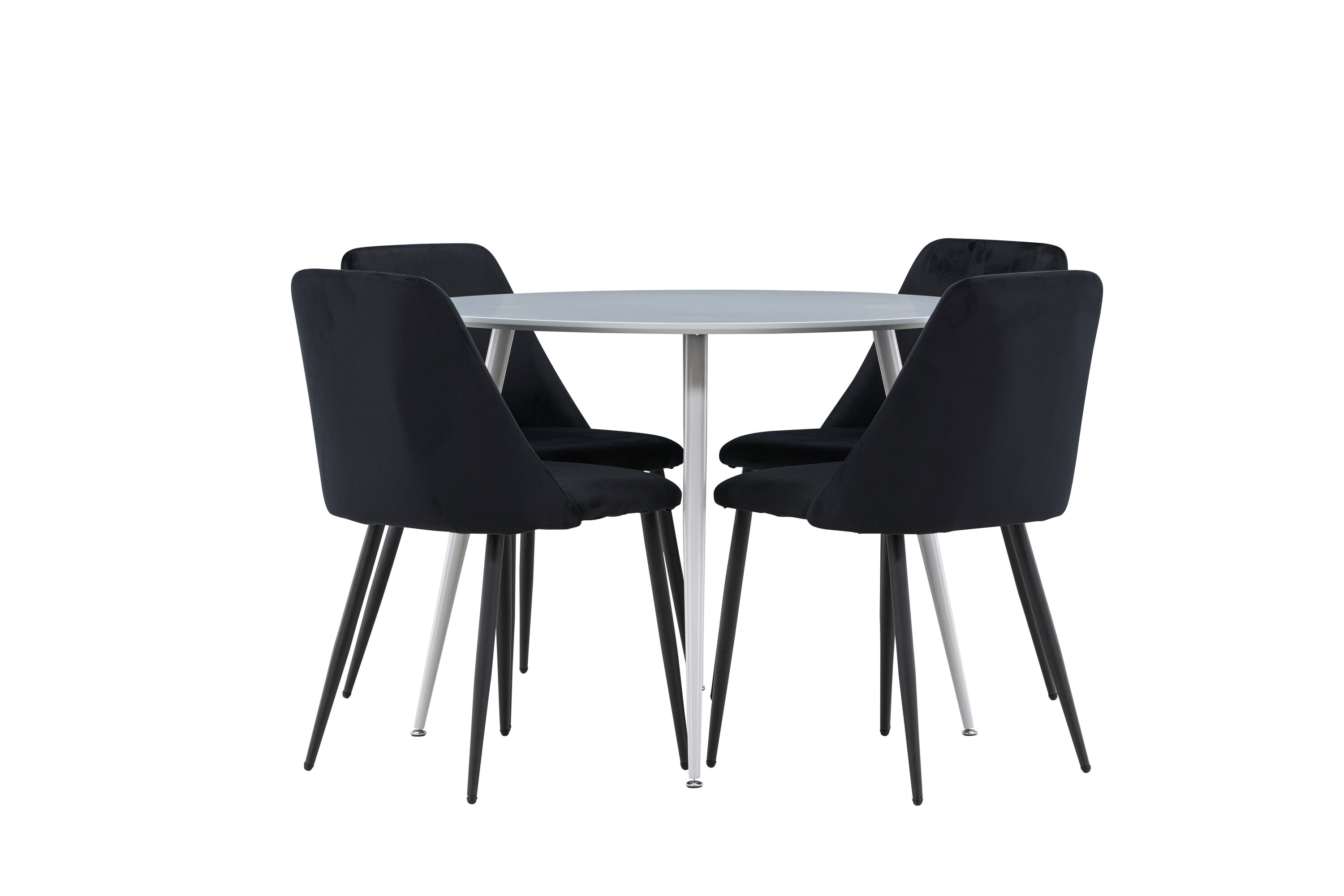 Anna oma söögitoale moodne elegants söögikomplektiga, mis koosneb Plaza lauast ja öötoolidest. See söögikomplekt pakub täiuslikku tasakaalu stiili ja mugavuse vahel ning on ideaalne täiendus teie koju. Plaza laud on oma halli värvi ja MDF-konstruktsiooniga peen keskosa. 100 cm läbimõõduga laud pakub piisavalt ruumi söögikordadeks ja seltskondlikeks koosviibimisteks, samas kui selle kompaktne suurus sobib ideaalselt nii väikesesse kui ka suurde ruumi. Hall varjund lisab teie söögitoale modernset ja elegantset hõngu ning vastupidavat pinda on lihtne puhastada ja hooldada, tagades kauakestva ilu ja funktsionaalsuse. Kaasas olevad neli Night tooli täiendavad lauda suurepäraselt oma elegantse disaini ja kõrge mugavusega. Toolid on polsterdatud musta sametiga, pakkudes pehmet ja kutsuvat istumiskogemust. Sametkangas on tuntud oma elegantsi ja mugavuse poolest, võimaldades teil ja teie külalistel pikkade einete ja meeldivate vestluste ajal mugavalt istuda. Mustad toolid loovad halli laua taustal stiilse kontrasti, andes teie söögitoale kaasaegse ja peene atmosfääri. Öötoolidega söögikomplekt Plaza on ideaalne valik neile, kes soovivad luua elegantse ja funktsionaalse söögikeskkonna. Moodsa disaini ja kõrge mugavuse kombinatsioon muudab iga toidukorra nauditavaks kogemuseks. Tere tulemast uuele stiili ja mugavuse tasemele oma kodus koos Plaza and Nightiga!