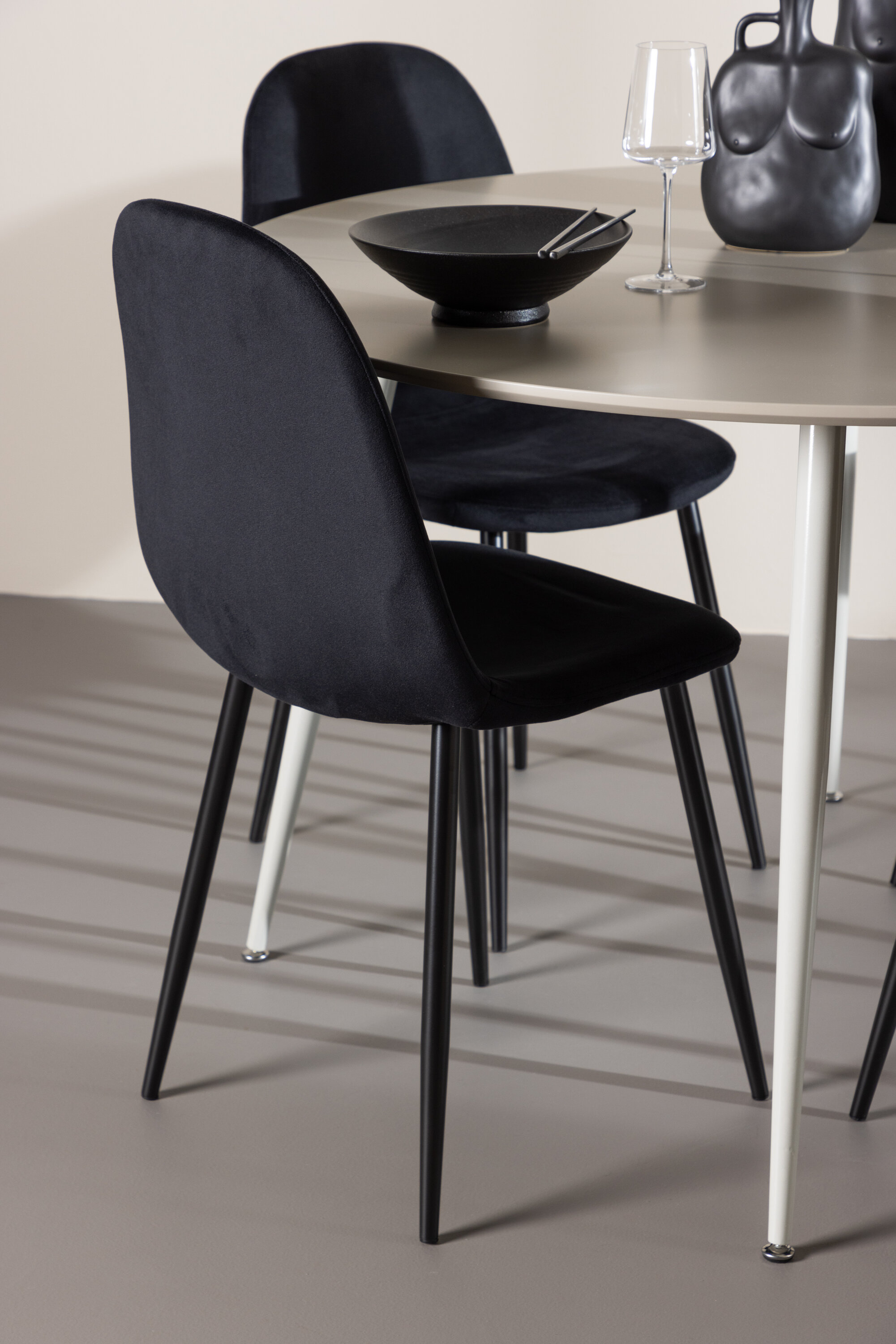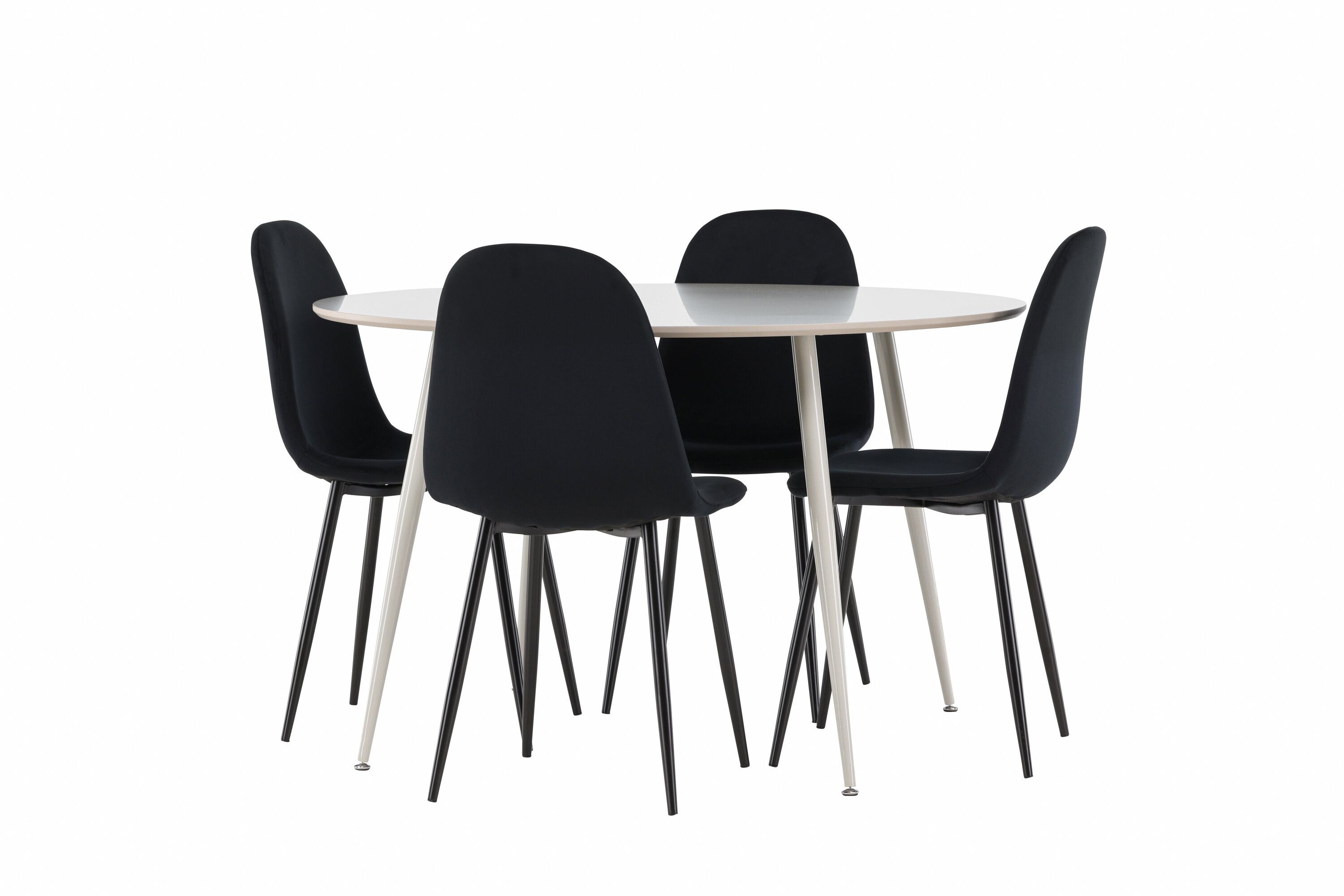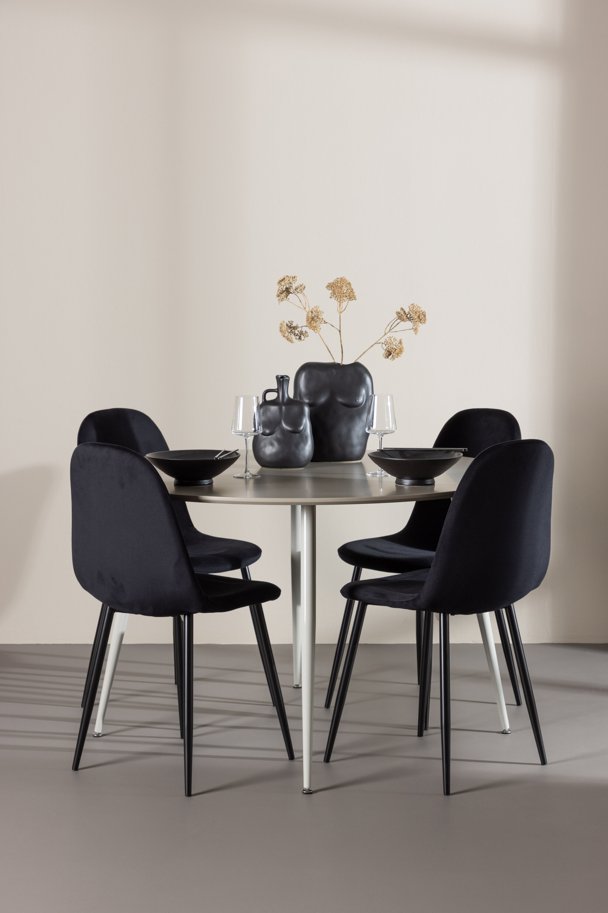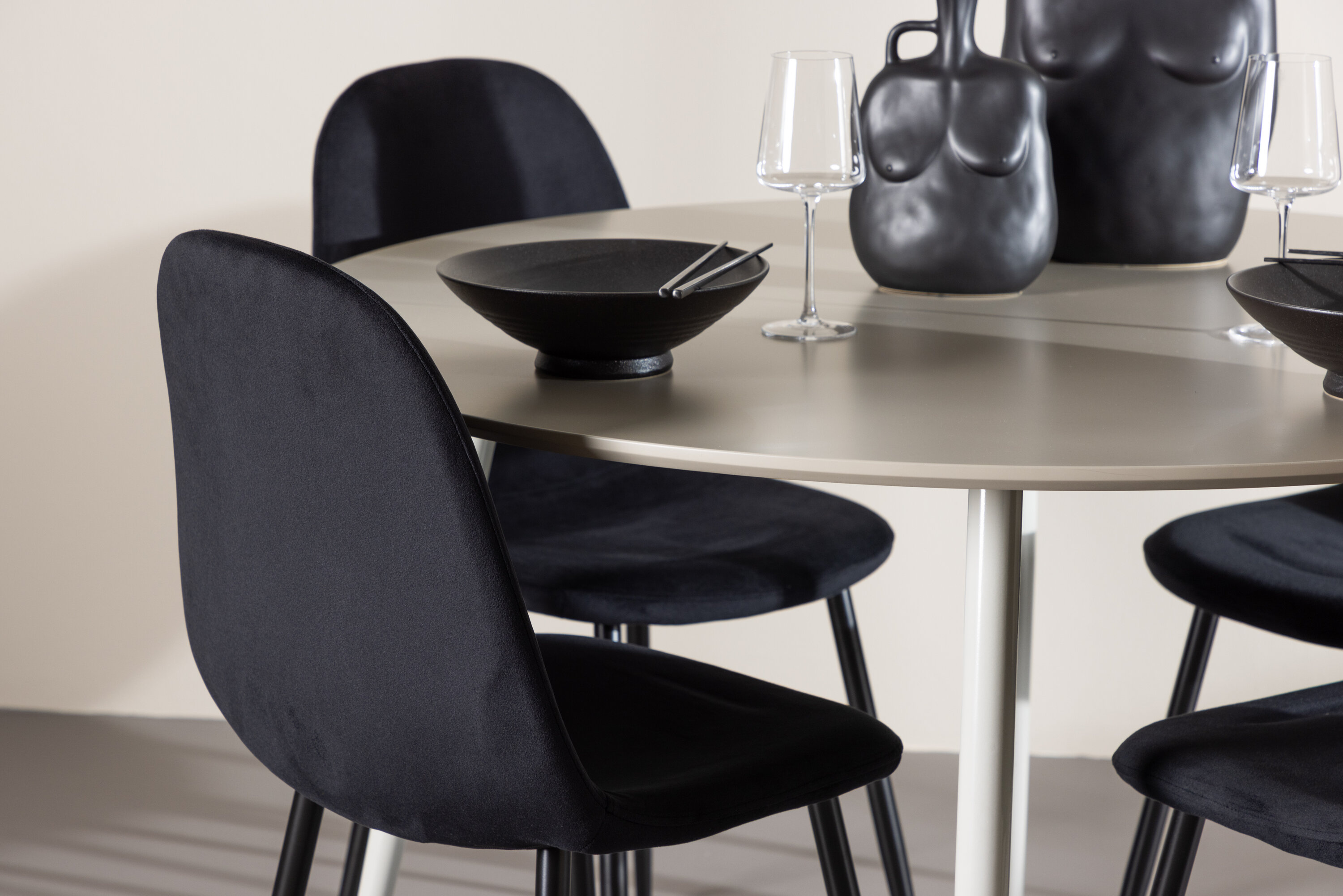 Looge elegantne ja kutsuv söögituba meie keeruka söögikomplektiga, mis ühendab elegantse Plaza laua luksuslike Polari toolidega. See söögikomplekt sobib suurepäraselt nii igapäevasteks õhtusöökideks kui ka pidulikeks sündmusteks, andes teie söögitoale kaasaegse ja peene tunde. MDF-st valmistatud Plaza laud on helebeeži värvi, mis lisab teie söögituppa pehme ja harmoonilise atmosfääri. Rikkaliku 120 cm läbimõõduga laud pakub rohkelt ruumi söögiks ja vestlusteks, samas kui selle ümar kuju loob tasakaalustatud ja kutsuva keskkonna. Laua tugev konstruktsioon tagab pikaajalise kasutamise ja stabiilsuse. Neli Polari tooli täiendavad lauda suurepäraselt oma elegantsete musta sametiga polsterdatud istmetega. Need toolid pakuvad nii mugavust kui ka stiili, muutes need ideaalseks pikkadeks ja nauditavateks eineteks pere ja sõpradega. Nende kaasaegne disain koos kõrgete seljatugede ja pehmete istmetega annab teie söögitoale rafineeritud ja kaasaegse ilme. See söögikomplekt on täiuslik segu esteetikast ja funktsionaalsusest, mistõttu on see suurepärane valik neile, kes otsivad elegantset ja mugavat söögituba. Täiustage oma söögituba Plaza laua ja Polari toolide stiilse kombinatsiooniga ning looge koht, kus jagatakse mälestusi ja rõõmu.