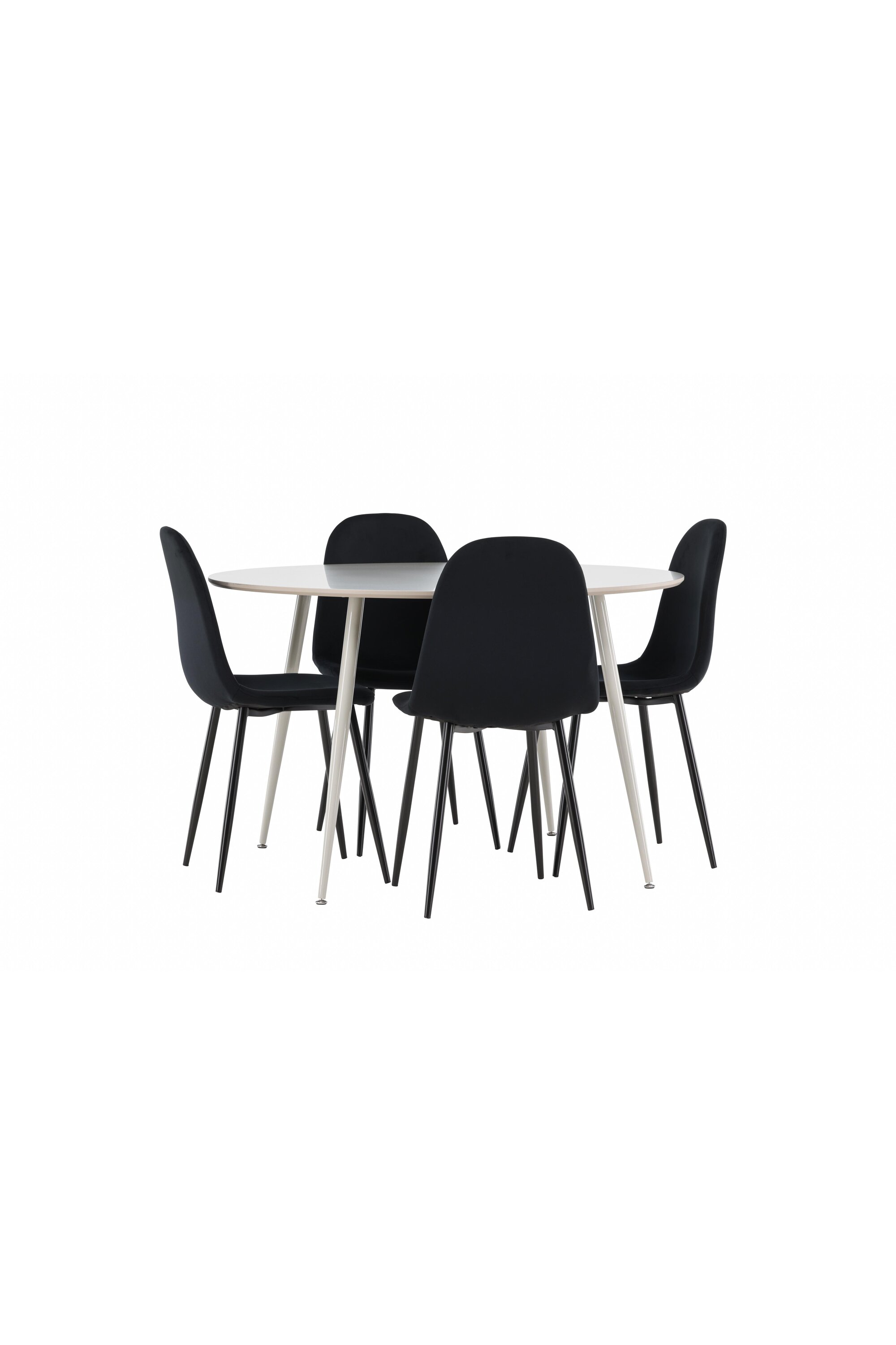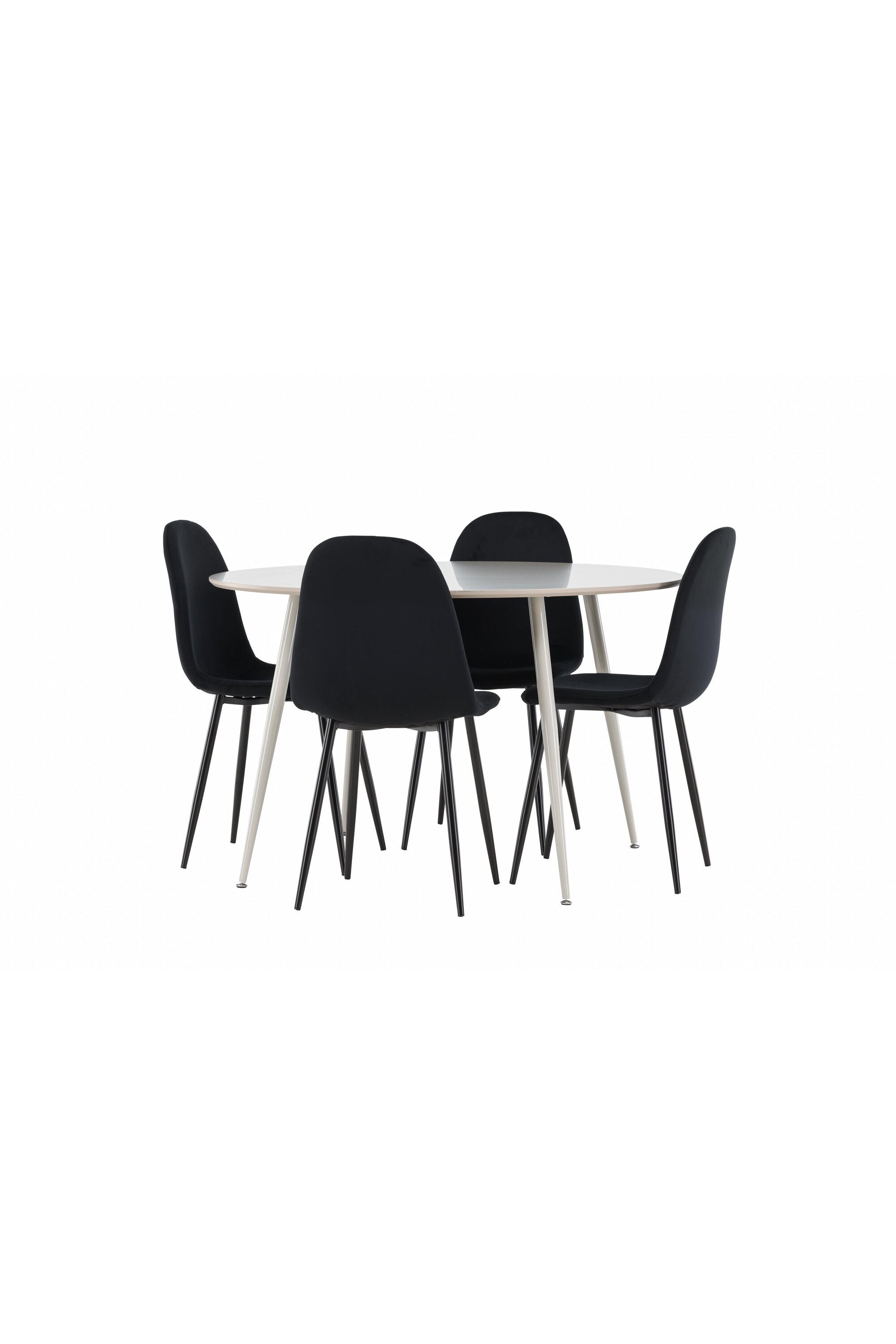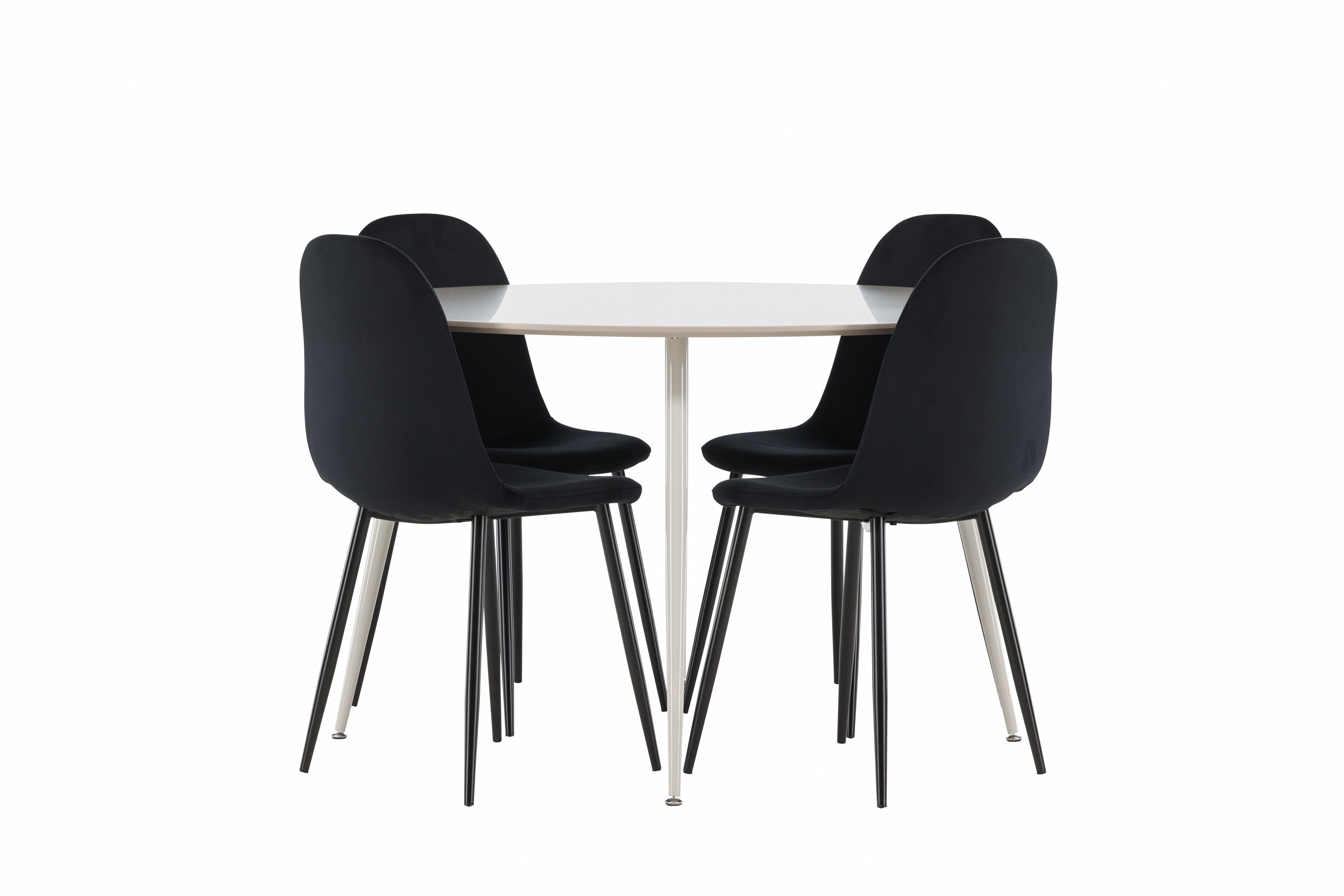 Looge elegantne ja kutsuv söögituba meie keeruka söögikomplektiga, mis ühendab elegantse Plaza laua luksuslike Polari toolidega. See söögikomplekt sobib suurepäraselt nii igapäevasteks õhtusöökideks kui ka pidulikeks sündmusteks, andes teie söögitoale kaasaegse ja peene tunde. MDF-st valmistatud Plaza laud on helebeeži värvi, mis lisab teie söögituppa pehme ja harmoonilise atmosfääri. Rikkaliku 120 cm läbimõõduga laud pakub rohkelt ruumi söögiks ja vestlusteks, samas kui selle ümar kuju loob tasakaalustatud ja kutsuva keskkonna. Laua tugev konstruktsioon tagab pikaajalise kasutamise ja stabiilsuse. Neli Polari tooli täiendavad lauda suurepäraselt oma elegantsete musta sametiga polsterdatud istmetega. Need toolid pakuvad nii mugavust kui ka stiili, muutes need ideaalseks pikkadeks ja nauditavateks eineteks pere ja sõpradega. Nende kaasaegne disain koos kõrgete seljatugede ja pehmete istmetega annab teie söögitoale rafineeritud ja kaasaegse ilme. See söögikomplekt on täiuslik segu esteetikast ja funktsionaalsusest, mistõttu on see suurepärane valik neile, kes otsivad elegantset ja mugavat söögituba. Täiustage oma söögituba Plaza laua ja Polari toolide stiilse kombinatsiooniga ning looge koht, kus jagatakse mälestusi ja rõõmu.