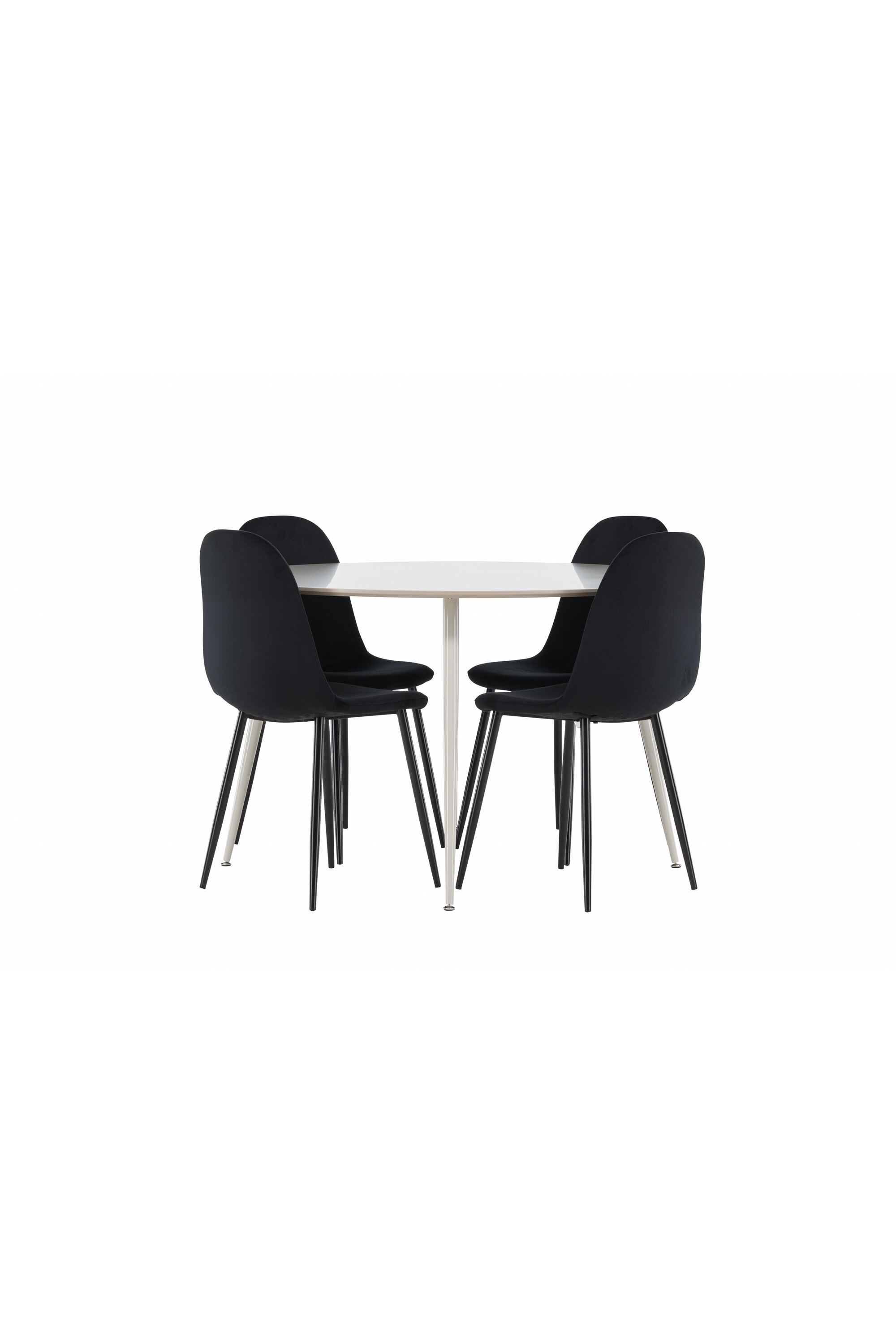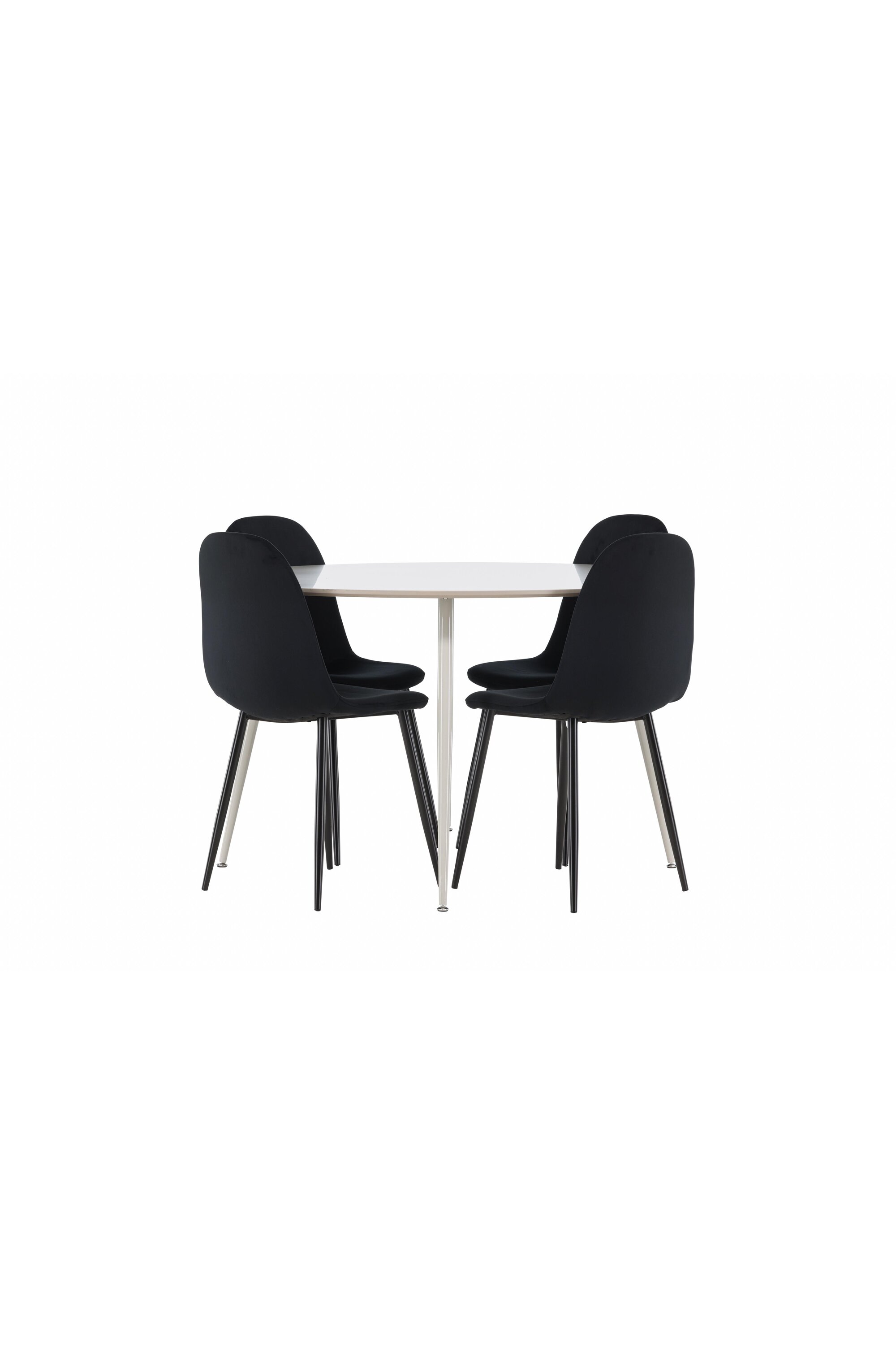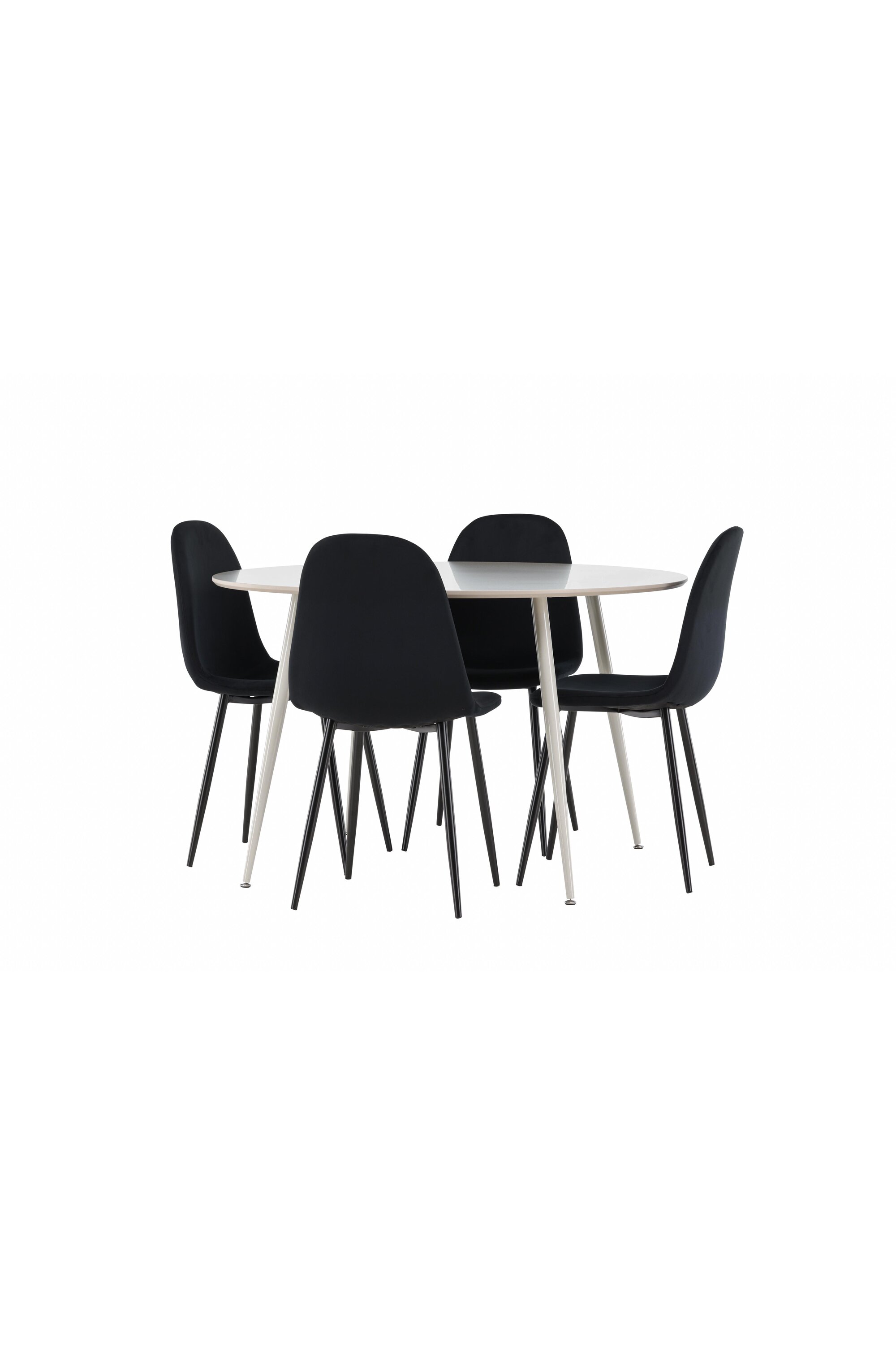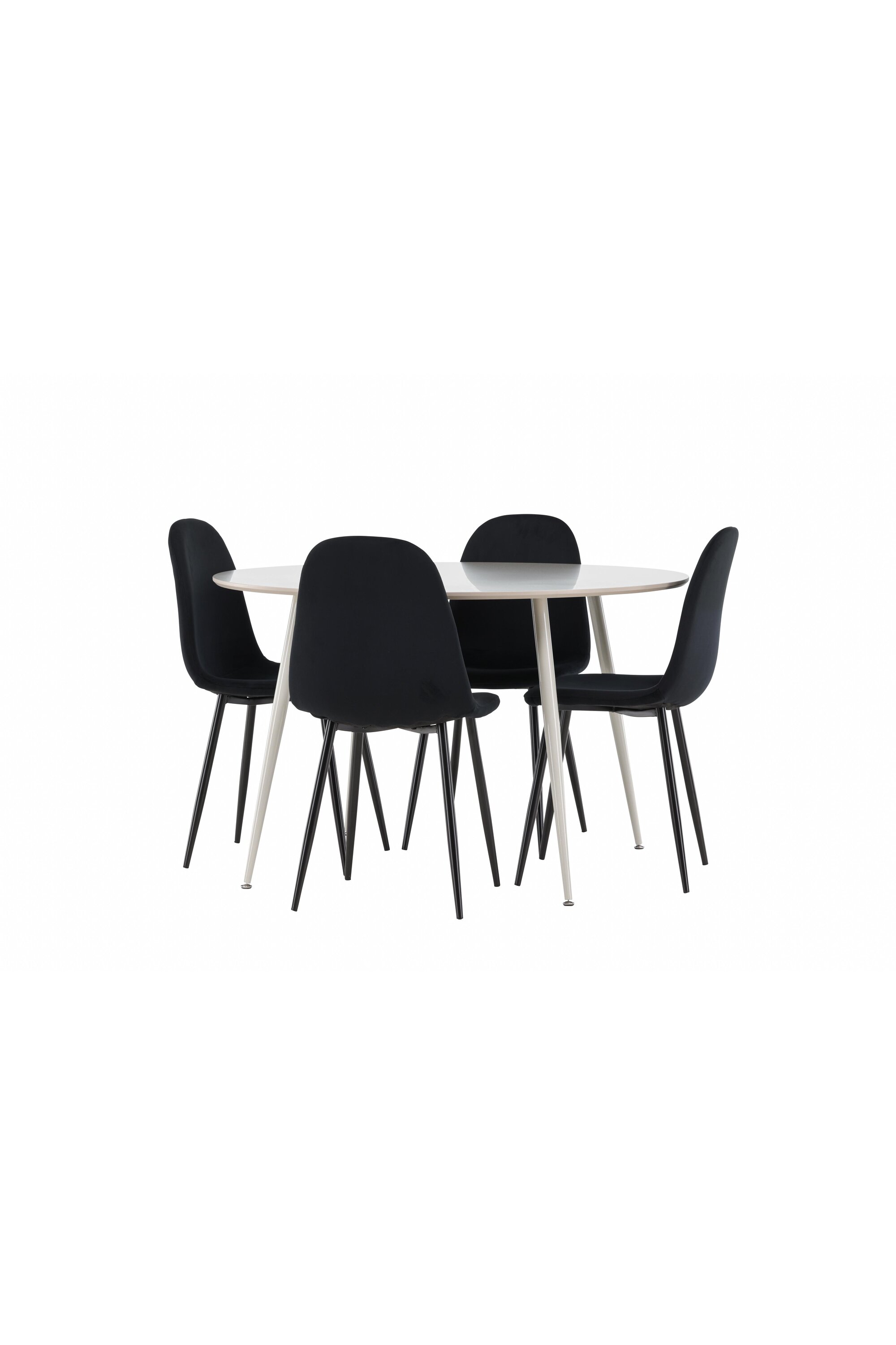 Looge elegantne ja kutsuv söögituba meie keeruka söögikomplektiga, mis ühendab elegantse Plaza laua luksuslike Polari toolidega. See söögikomplekt sobib suurepäraselt nii igapäevasteks õhtusöökideks kui ka pidulikeks sündmusteks, andes teie söögitoale kaasaegse ja peene tunde. MDF-st valmistatud Plaza laud on helebeeži värvi, mis lisab teie söögituppa pehme ja harmoonilise atmosfääri. Rikkaliku 120 cm läbimõõduga laud pakub rohkelt ruumi söögiks ja vestlusteks, samas kui selle ümar kuju loob tasakaalustatud ja kutsuva keskkonna. Laua tugev konstruktsioon tagab pikaajalise kasutamise ja stabiilsuse. Neli Polari tooli täiendavad lauda suurepäraselt oma elegantsete musta sametiga polsterdatud istmetega. Need toolid pakuvad nii mugavust kui ka stiili, muutes need ideaalseks pikkadeks ja nauditavateks eineteks pere ja sõpradega. Nende kaasaegne disain koos kõrgete seljatugede ja pehmete istmetega annab teie söögitoale rafineeritud ja kaasaegse ilme. See söögikomplekt on täiuslik segu esteetikast ja funktsionaalsusest, mistõttu on see suurepärane valik neile, kes otsivad elegantset ja mugavat söögituba. Täiustage oma söögituba Plaza laua ja Polari toolide stiilse kombinatsiooniga ning looge koht, kus jagatakse mälestusi ja rõõmu.