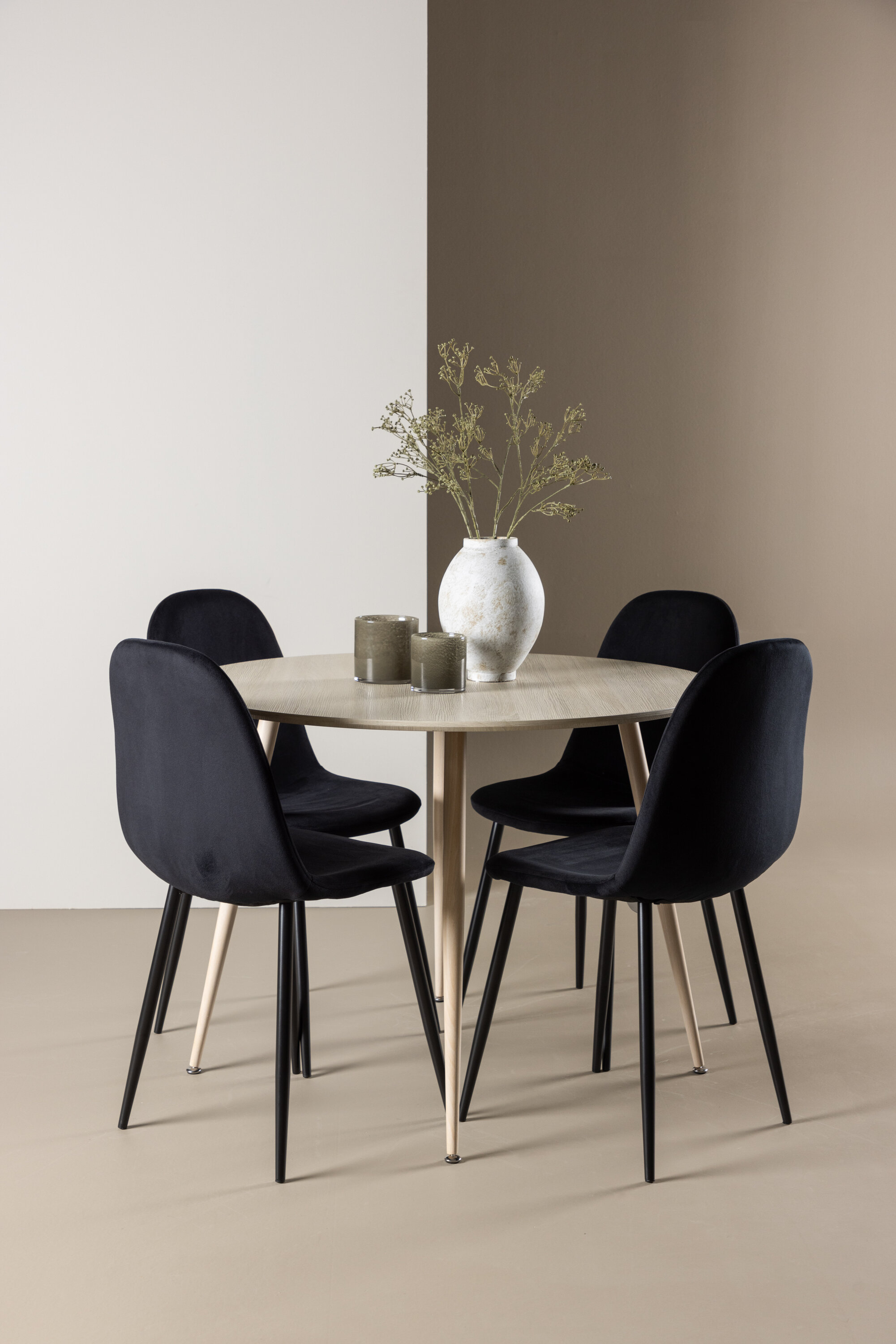 Avastage oma koju täiuslik söögikomplekt Plaza söögilaua ja Polari söögitoolidega. Plaza söögilaud, mille läbimõõt on 100 cm, on valmistatud vastupidavast MDF-materjalist ja on valge pigmendiga, mis annab ruumile sooja ja kutsuva tunde. Selle kaasaegne disain ja puhtad jooned loovad rahuliku ja harmoonilise atmosfääri, muutes iga toidukorra lõõgastavaks kogemuseks. Kompaktne formaat muudab Plaza ideaalseks väiksematesse ruumidesse, pakkudes samas piisavalt ruumi mugavaks einetamiseks pere ja sõpradega. Täiendage oma söögilauda stiilsete üleni musta värvi Polari söögitoolidega. Toolidel on täielikult polsterdatud disain, jalad on mustast pulbervärvitud metallist ning ümar seljatugi ja iste on pehme polstriga mustast sametkangast. Siit saate söögitooli, mis ühendab parimal viisil mugavuse ja kaasaegse disaini. Samet võib kuhja lamades saada survejälgi, mis on selle materjali puhul täiesti tavaline ja annab kangale võluva variatsiooni sõltuvalt valguse langemisest. Vajalik lihtne kokkupanek. Anna oma kodule kaasaegne ja stiilne hõng Plaza söögilaua ja Polari söögitoolidega – ideaalne kombinatsioon neile, kes hindavad oma sisekujunduses nii stiili kui ka funktsionaalsust.