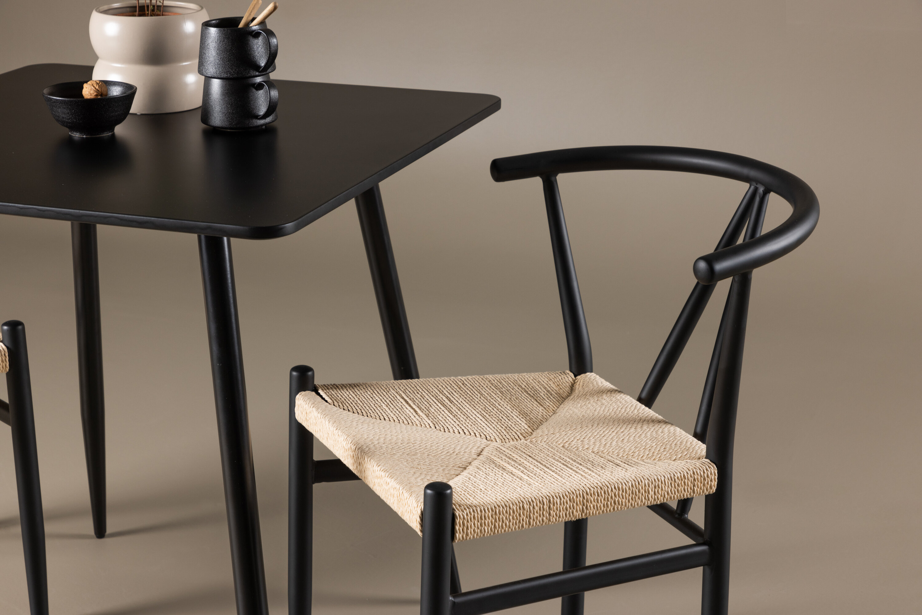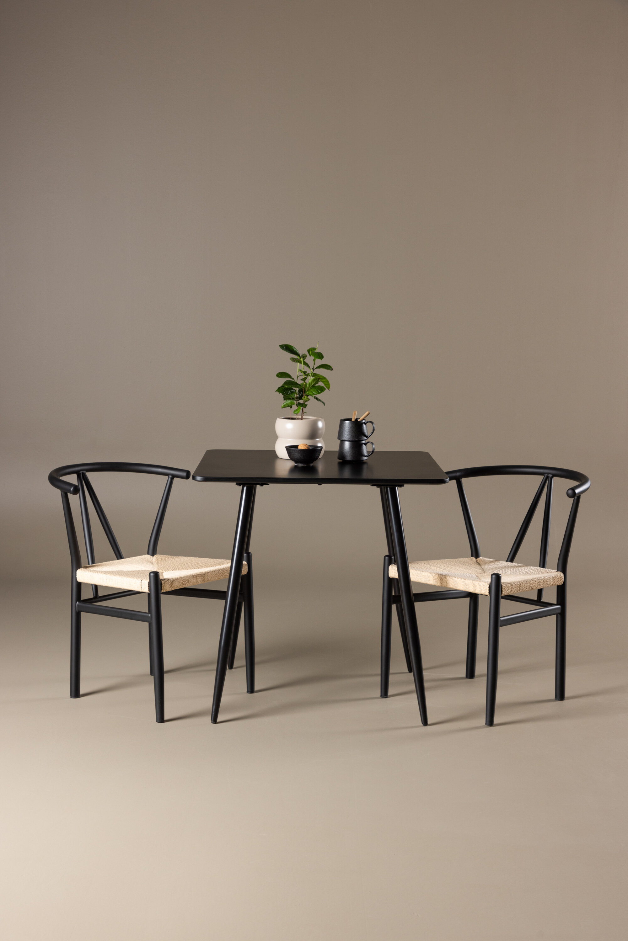 Looge moodne ja kutsuv söögituba meie elegantse söögikomplektiga, mis ühendab stiilse Polari laua võluvate Alfonsi toolidega. See söögikomplekt, mis sobib ideaalselt nii väikesteks eineteks kui ka õdusateks õhtusöökideks, loob teie söögitoale või köögile peene ja harmoonilise atmosfääri. MDF-st valmistatud Polari laual on elegantne must värv, mis lisab teie kodule modernse ja elegantse tunde. Laua mõõtmed on 75×75 cm ning see pakub kompaktset, kuid avarat pinda toidu ja vestluste jaoks, mistõttu on see ideaalne väiksematesse ruumidesse või intiimsetesse söögikohtadesse. Laua tugev konstruktsioon tagab pikaajalise kasutamise ja stabiilsuse. Kaks Alfonsi tooli täiendavad lauda suurepäraselt oma elegantsete beežist rotangist istmete ja elegantsete mustade metalljalgadega. Need toolid pakuvad nii mugavust kui ka stiili, mistõttu on need ideaalsed pikkadeks ja nauditavateks söögikordadeks. Nende kaasaegne disain koos kõrgete seljatugede ja naturaalsete materjalidega annab teie söögitoale või köögile rafineeritud ja kaasaegse ilme. See söögikomplekt on täiuslik kombinatsioon esteetikast ja funktsionaalsusest, mistõttu on see suurepärane valik neile, kes otsivad elegantset ja mugavat väiksemas formaadis söögituba. Täiustage oma kodu Polari laua ja Alfonsi toolide kombinatsiooniga ning looge koht, kus jagatakse mälestusi ja rõõmu.