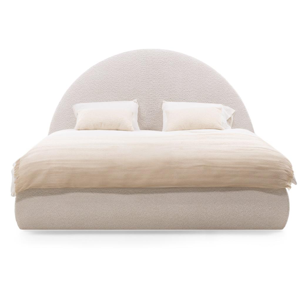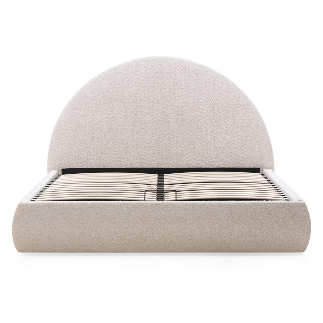 Polsterdatud voodi 140×200 cm MIMIQ raami ja panipaigaga ümar beež