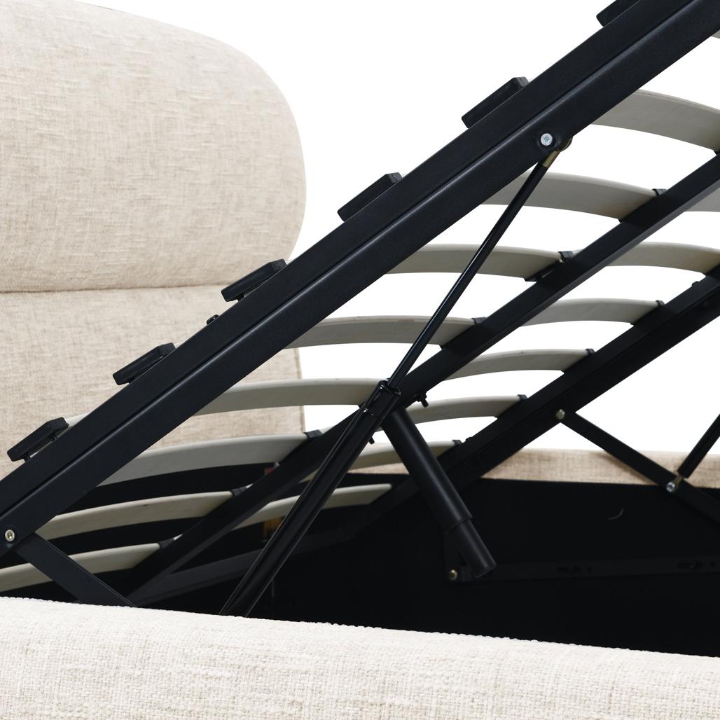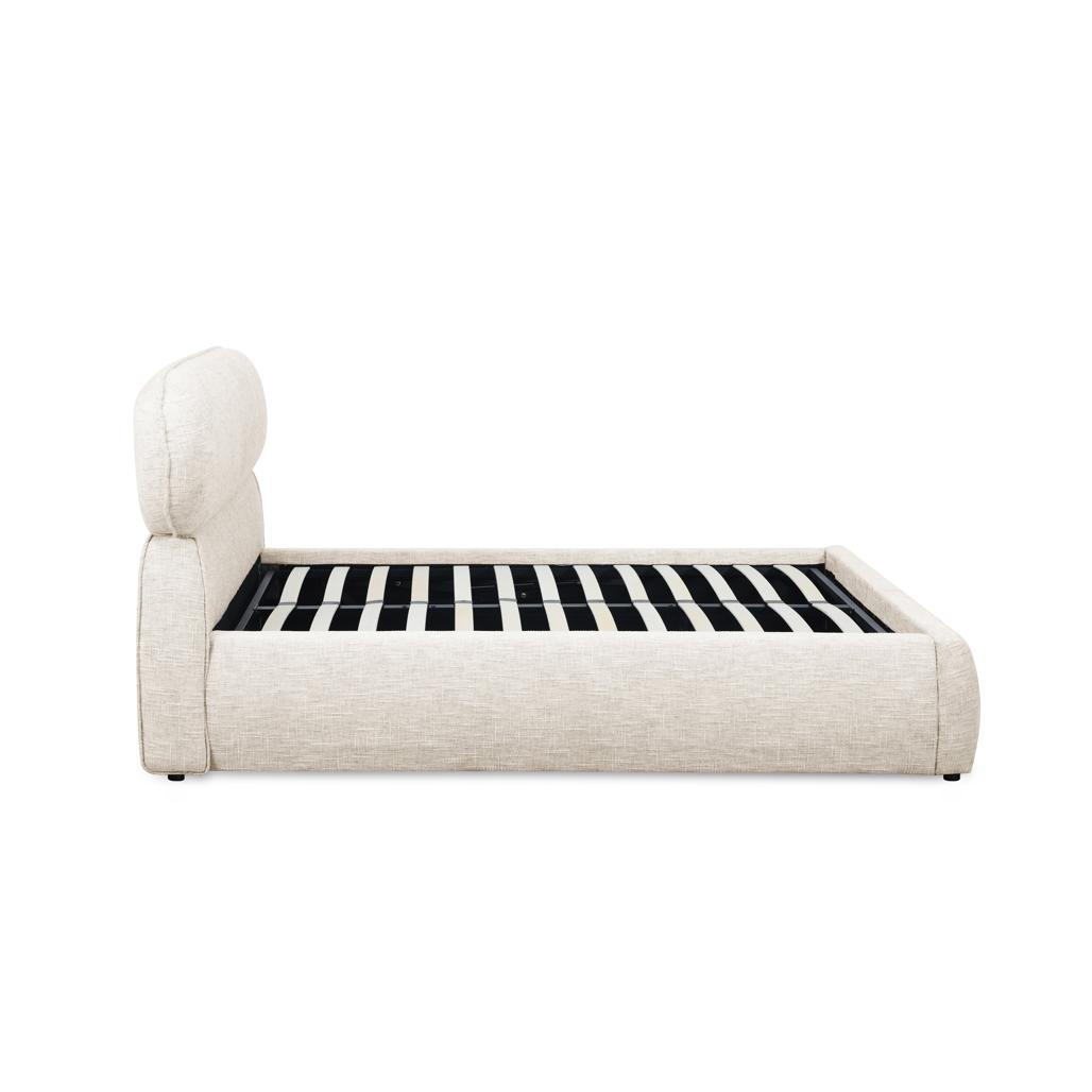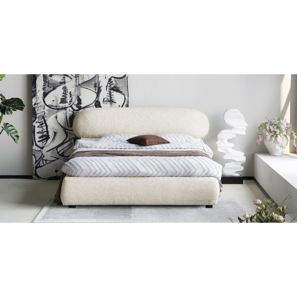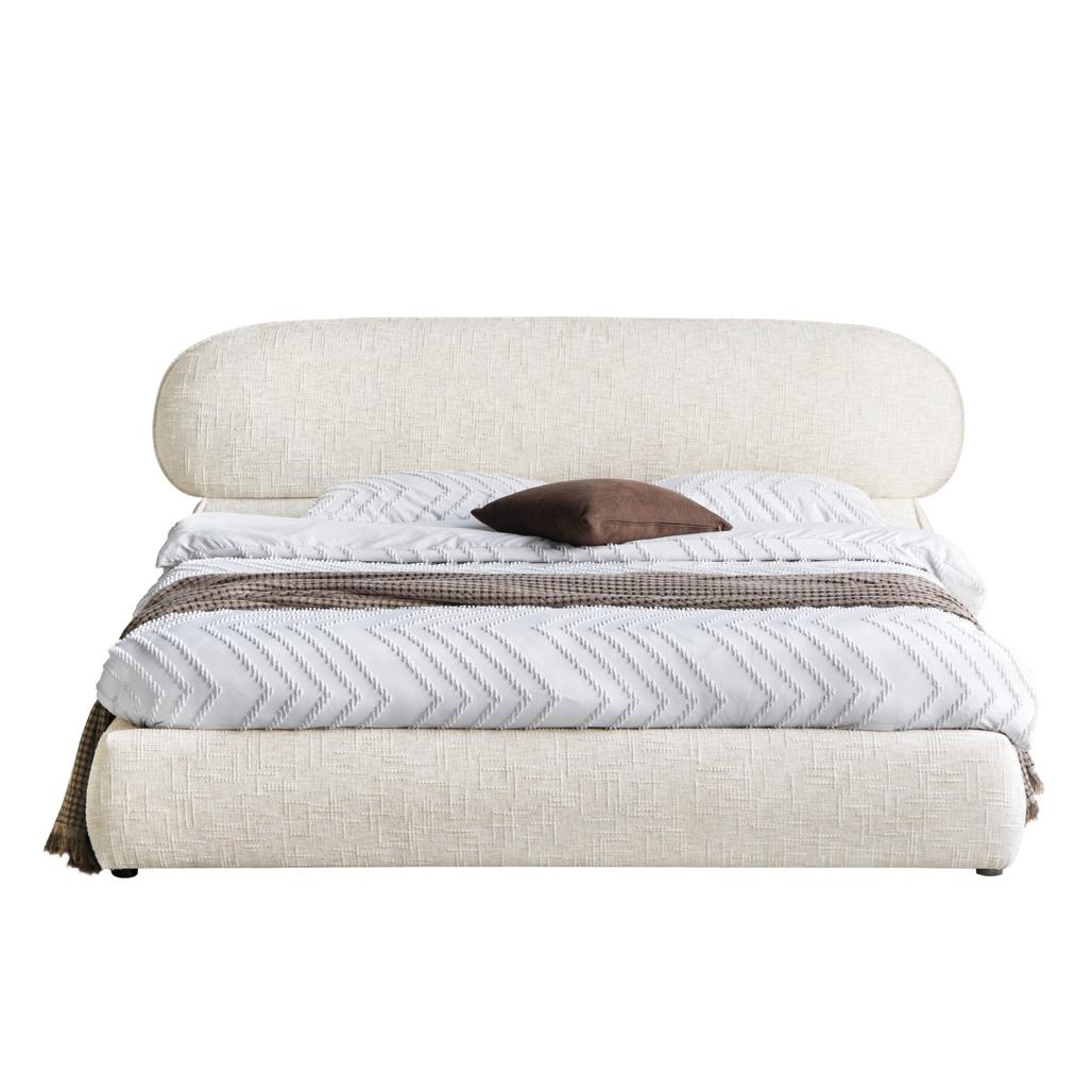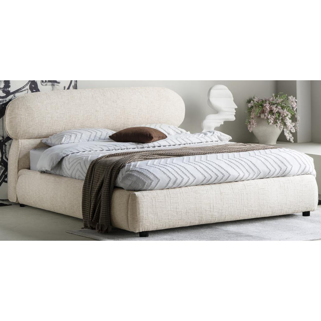 Polsterdatud voodi 160×200 cm AVION raami ja panipaigaga helebeež ümar