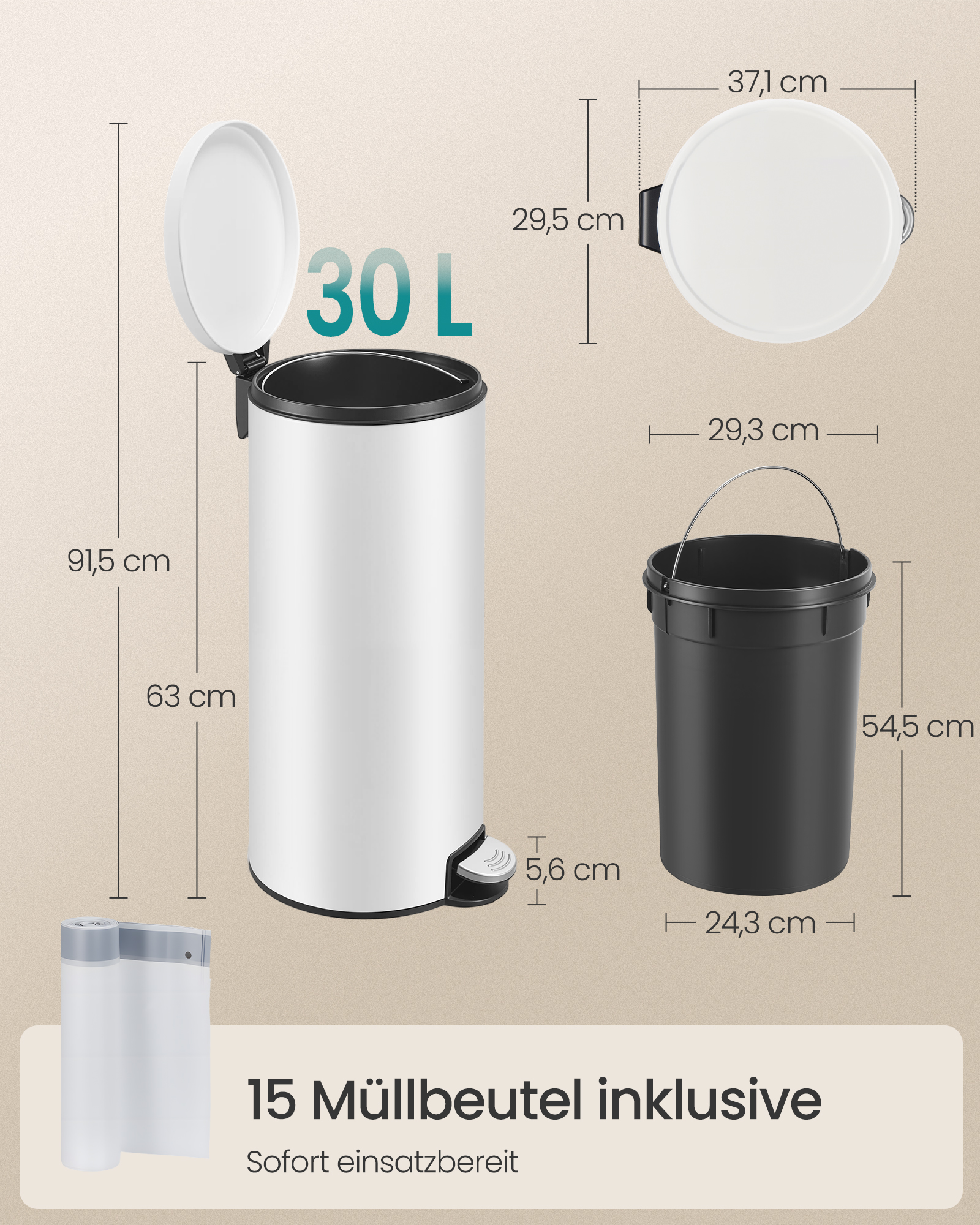 Omadused: Värvus: Pilvevalge Materjalid: Terasest prügikast, PP-plastist sisemine ämber, ABS-plastist kaaned Toote mõõtmed (pedaaliga): 29,5 x 37,1 x 63 cm (P x L x K) Kõrgus avatud kaanega: 91,5 cm Maht: 30 l Kaal: 3,3 kg Tarne sisaldab: 1 x prügikast 15 x prügikotti
