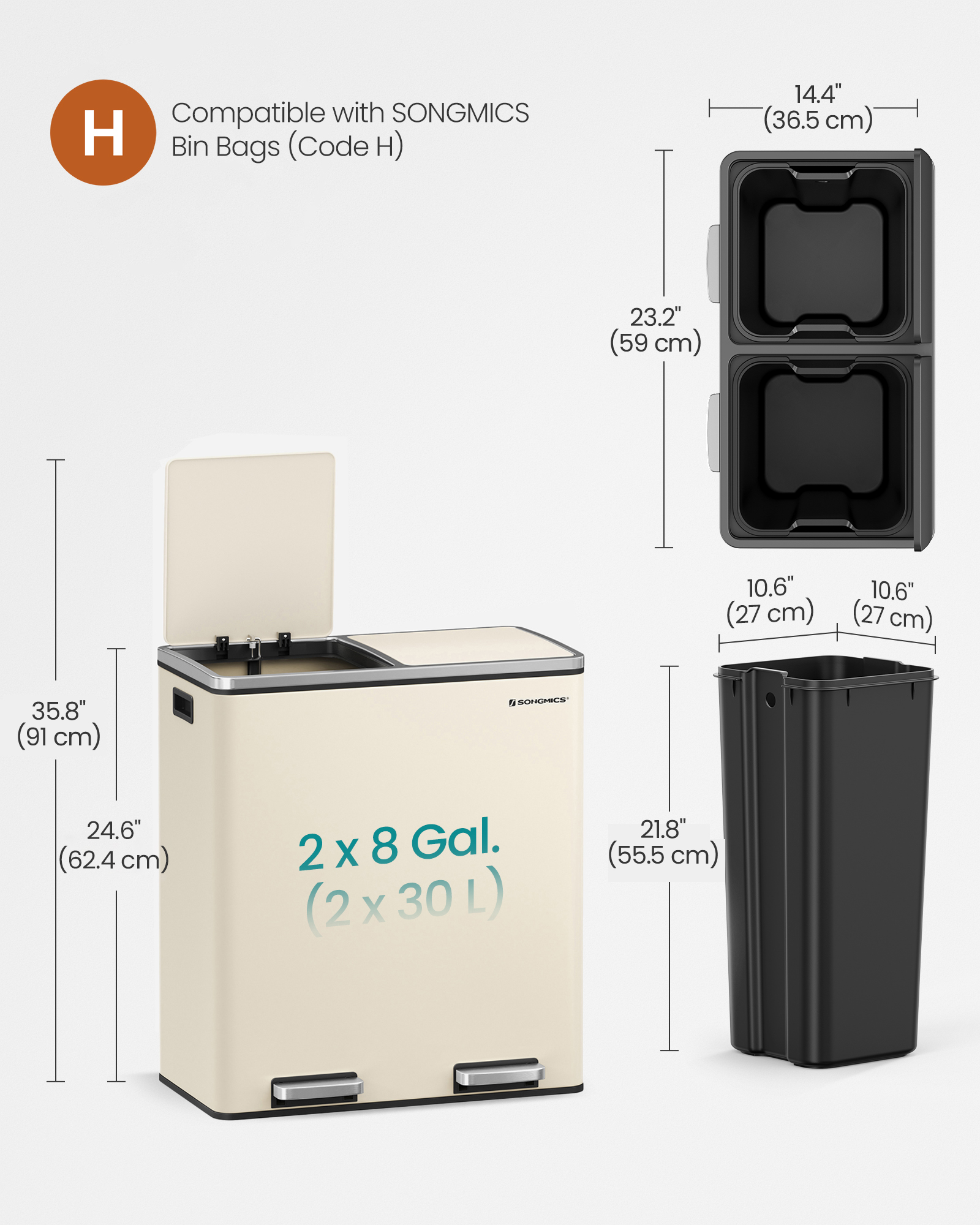 Spetsifikatsioonid: Värv: kreemikas Materjal: terasest prügikast, PP-plastist sisemine ämber, ABS-plastist kaas Toote mõõdud (ilma pedaalita): 59×36,5×65,2cm Kõrgus avatud kaanega: 94 cm Iga sisemise ämbri mõõdud: 27 x 27 x 58,5 cm (P x L x K) Pedaali mõõdud: 13,5 x 4 cm (P x L) Maht: 2 x 30 l Toote kaal: 10,5 kg Pakisisu: 1 x prügikast 15 x prügikotti