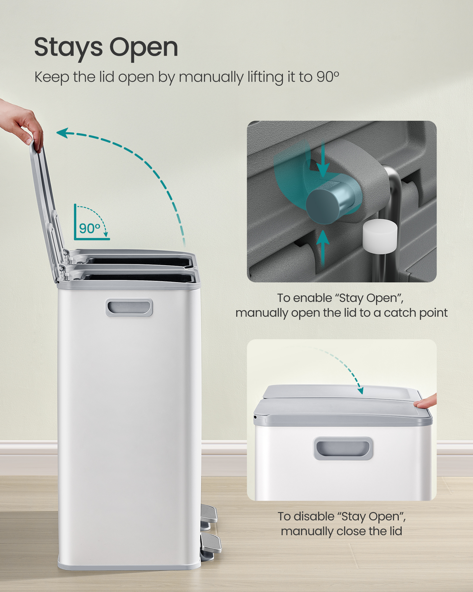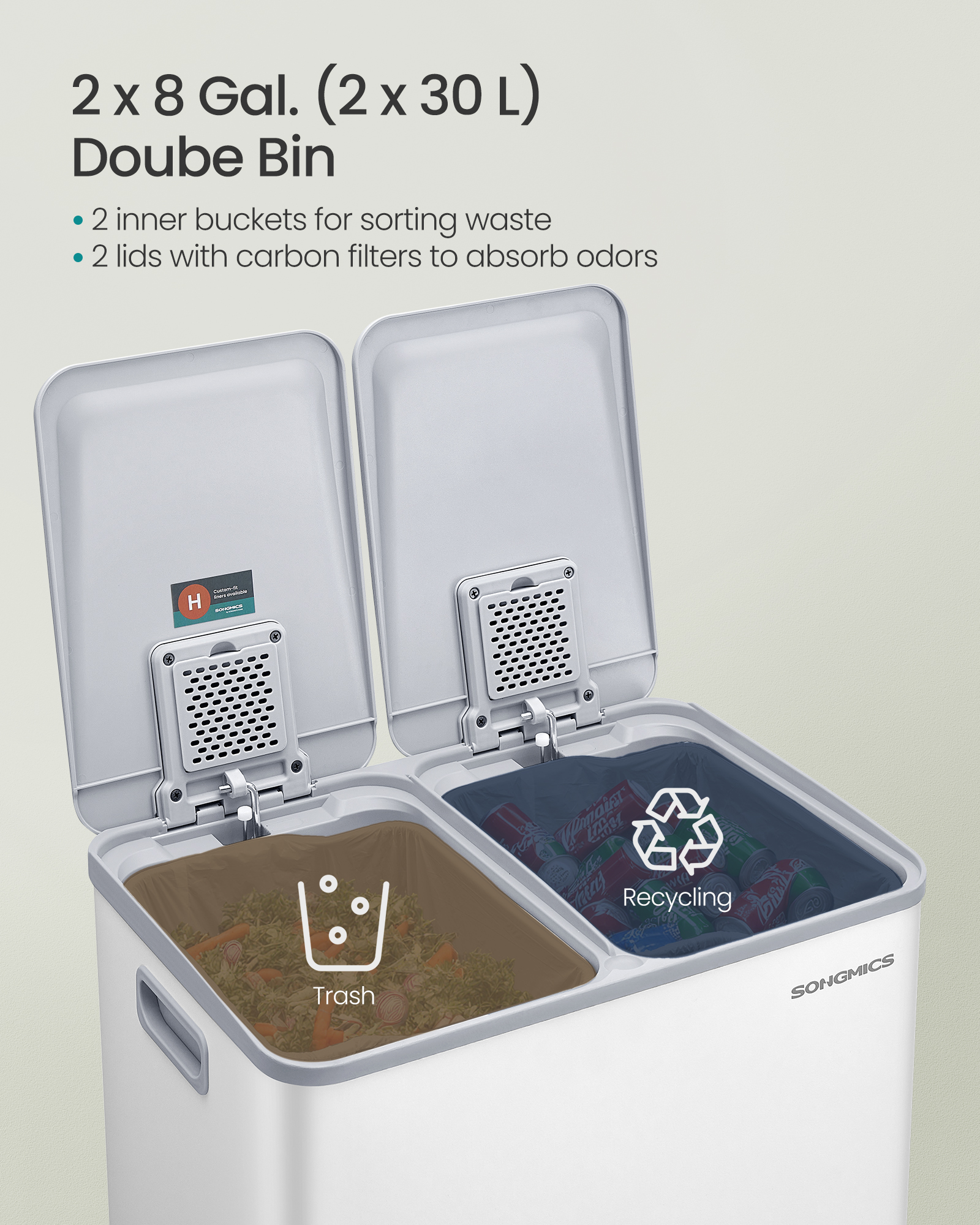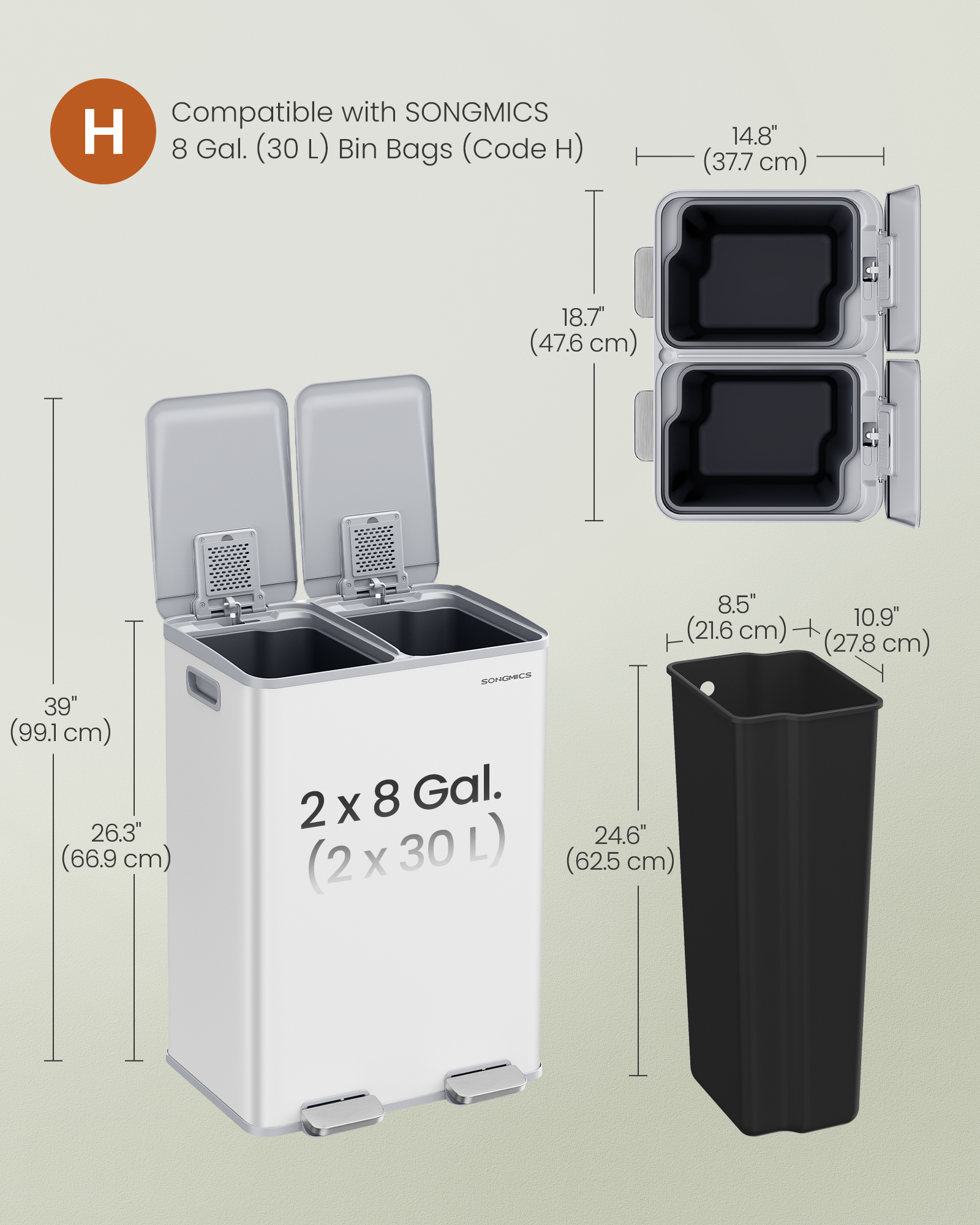 Spetsifikatsioonid – Värvus: mattvalge – Materjal: teras, PP-plastik – Toote mõõtmed (pedaaliga): 47,6 x 37,7 x 66,9 cm (18,7″P x 14,8″L x 26,3″K) – Kõrgus avatud kaanega: 99,1 cm (39″) – Iga sisemise ämbri mõõtmed: 27,8 x 21,6 x 62,5 cm (10,9″P x 8,5″L x 24,6″K) – Pedaali mõõtmed: 11,5 x 4,8 cm (4,5″P x 1,9″L) – Maht: 2 x 8 gallonit (2 x 30 l) – Toote kaal: 7,4 kg (16,2 naela) Pakisisu: – 1 x prügikast – 15 x prügikotti SONGMICS Märkused: – See prügikast on mõeldud ainult siseruumides kasutamiseks. – Puhastamiseks pühkige prügikasti pehme niiske lapiga ja kasutage õrnatoimelist puhastusvahendit. Vajadusel puhastusvahendeid. – Pika kasutusea tagamiseks ärge sulgege pedaaliga prügikasti kaant käsitsi jõuga. – Prügikast ei tohiks kokku puutuda happeliste ega muude söövitavate ainetega. Kui happelised ained (nt sidrunimahl või äädikas) satuvad tootele, pühkige need kohe ära.