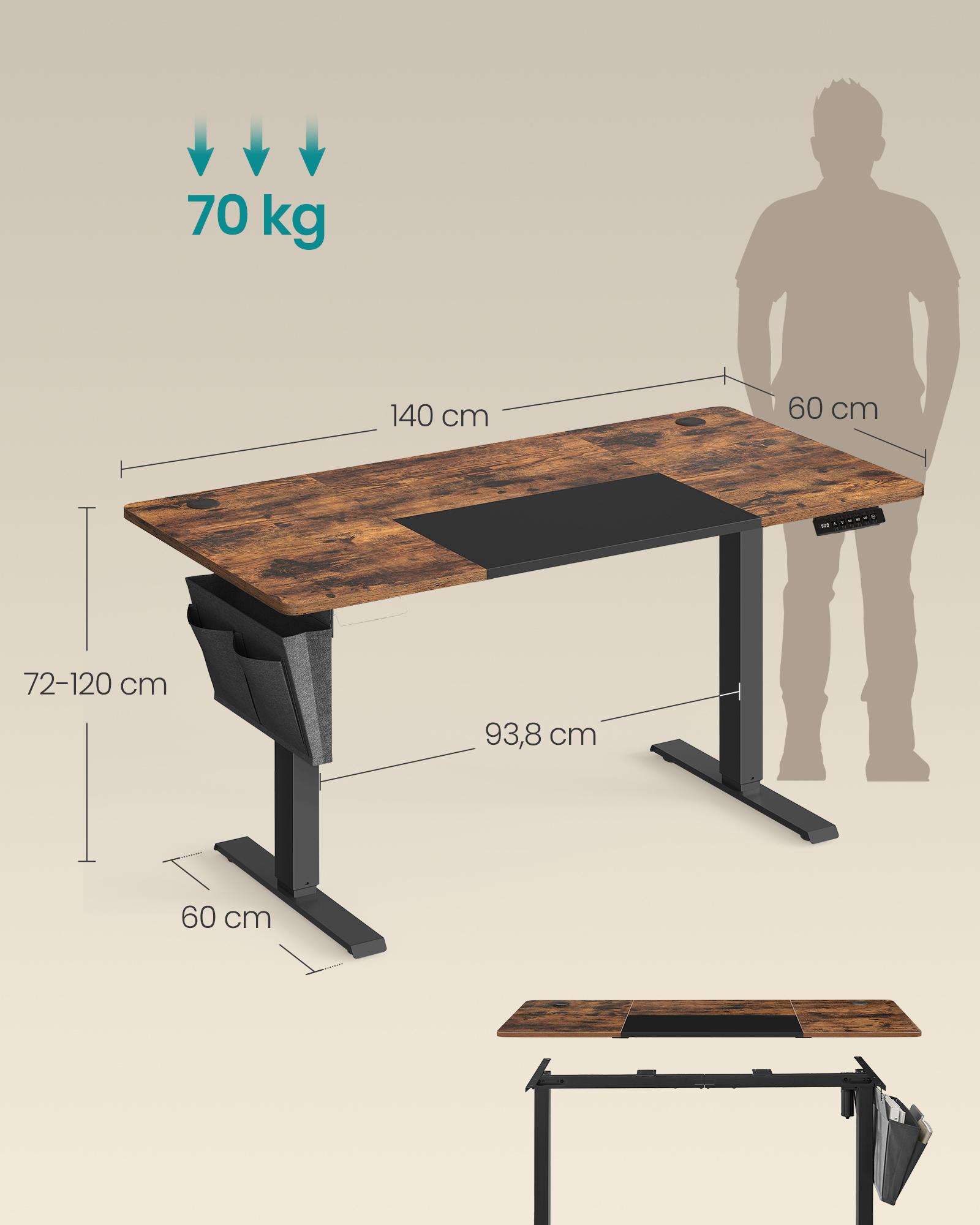 Toote andmed: Värv: Vintage pruun – mustMaterjal: Puitlaastplaat, teras, lausriieMõõtmed: 140 x 60 x (72 -120) cm. Lauaplaadi paksus: 1,5 cm. Kaal: 28 kg. Maksimaalne kandevõime: 80 kg Karbi sisu: 1 x elektriline lauaalus1 x hoiukott2 x konks1 x tarvikute pakk1 x kasutusjuhend (inglise keele eksam pole garanteeritud)
