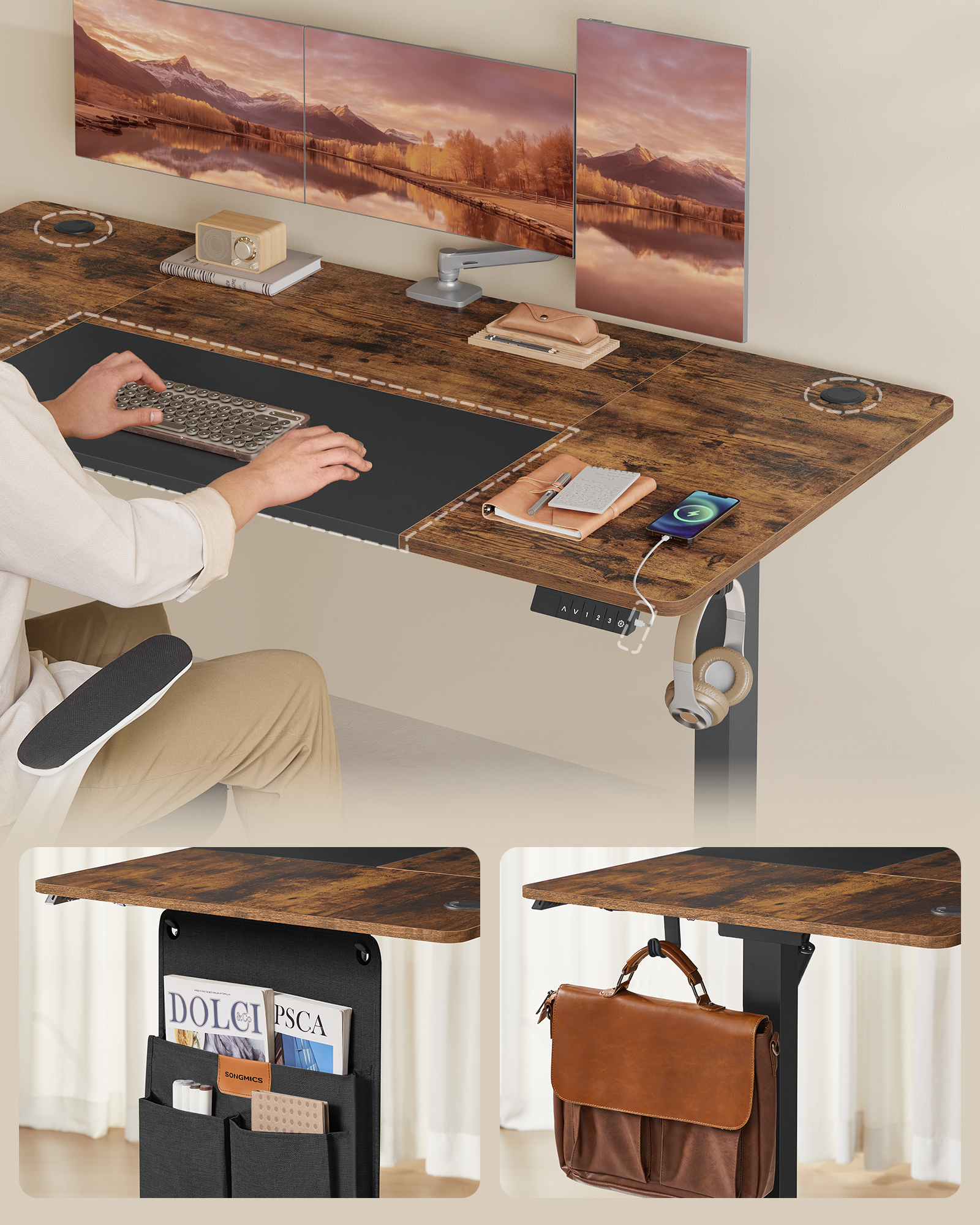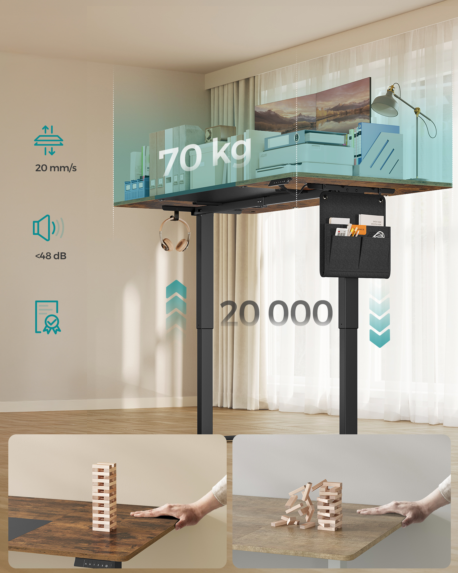 Toote üksikasjad: Värvus: Vintage-pruun mustaga Põhimaterjal: Puitlaastplaat, teras, lausriie Suurus: 70 x 160 x (72-120) cm (S x L x K) Lauaplaadi paksus: 1,5 cm Kaal: 31,2 kg Maksimaalne staatiline kandevõime: 80 kg Pakisisu: 1 x elektriline laud 1 x adapter 1 x kontroller 1 x hoiukott 3 x konksu 1 x tarvikute komplekt 1 x kasutusjuhend