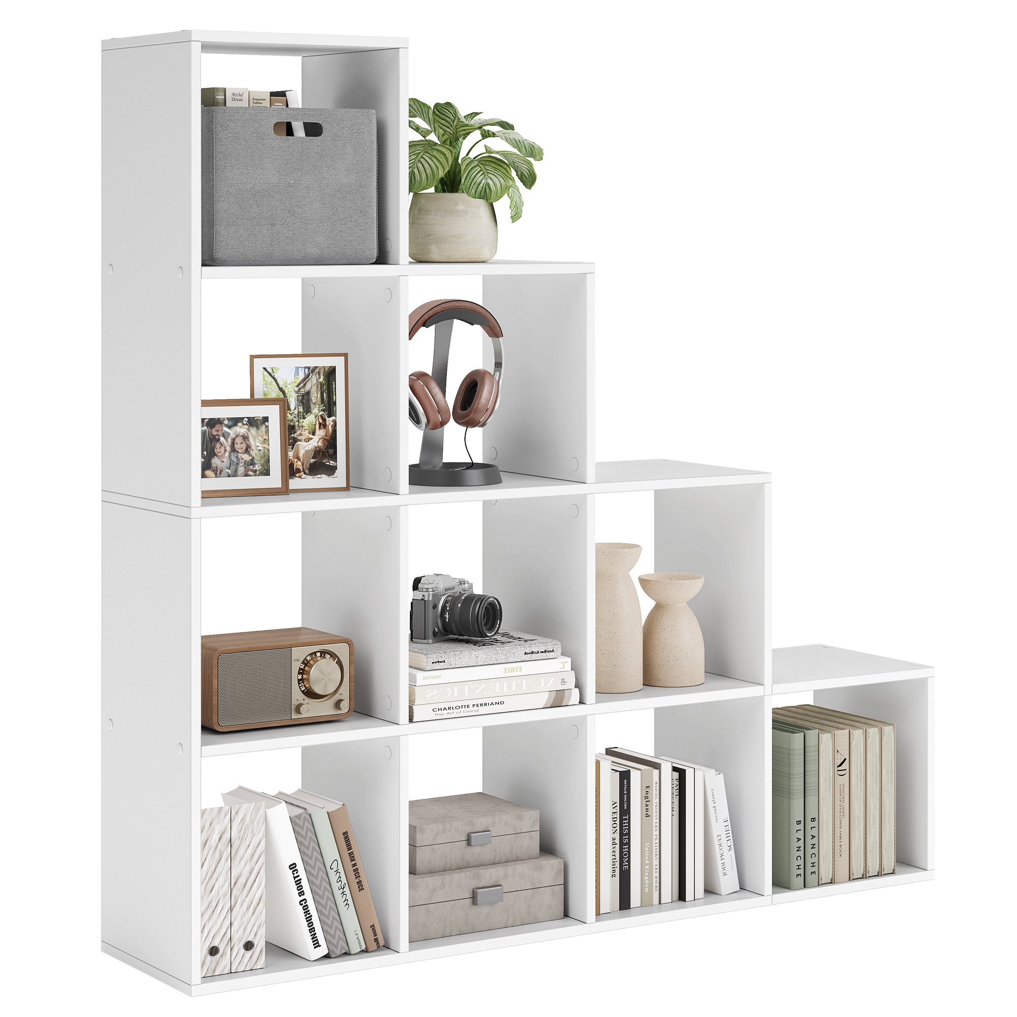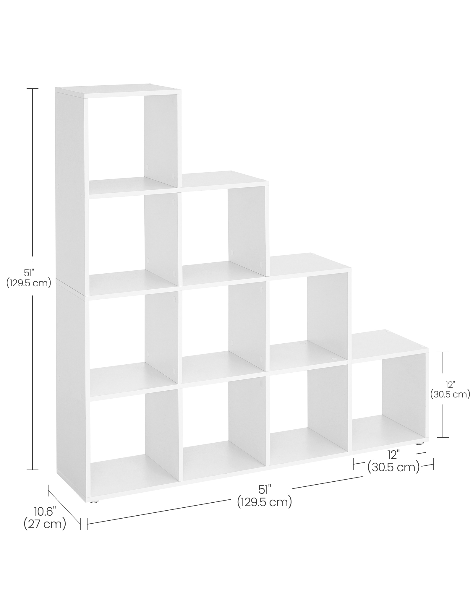 Spetsifikatsioonid: – Värvus: Valge – Materjal: Puitlaastplaat – Toote mõõdud: 129,5 x 29 x 129,5 cm (P x L x K) – Toote kaal: 27,3 kg – Iga kuubiku maksimaalne staatiline kandevõime: 10 kg Pakisisu: – 1 x raamaturiiul – 1 x tarvikute kott – 1 x juhend