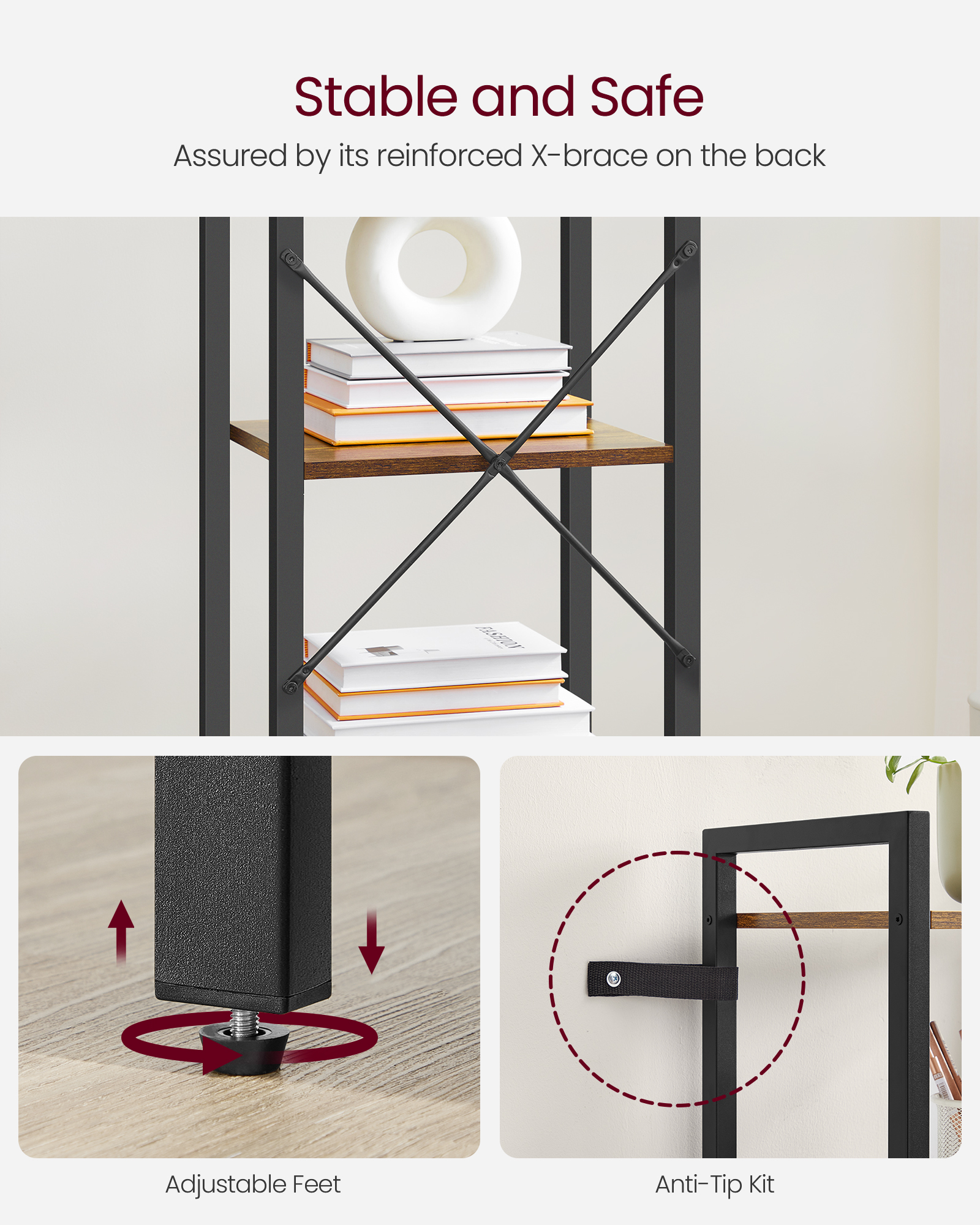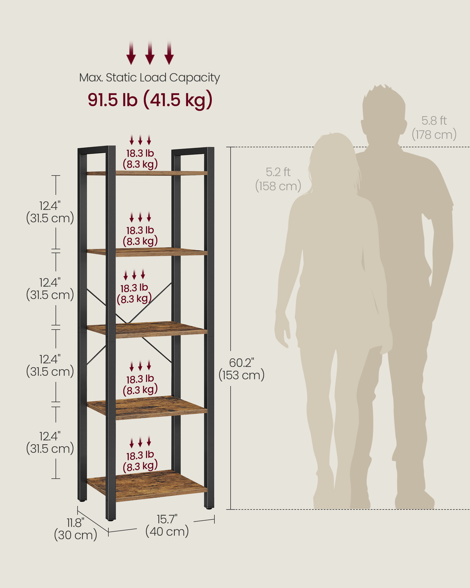 Spetsifikatsioonid: – Värvus: maalähedane pruun, must – Materjal: puitlaastplaat, teras – Toote mõõdud: 40 x 30 x 153 cm (P x L x K) – Toote kaal: 11 kg – Iga astme maksimaalne staatiline koormus: 10 kg – Kogu staatiline kandevõime: 50 kg Pakisisu: – 1 x hoiuriiul – 1 x kokkupanekukomplekt – 1 x ümberkukkumisvastane komplekt – 1 x juhend