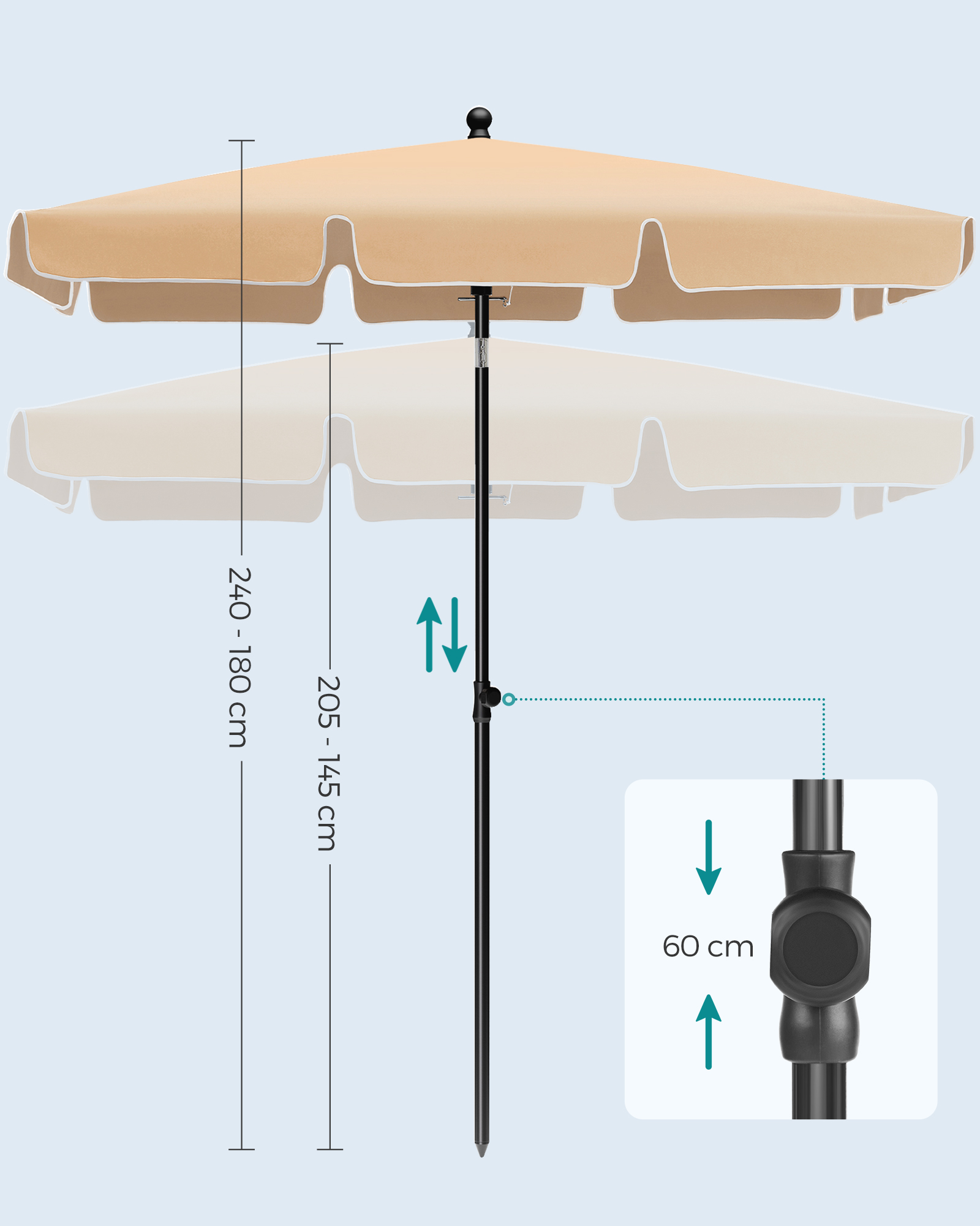 Spetsifikatsioonid: – Värvus: Taupe – Materjal: Metallpost, 160 g/m² PA-kattega polüester – Kõrgus: 2,4 m – Varikatuse suurus: 2 x 1,25 m (P x L) – Toote kaal: 2,9 kg Pakisisu: – 1 x rõdu päikesevari – 1 x kandekott – 1 x metallkork