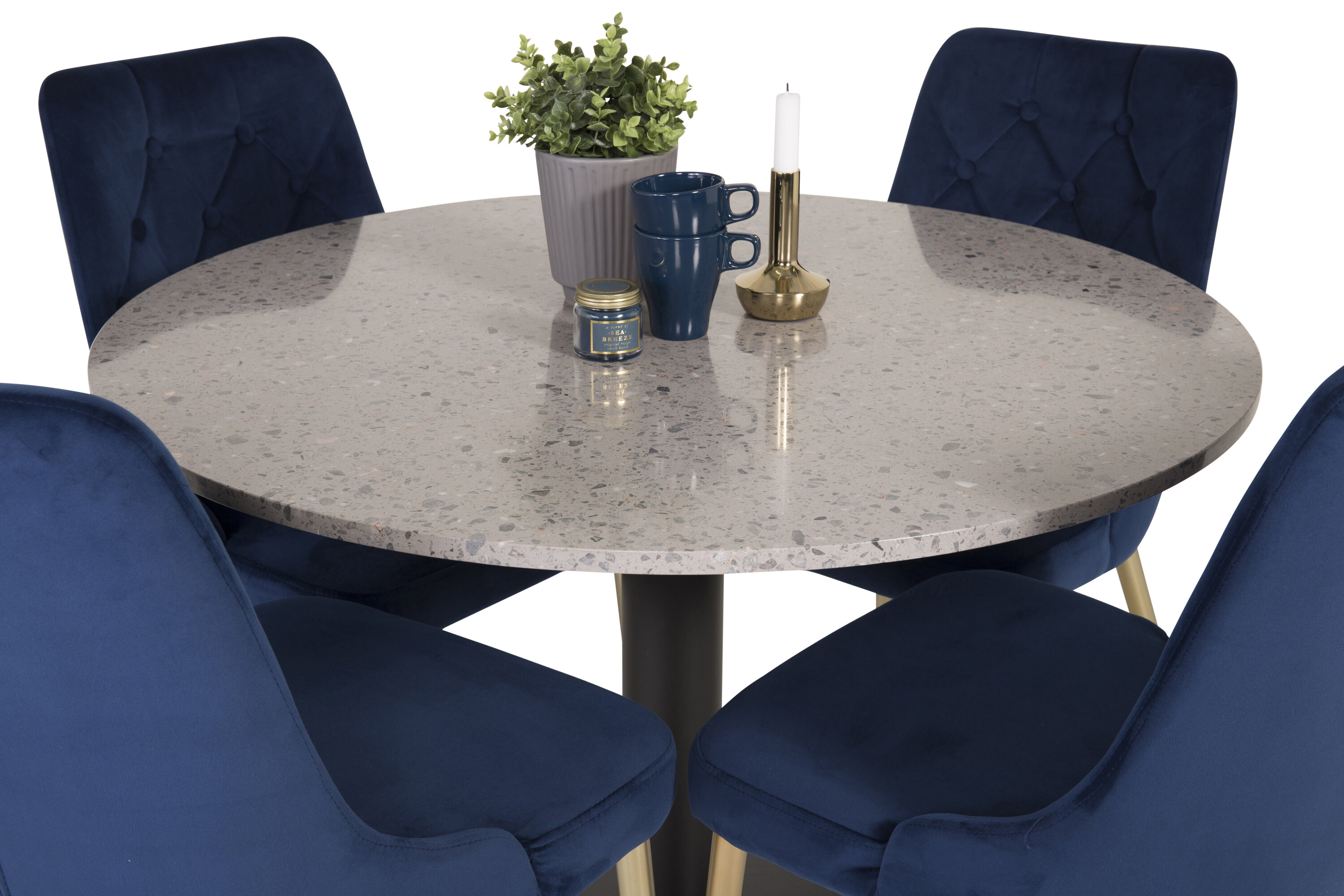 Valmistoidugrupi ostmine on ühtaegu trendikindel ja praktiline! Siin ühendame oma ümmarguse söögilaua raid koos meie istmesõbralike siniste söögitoolidega Velvet. Lase kodu südant iseloomustada teie uus pilkupüüdev toidugrupp.