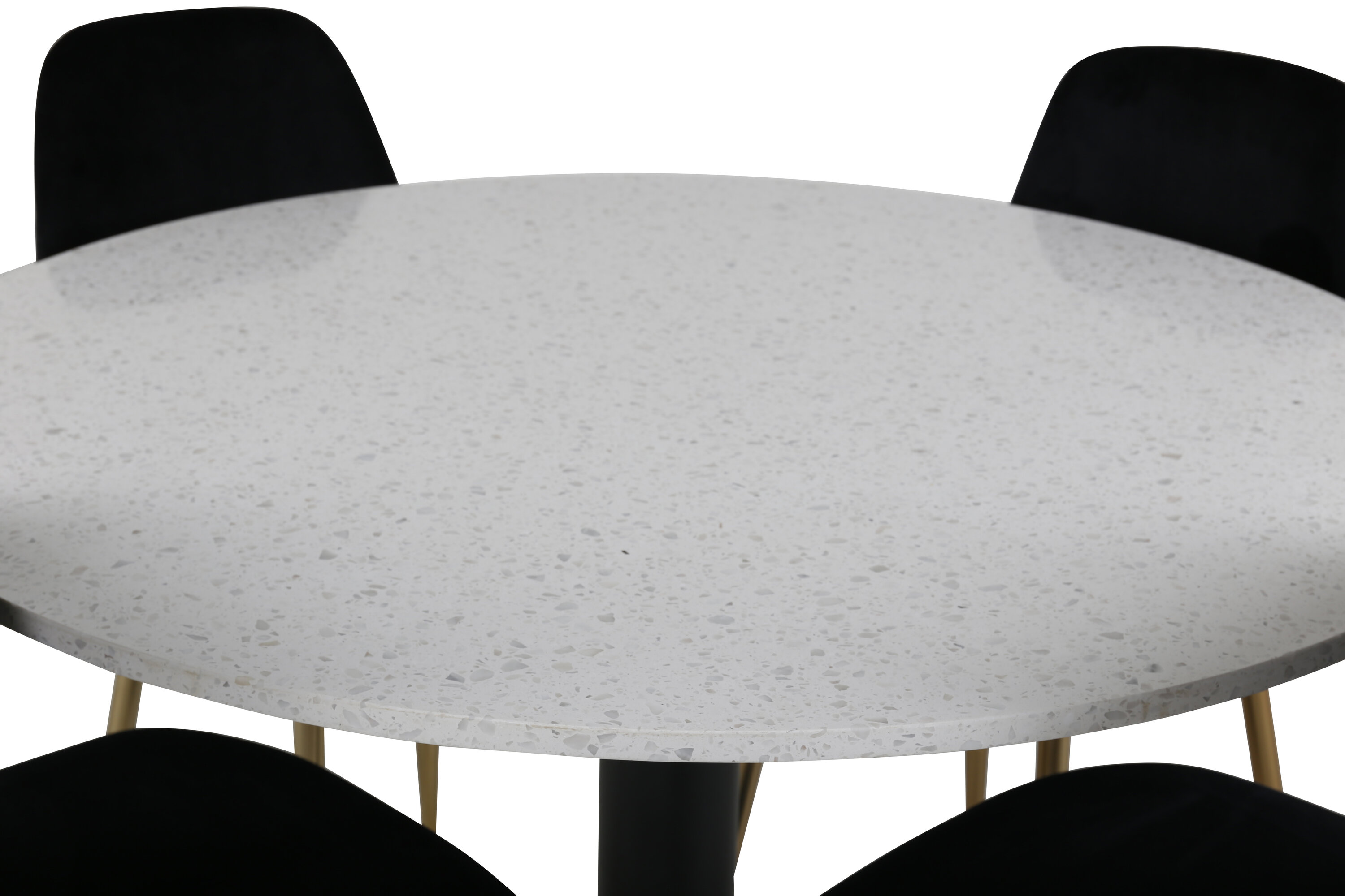Elegantne toidugrupp, mis loob kutsuva atmosfääri! Söögilaual Razzia on kaunis valge viimistlusega terazzo ümmargune lauaplaat ja silindrikujuline mustast metallist raam. Siin koos kaasaegsete Polari seeria söögitoolidega. Toolil on täielikult riietatud disain, messingist poleeritud metallist jalad, kergelt ümardatud seljatugi ja iste, mis on valmistatud peenikesest mustast sametkangast ja pehme polstriga, mis lisab mugavust. Selle toidugrupi puhul ei pea te mugavuse ja disaini vahel järeleandmisi tegema!
