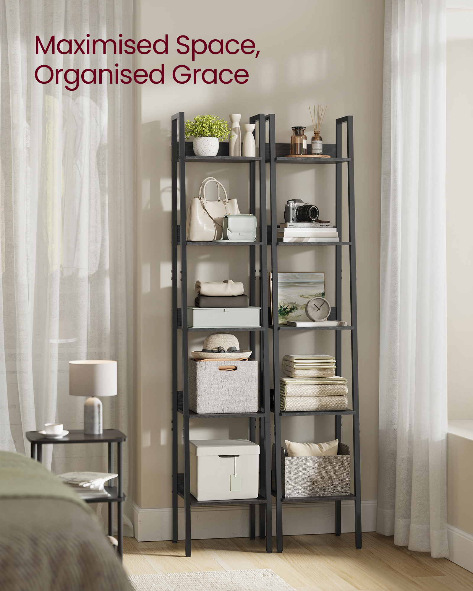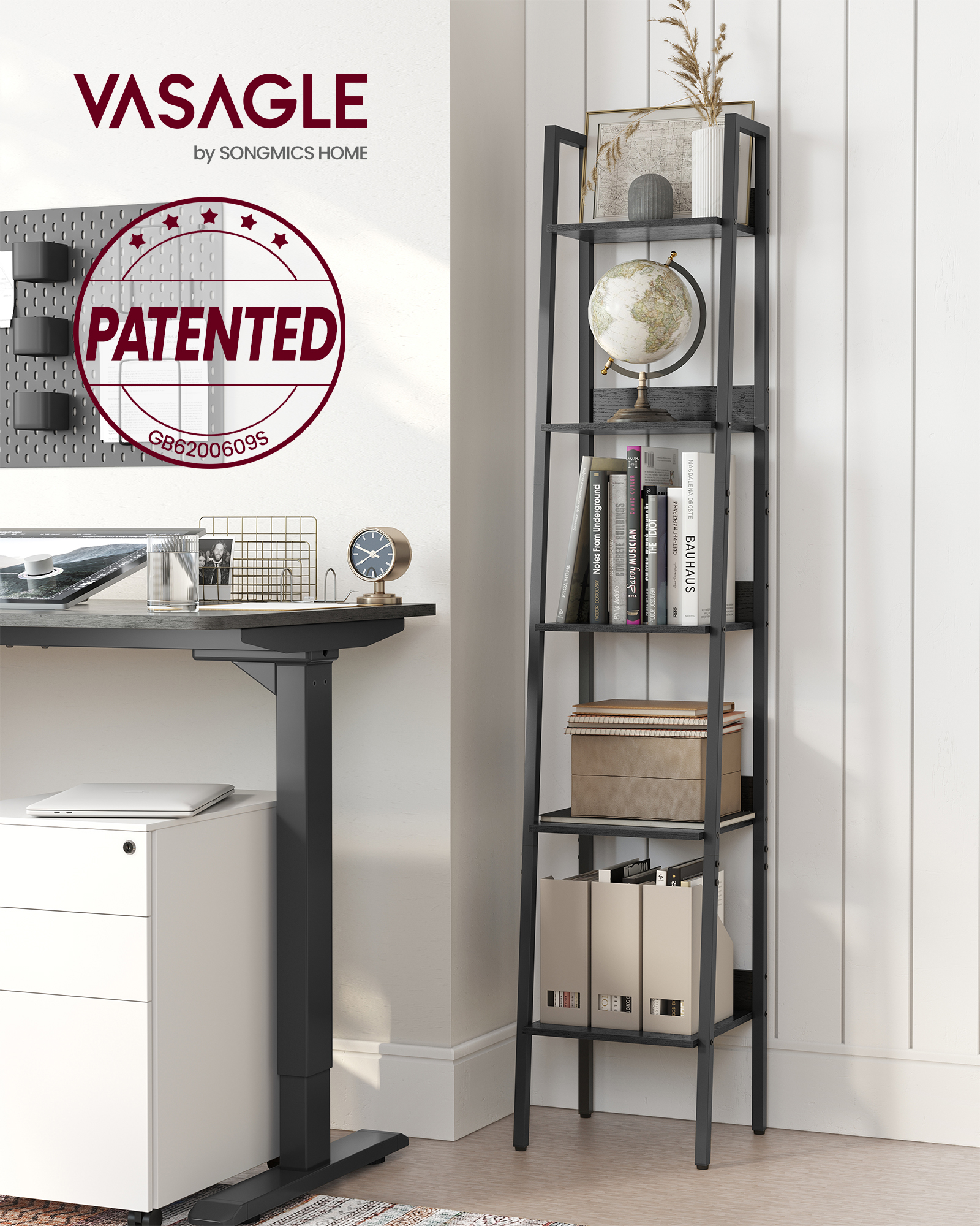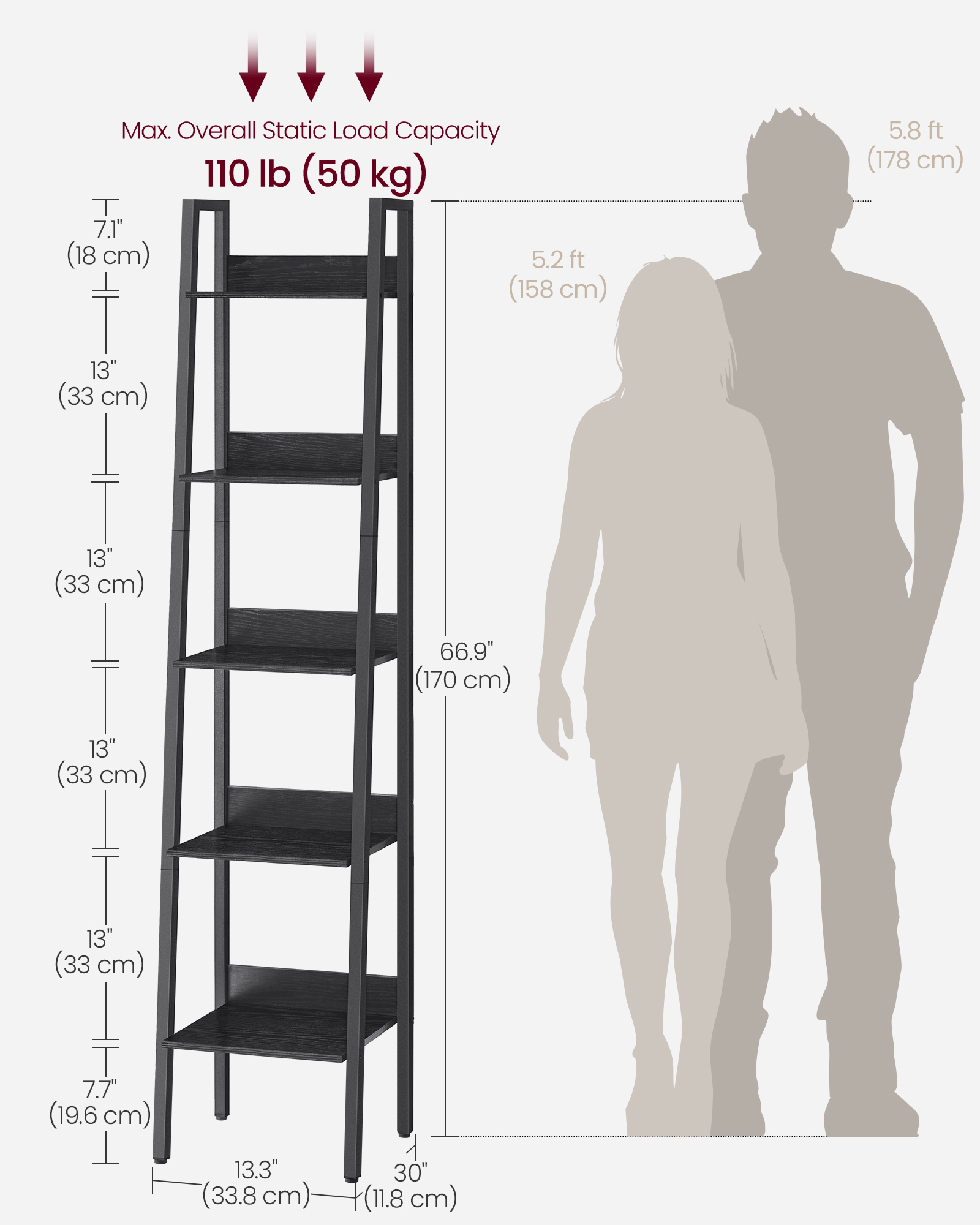 Spetsifikatsioonid: Värv: Must Materjal: Puitlaastplaat, Teras Toote mõõdud: 33,8 x 30 x 170 cm (P x L x K) Toote kaal: 8,3 kg Maksimaalne staatiline kandevõime riiuli kohta: 10 kg Pakisisu: 1 x redelriiul 1 x tarvikute komplekt 2 x ümberkukkumisvastast komplekti 1 x juhend
