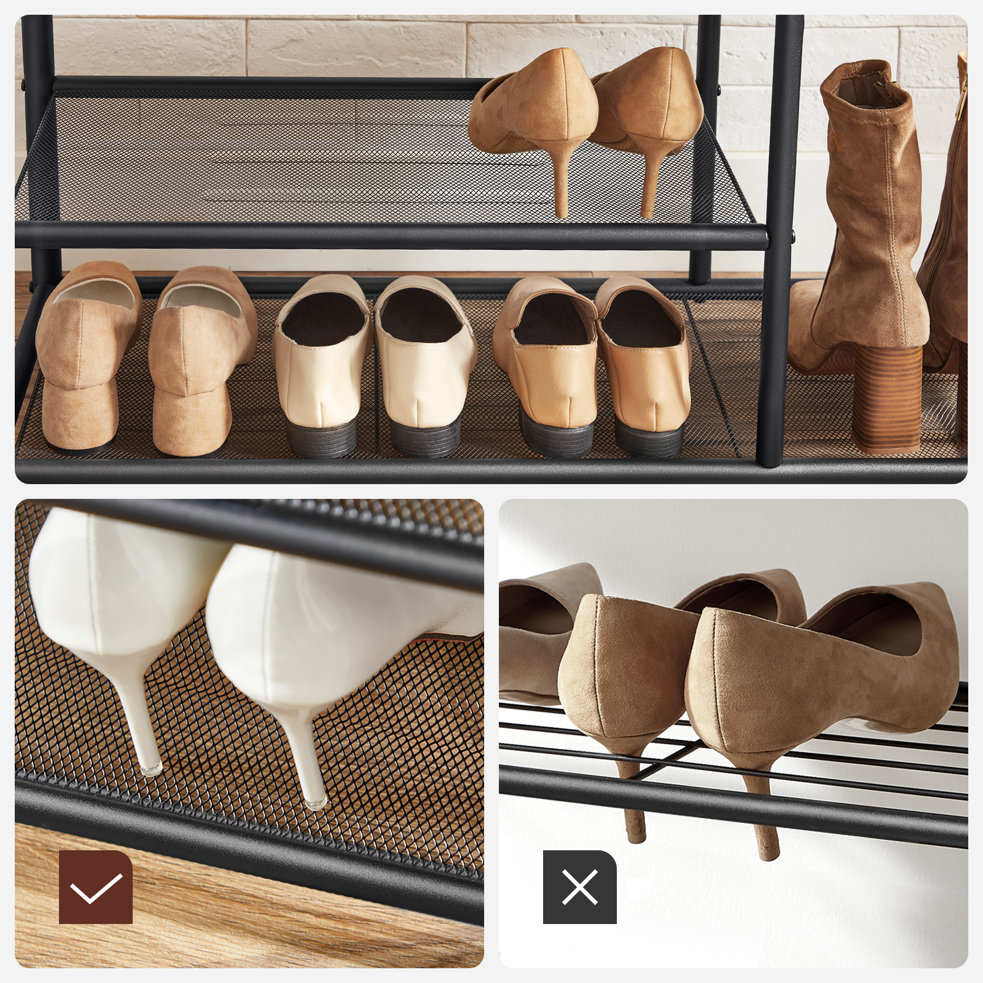 Spetsifikatsioonid: Värv: Rustikaalne pruun, must Materjal: Puitlaastplaat, teras Toote mõõdud: 85 x 30 x 180,5 cm (P x L x K) Ülemise paneeli mõõdud: 80 x 15 x 1,5 cm (P x L x K) Pingi mõõdud: 80 x 30 x 1,5 cm (P x L x K) Riiulite vaheline kaugus: Vasakul: 16,9 cm; Paremal: 35,7 cm Toote kaal: 11,8 kg Ülemise paneeli maksimaalne staatiline kandevõime: 10 kg Iga konksu maksimaalne staatiline kandevõime: 3 kg Pingi maksimaalne staatiline kandevõime: 90 kg Võrgust riiulite maksimaalne staatiline kandevõime: 15 kg Pakisisu: 1 x riidenagi 1 x kokkupanekukomplekt 1 x ümberkukkumisvastane komplekt 1 x juhend