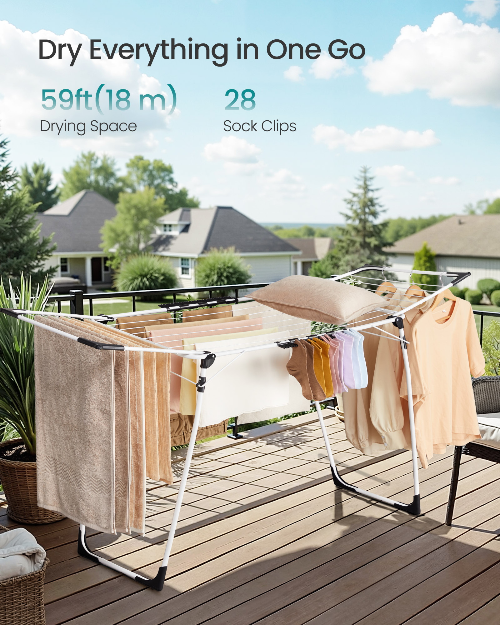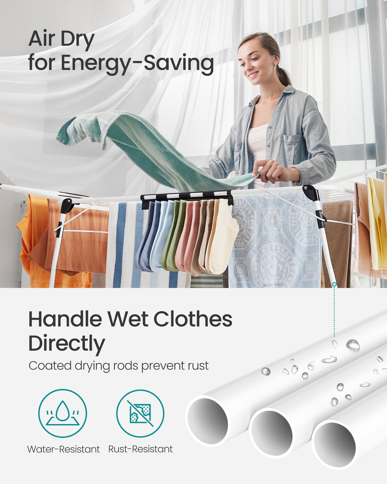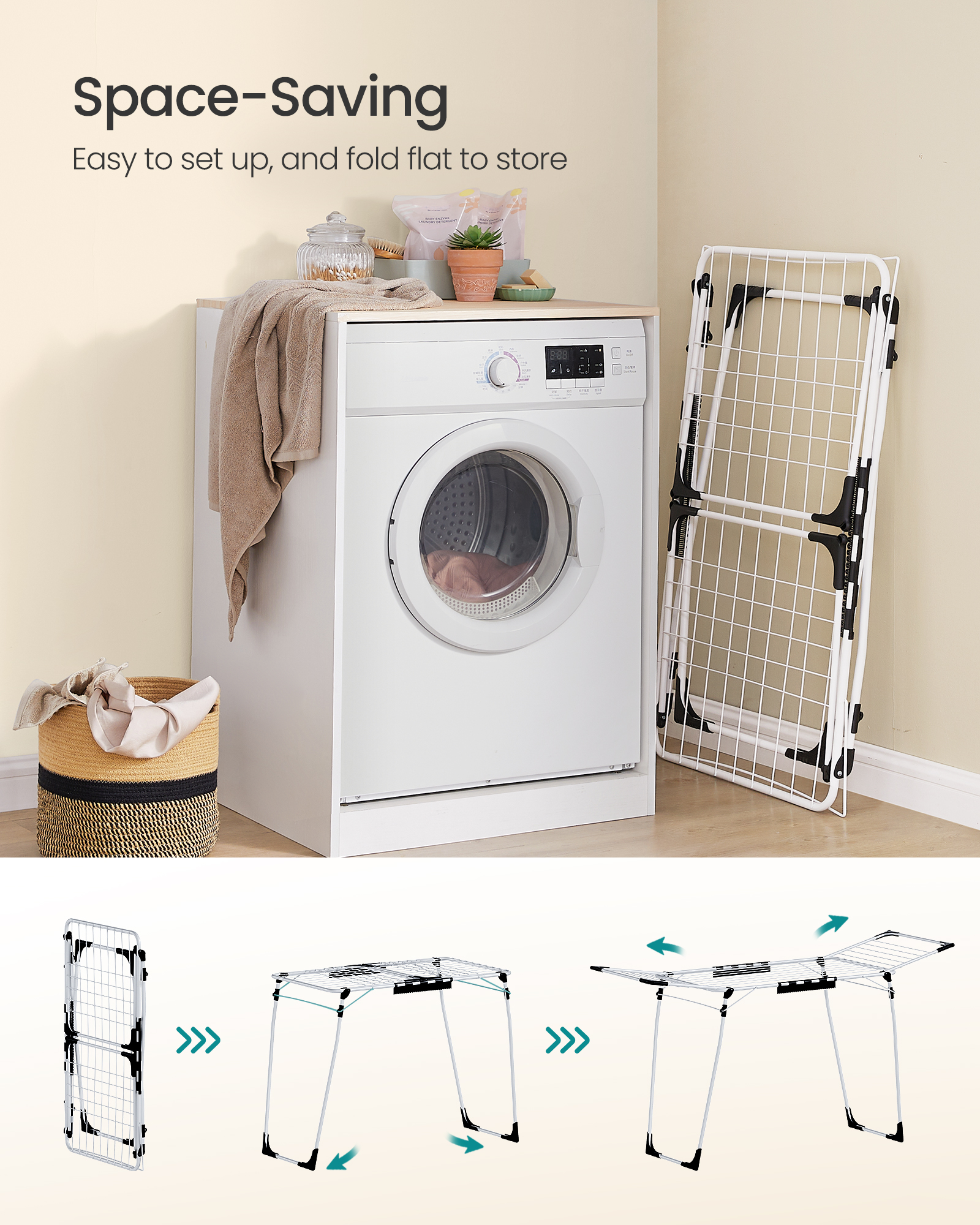 Spetsifikatsioonid: – Värvus: valge – Materjal: teras, PP-plastik – Lahtivolditud mõõtmed: 56,5 x 173 x 96,5 cm – Kokkupandud mõõtmed: 58 x 104,5 x 7 cm – Toote kaal: 3,6 kg – Maksimaalne staatiline kandevõime: 18 kg Pakisisu: – 1 x kuivatusrest – 1 x tarvikute komplekt – 1 x juhend SONGMICS Märkused: – Kuivatusrest kannab kuni 18 kg. Ärge seda üle koormake. – Tasakaalu säilitamiseks jaotage riiete kaal restil ühtlaselt. – Enne kasutamist veenduge, et kuivatusrest oleks tasasel pinnal. Vastasel juhul võib see ümber kukkuda, mis võib põhjustada vigastusi või toote kahjustumist. – Toodet ei ole soovitatav pikka aega õues hoida. Pärast kasutamist on tungivalt soovitatav toode koheselt tagasi võtta.