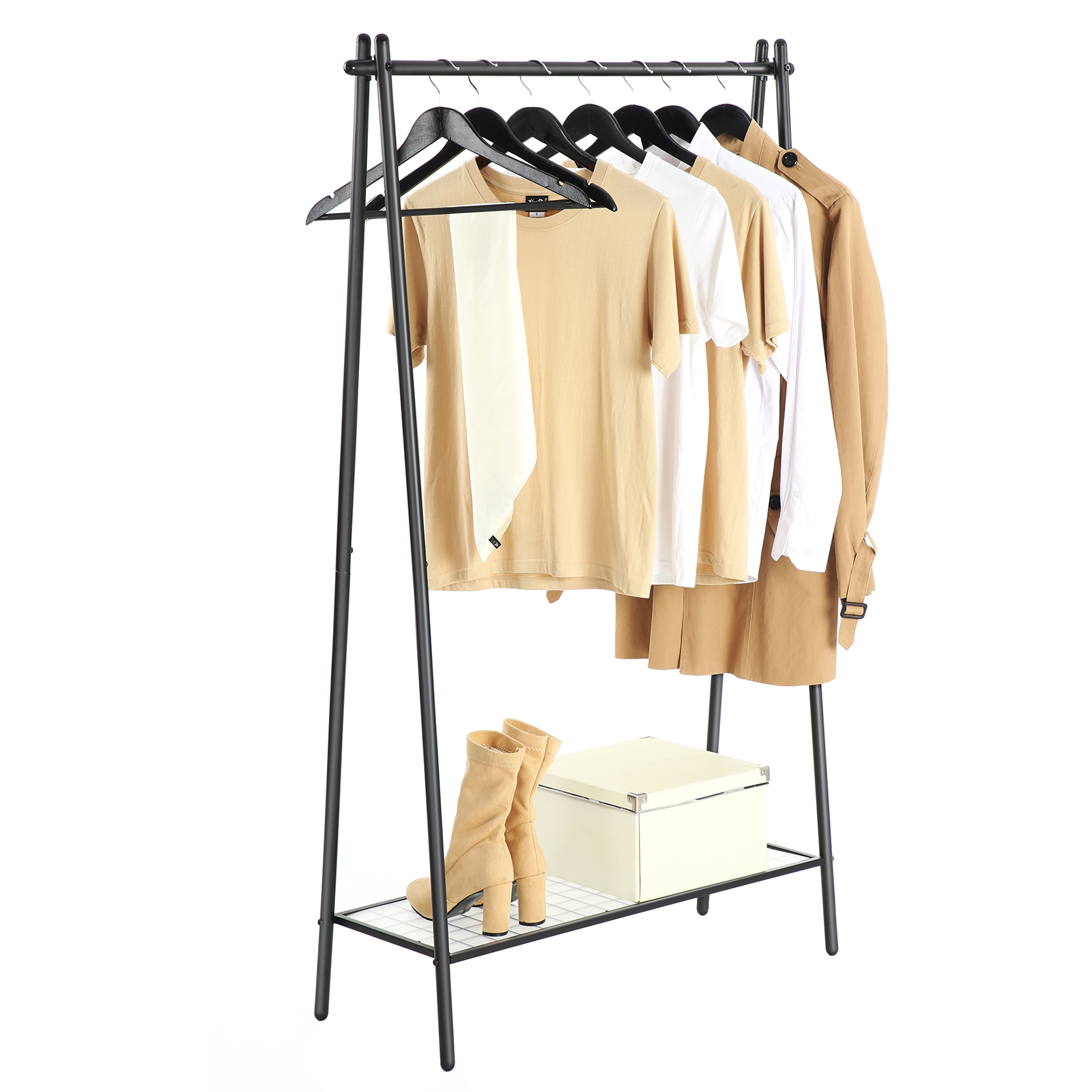 Spetsifikatsioonid: – Värvus: matt must – Materjal: raud – Mõõtmed: 92,5 x 33,5 x 153 cm (P x L x K) – Kaal: 3,6 kg – Riputusvarda maksimaalne staatiline kandevõime: 40 kg – Alumise riiuli maksimaalne staatiline kandevõime: 15 kg Pakisisu: – 1 x riidepuurauk – 1 x tarvikute komplekt – 1 x juhend (EN, DE, FR, ES, IT)