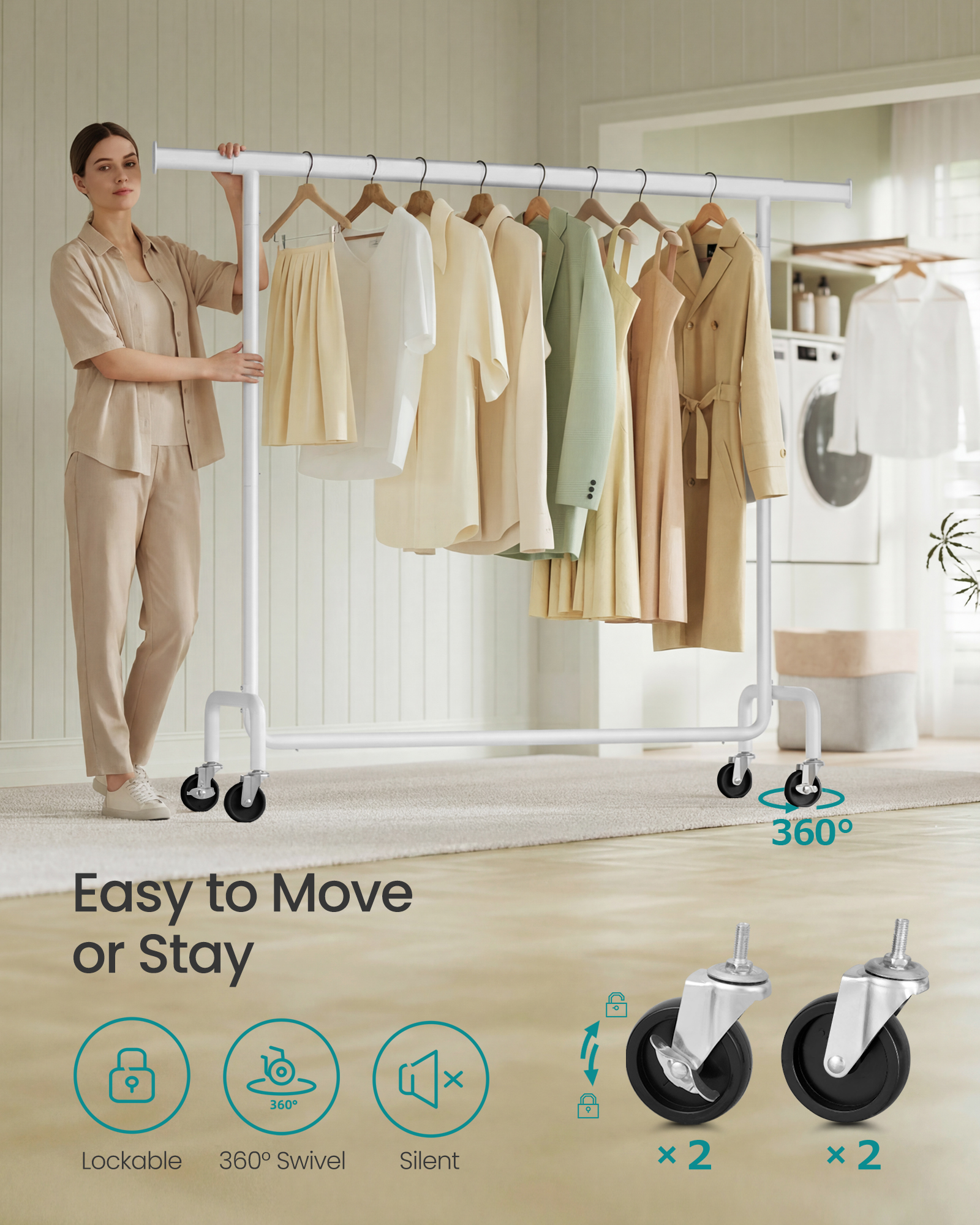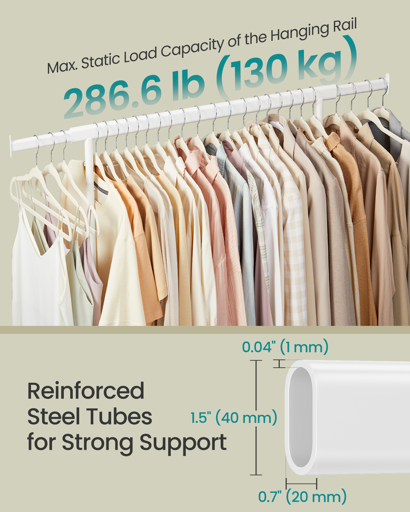 Spetsifikatsioonid: – Värvus: mattvalge – Materjal: teras, PP-rattad – Toote mõõdud: 45 x 110-150 x 160 cm (17,7”S x (43,3”-59,1”) L x 63”K) – Toote kaal: 7 kg (15,4 naela) – Maksimaalne staatiline kandevõime: 130 kg (286,6 naela) Pakisisu: – 1 x riidepuurauk – 1 x juhend