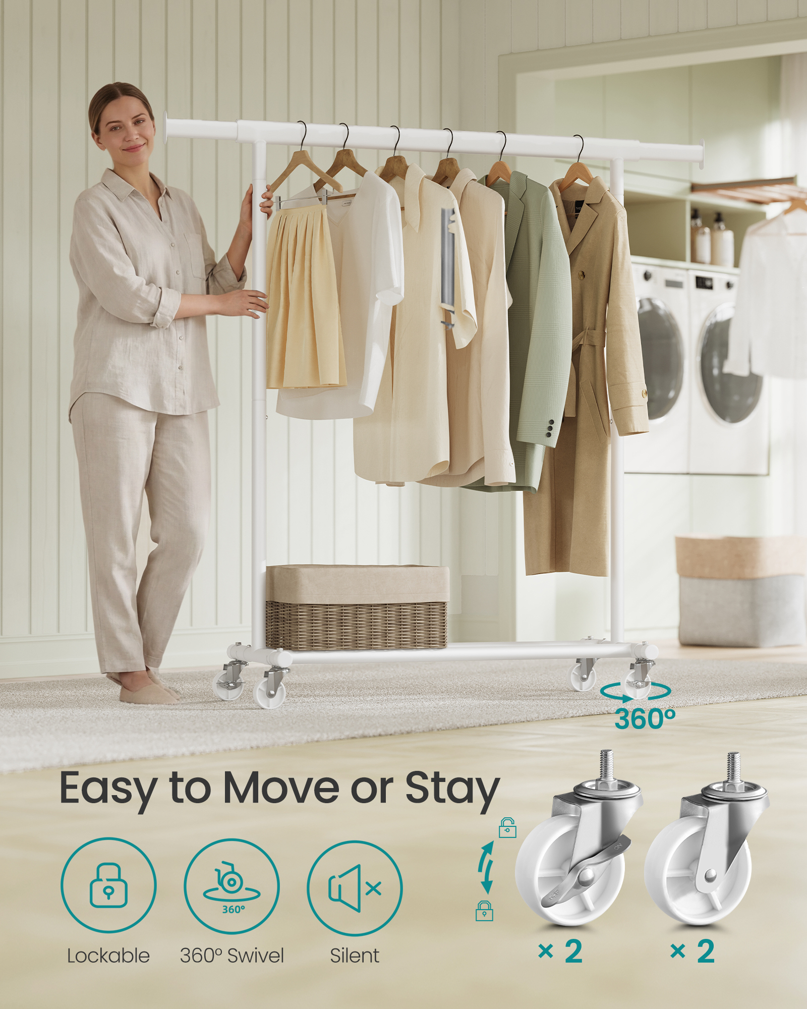 Spetsifikatsioonid: Värv: Klassikaline valge Materjal: Teras, PP Rattad Toote mõõdud: 17,9″S x (36,2″-52″)L x 63″K (45,4 x (92-132) x 160 cm) Toote kaal: 11 naela (5 kg) Maksimaalne staatiline kandevõime: 198 naela (90 kg) Pakisisu: 1 x riidepuurauk 1 x juhend