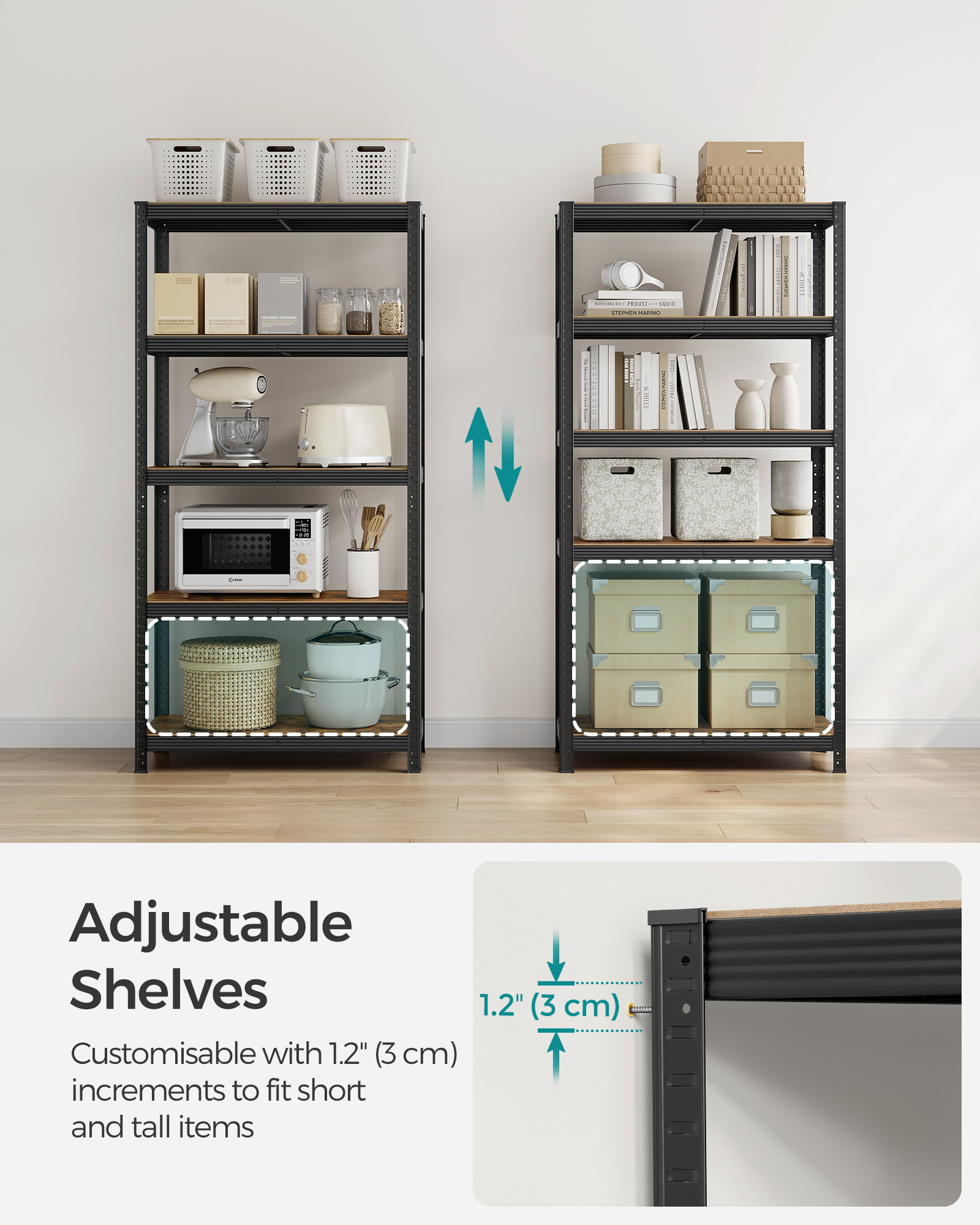 Toote andmed: Värvus: vintage-pruun-must Materjal: puitlaastplaat, teras Mõõtmed: 40 x 90 x 180 cm (S x L x K) Kaal: 14,8 kg Maksimaalne staatiline kandevõime tasandi kohta: 175 kg Maksimaalne staatiline kogukandevõime: 875 kg Tarnekomplekt: 1 x vastupidav riiul 1 x ümberkukkumisvastane kaitse 1 * Kasutusjuhend