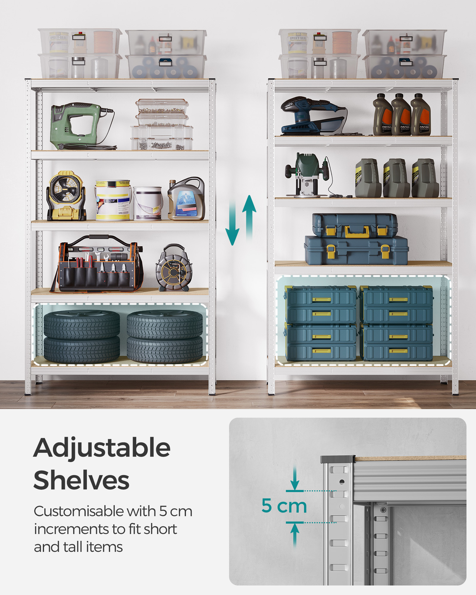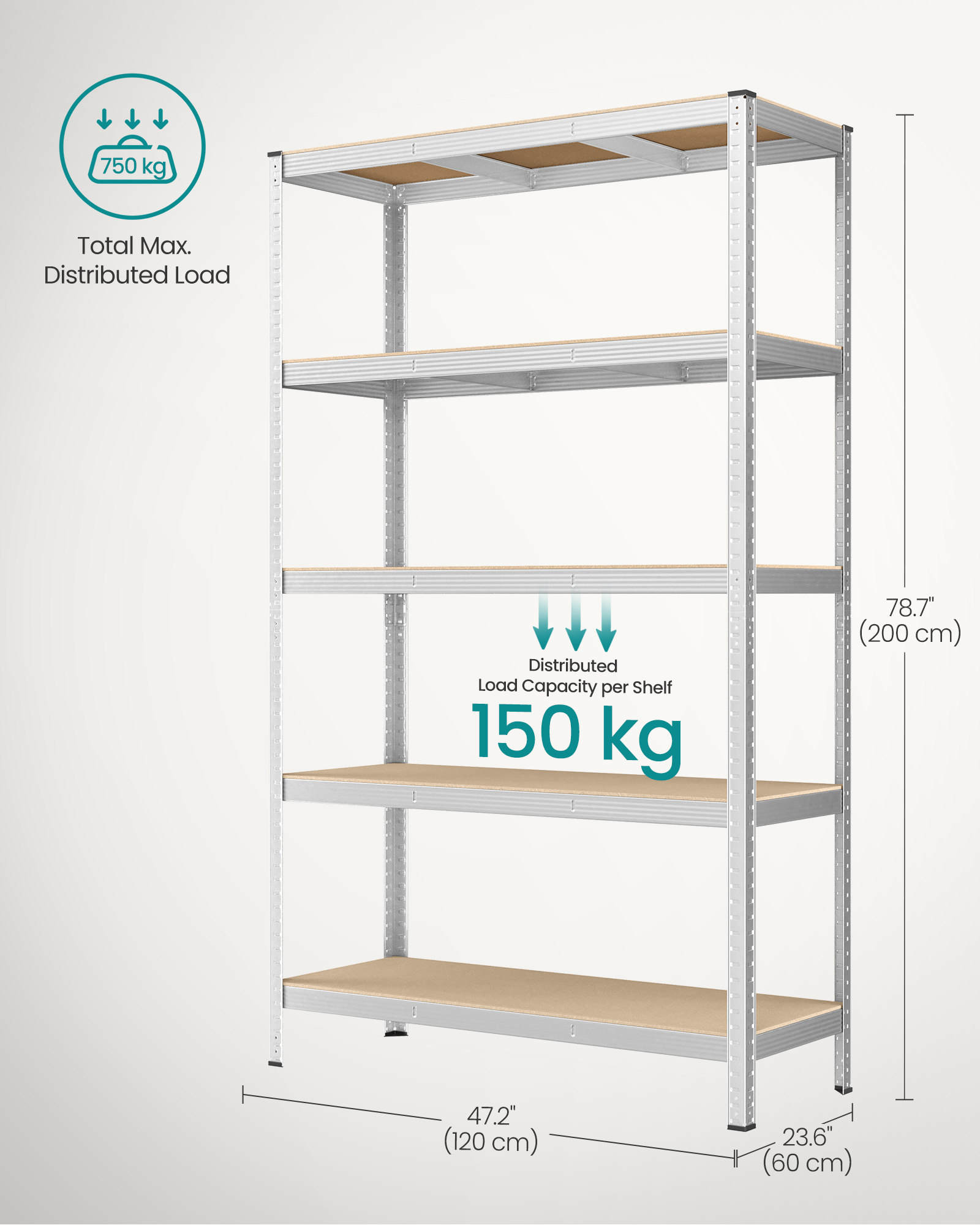 Toote andmed: Värvus: HõbedaneMaterjal: Teras, MDF (keskmise tihedusega puitkiudplaat)Mõõtmed: 200 x 120 x 60 cm (K x P x L). Kaal: 22,7 kg. Maksimaalne staatiline kandevõime riiuli kohta: 175 kg Karbi sisu: 1 x hoiuriiul, 1 x kaldekaitse, 1 x juhend (inglise keele täpsus ei ole garanteeritud)