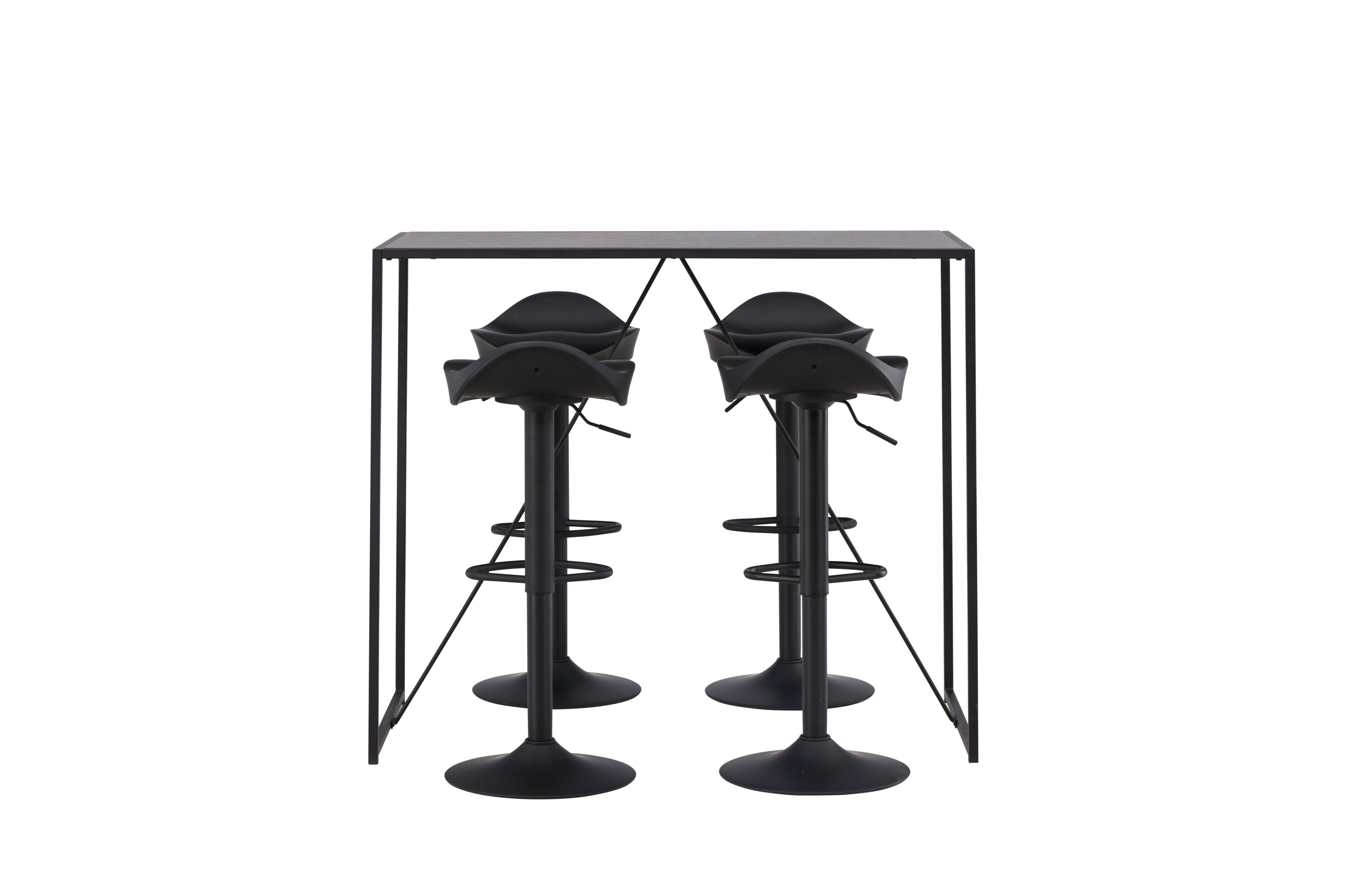 Stiilne, kaasaegne ja ajatu! See baarigrupp koosneb Brea seeria baarilauast, mis on kombineeritud 4 Adesto sarja baaritooliga. Baaripukil on stiilne disain, mille trompetijalg on mustast terasest ja lihtne iste mustast plastikust. Baarilaual on trendikindel, minimalistlikus stiilis skandinaavialik disain, õhuke mustast MDF-st lauaplaat, mille raamile on kitsas raamikonstruktsioon mustast terasest. Asetage kööki söögirühmaks või kohta, kus on vaja täiendavaid istekohti ja nautige pikki õhtusööke pere ja sõpradega.
