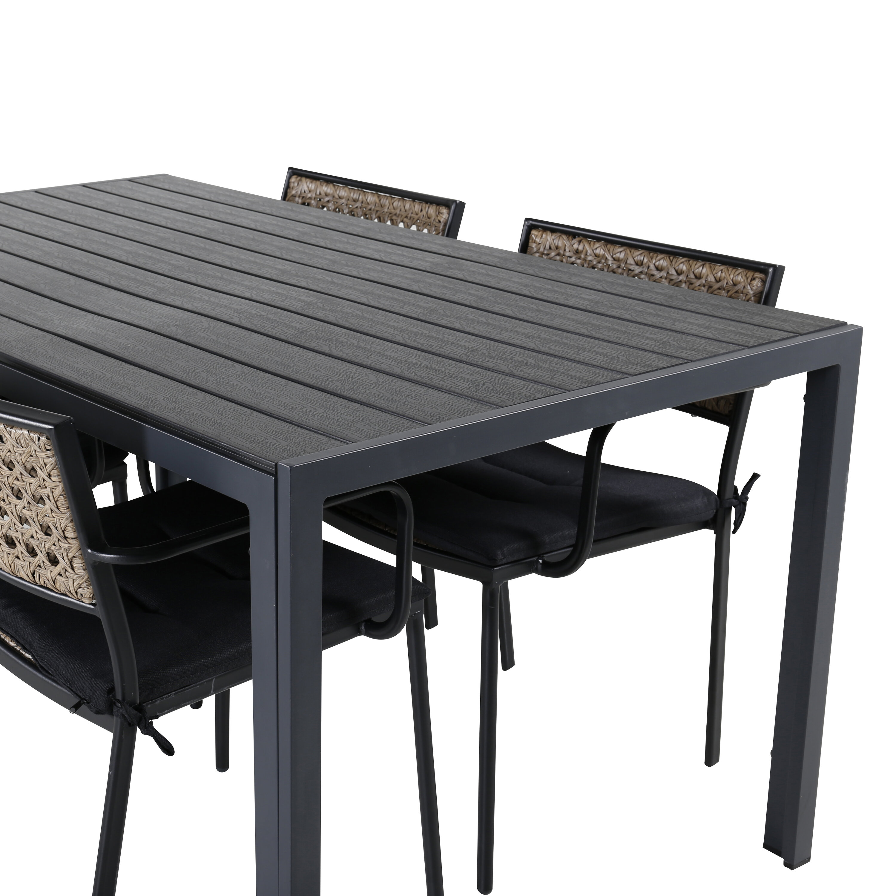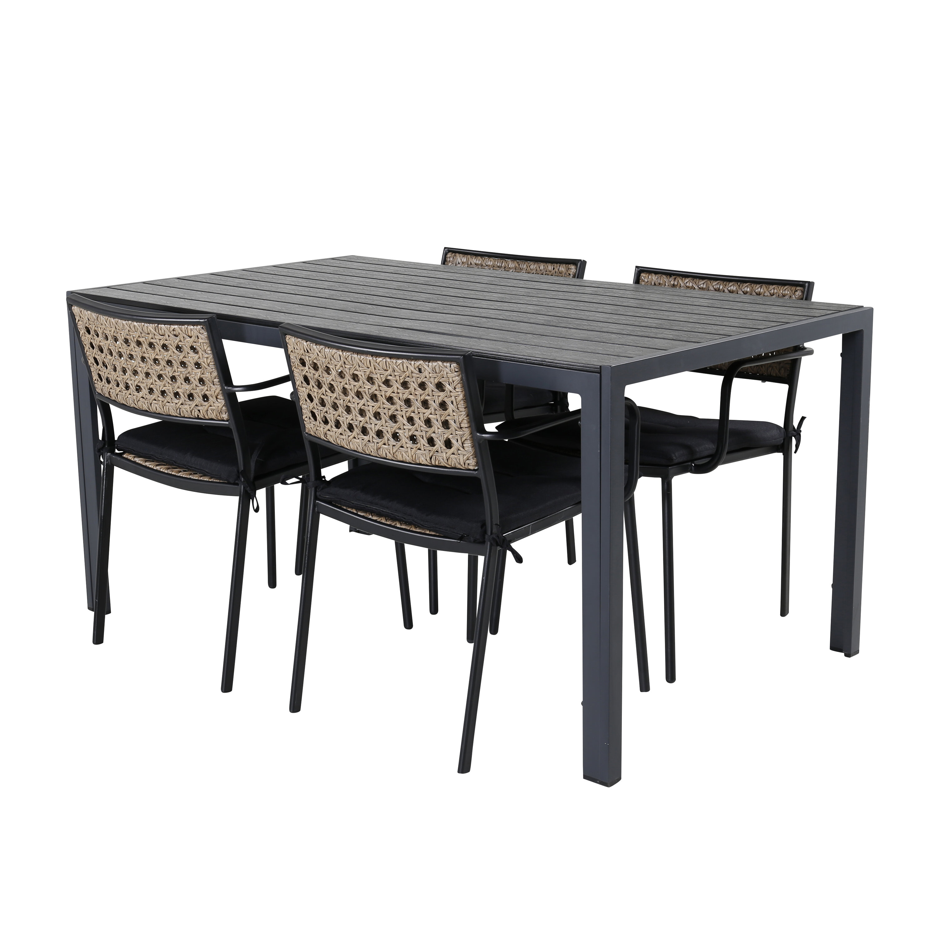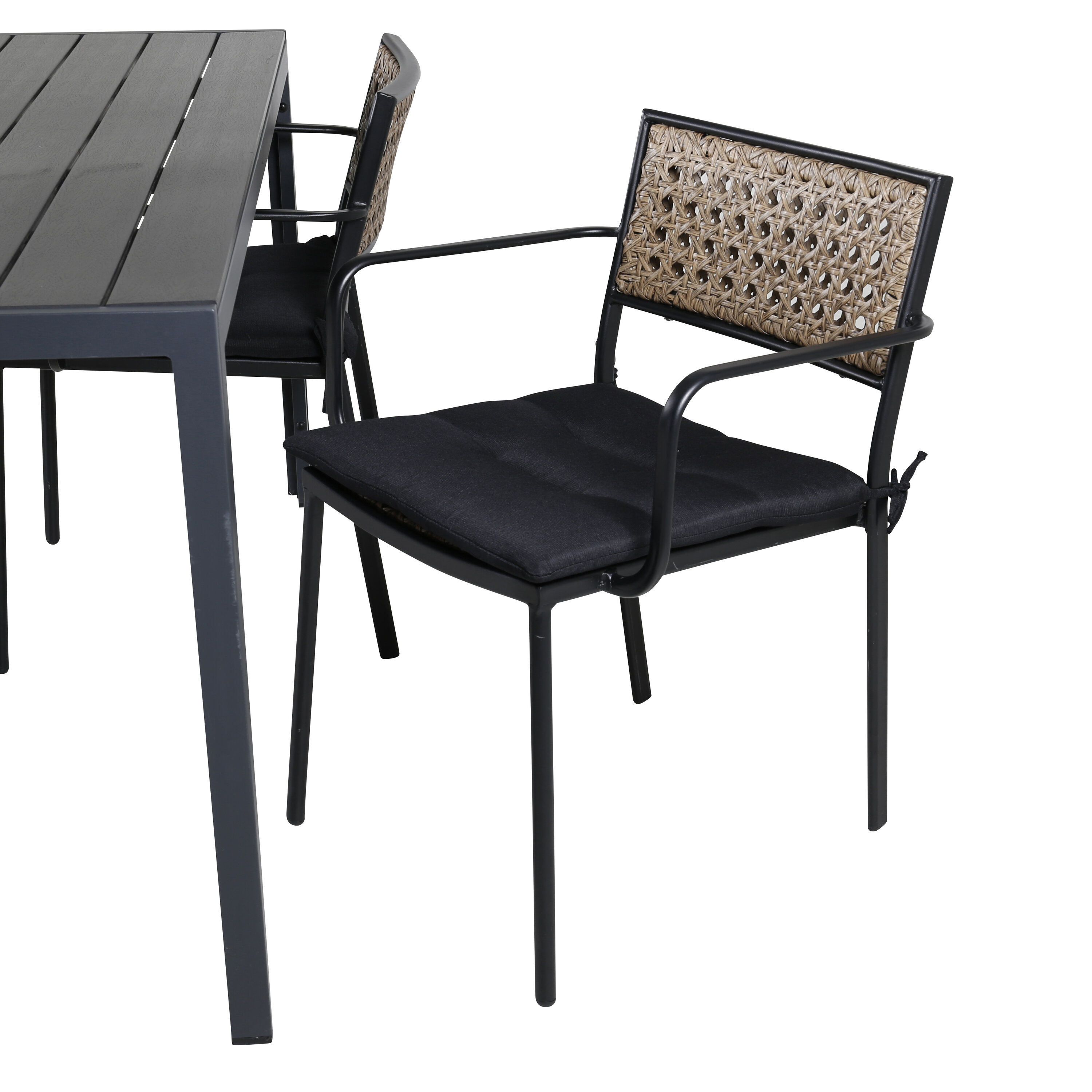 Harmooniline toidugrupp suvisteks eineteks! Paola söögitool on ideaalne segu dekoratiivse puidu ja stiilse musta värvi vahel. Peened värvide kontrastid loovad õues harmoonilise tunde! Siin on täiuslik kombinatsioon meie mustast alumiiniumist ristkülikukujulise söögilaua ja vineerist lauaplaadiga. Lihtsalt hästi läbimõeldud toidugrupp, millega saad hõlpsasti luua võluvaid välikeskkondi!