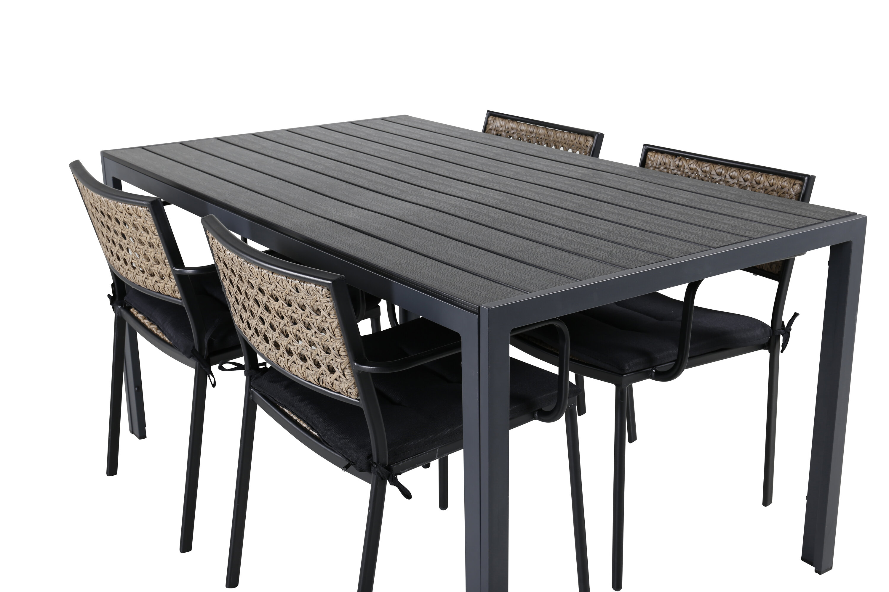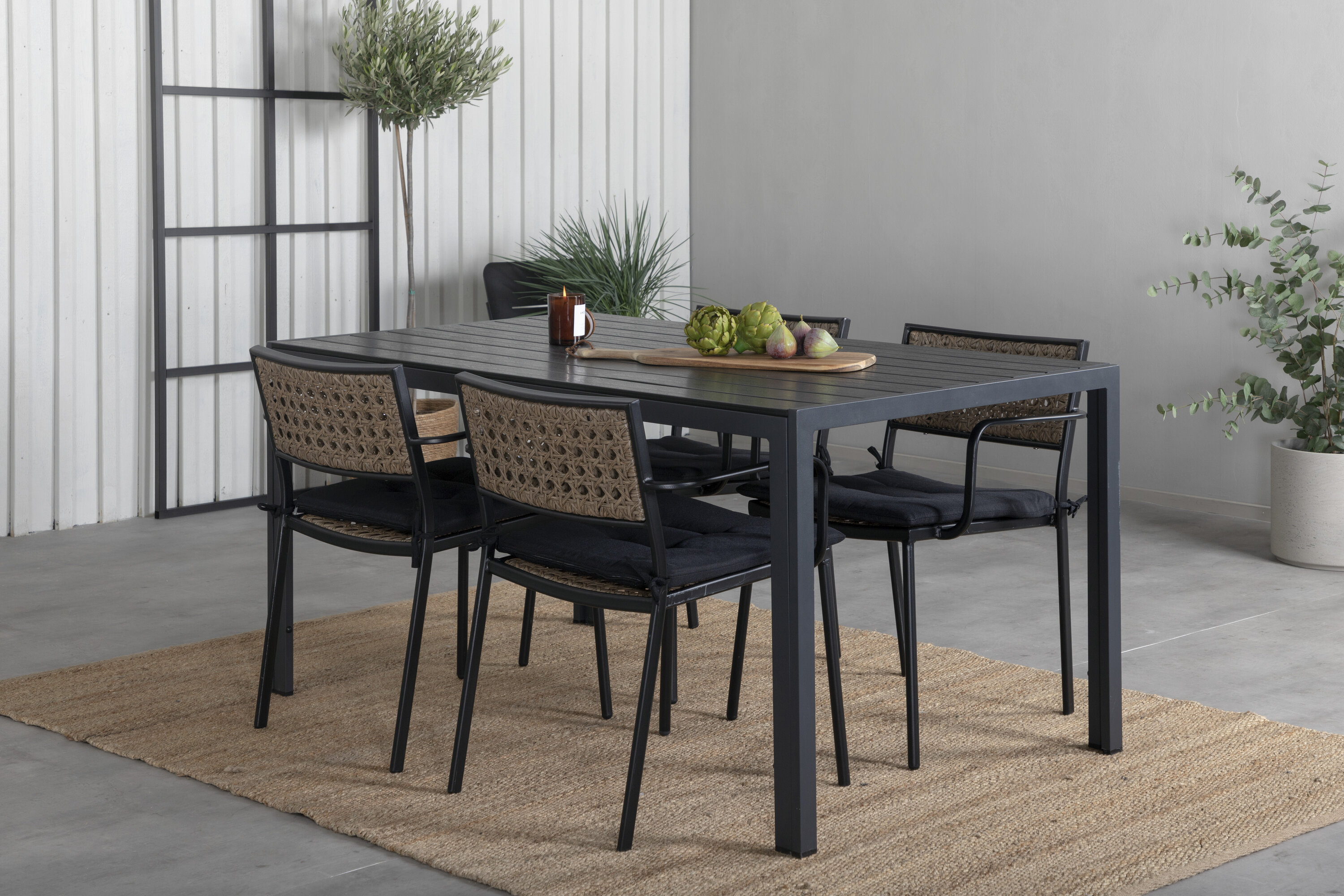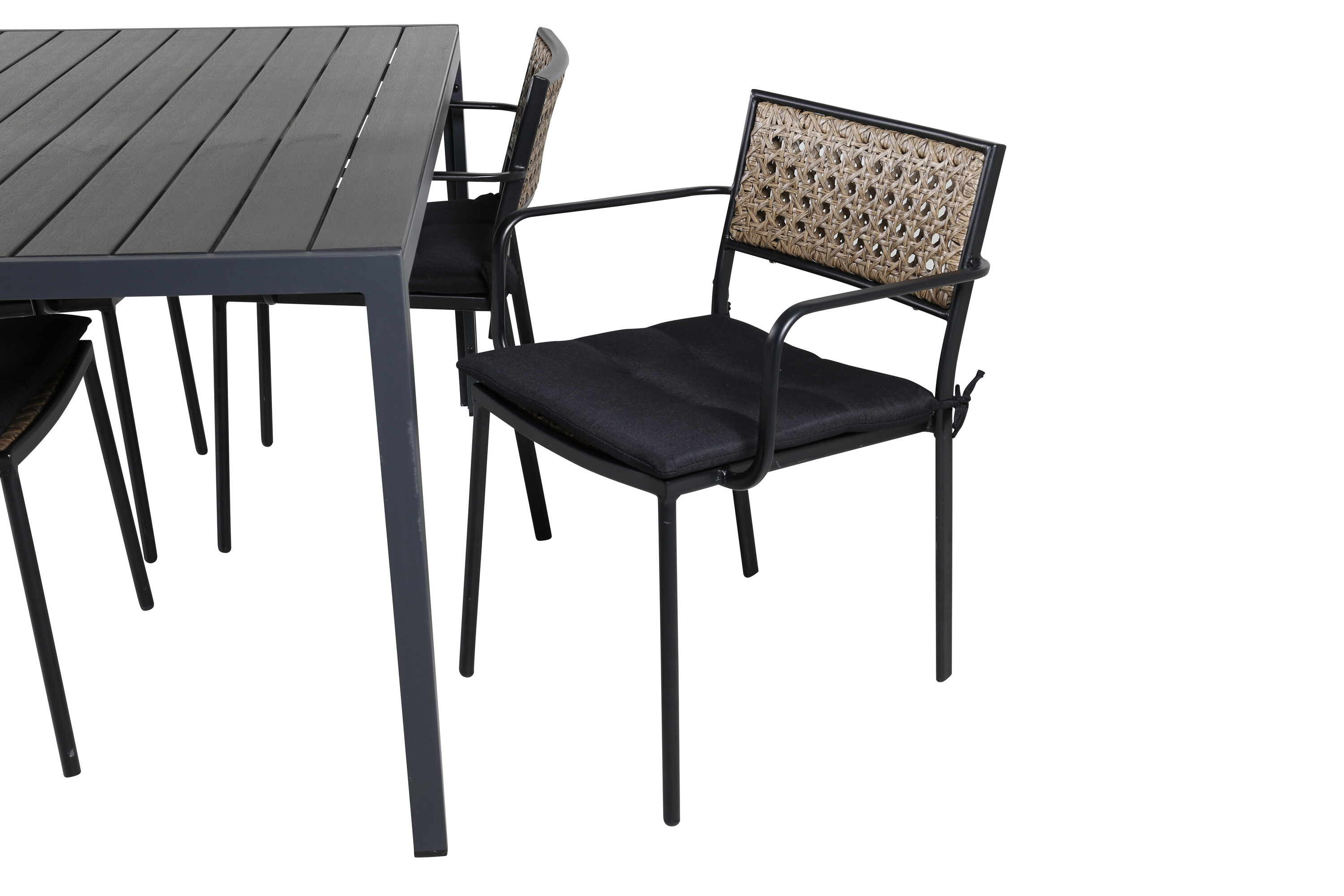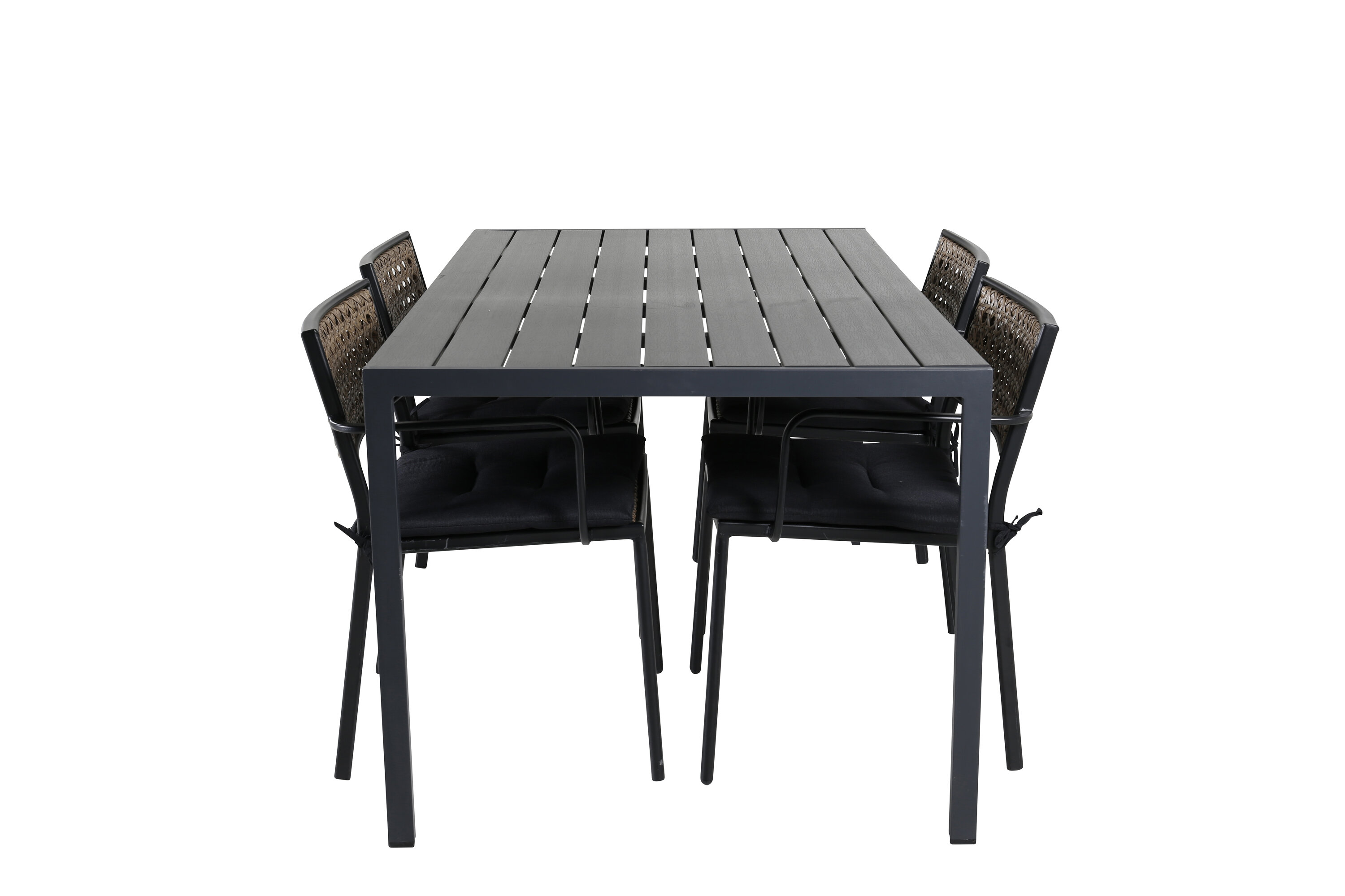 Harmooniline toidugrupp suvisteks eineteks! Paola söögitool on ideaalne segu dekoratiivse puidu ja stiilse musta värvi vahel. Peened värvide kontrastid loovad õues harmoonilise tunde! Siin on täiuslik kombinatsioon meie mustast alumiiniumist ristkülikukujulise söögilaua ja vineerist lauaplaadiga. Lihtsalt hästi läbimõeldud toidugrupp, millega saad hõlpsasti luua võluvaid välikeskkondi!