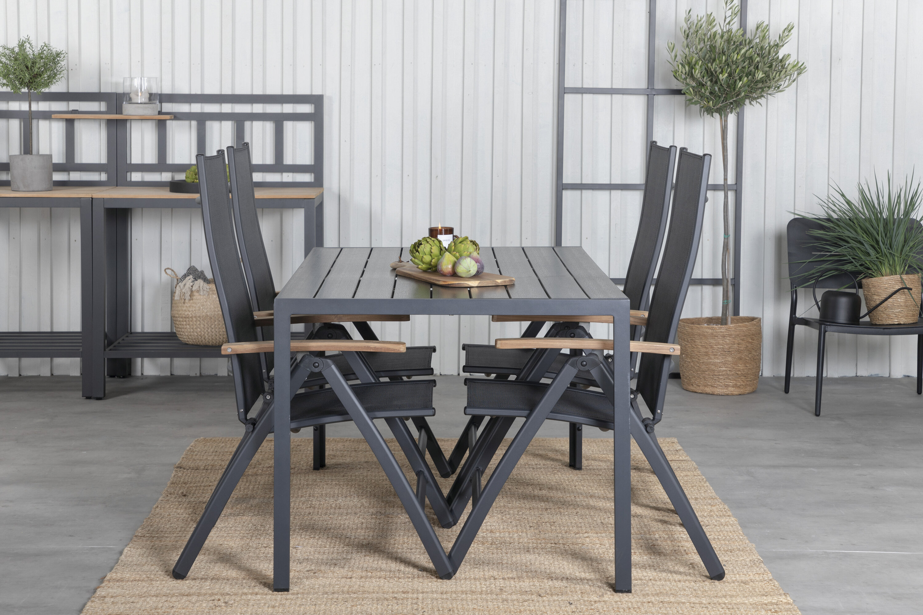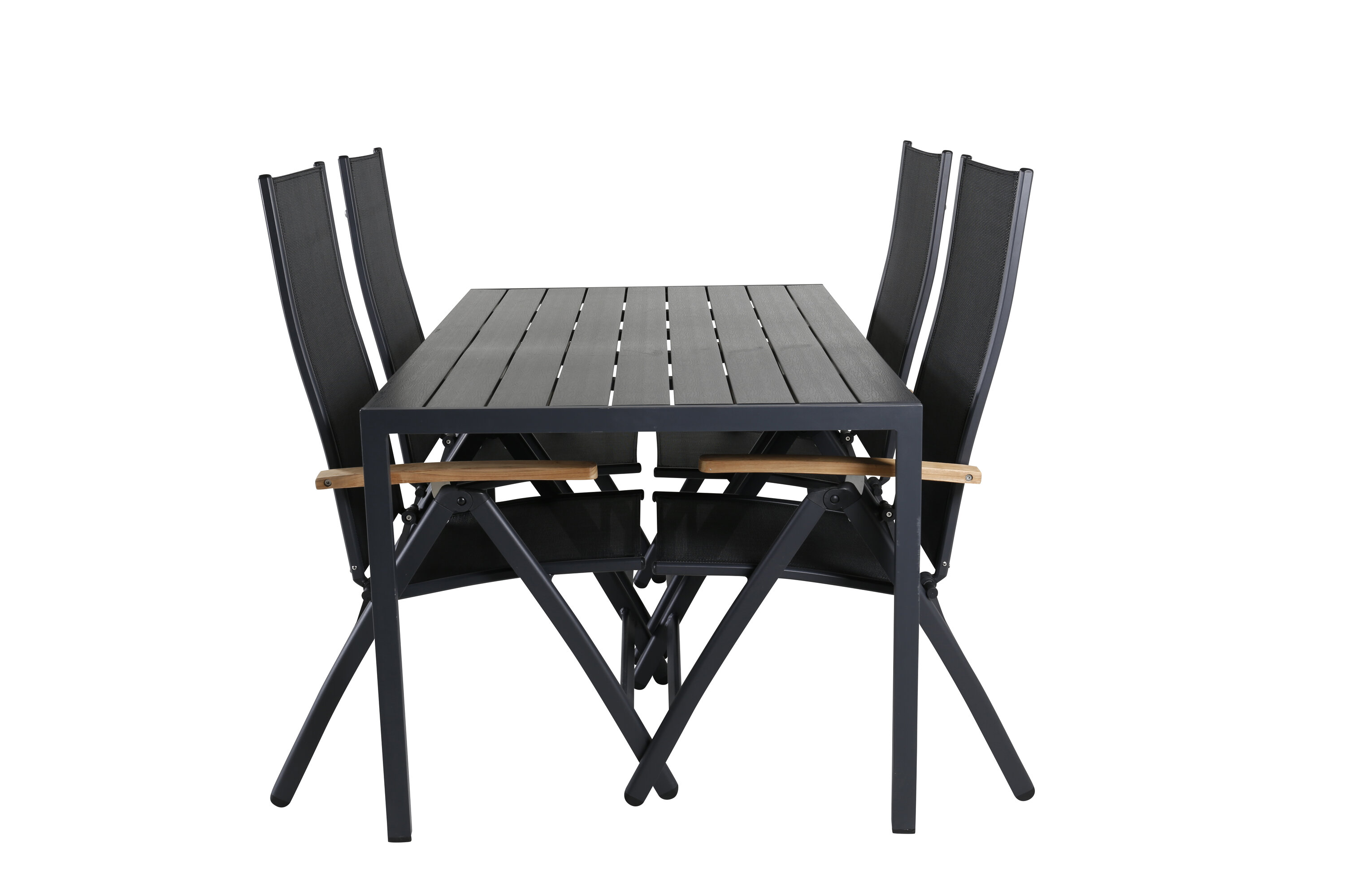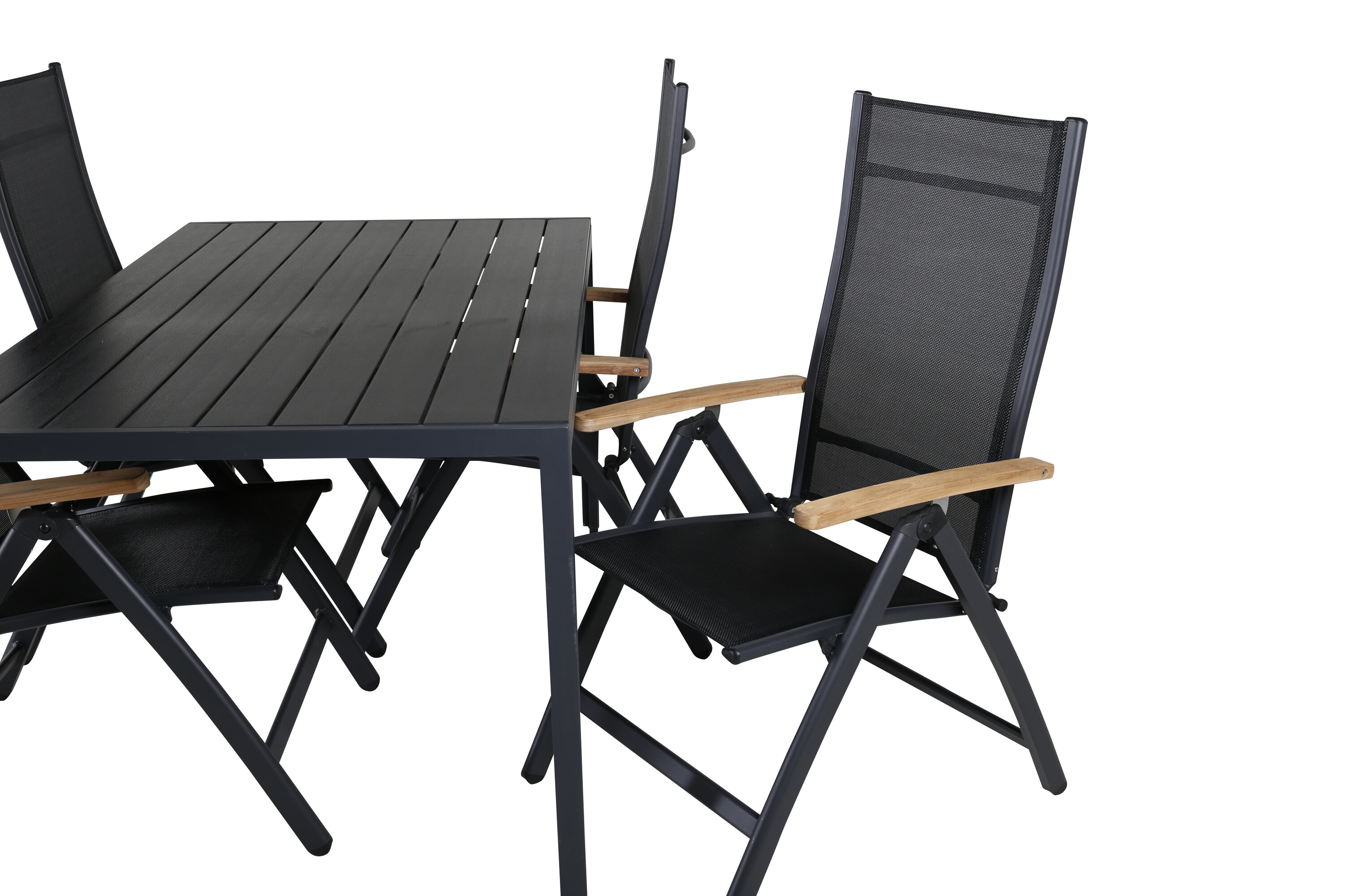Istuge sel suvel mugavalt ja vajuge neisse Panama sarja maitsvatesse söögitoolidesse. Nendel kokkupandavatel toolidel on stiilne disain vastupidavast mustast tekstiilist materjalist ja maitsvad tiikpuust detailid. Siin koos meie ristkülikukujulise söögilauaga katke musta värvi. Lauaplaat on vineerist ja veermik mustast alumiiniumist. Siin istute teie ja teie külalised mugavalt ja saate nautida mõnusaid eineid terrassil!