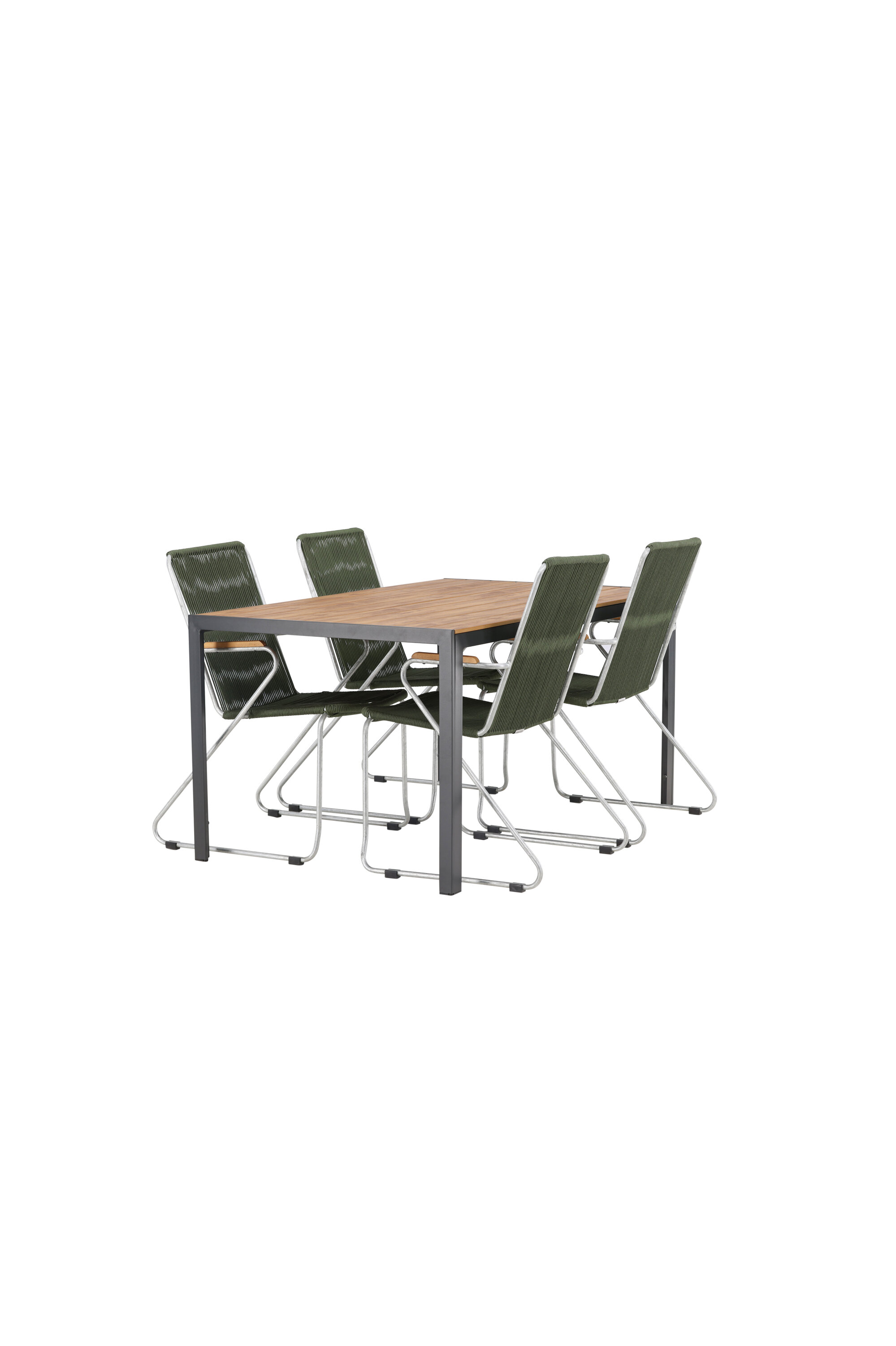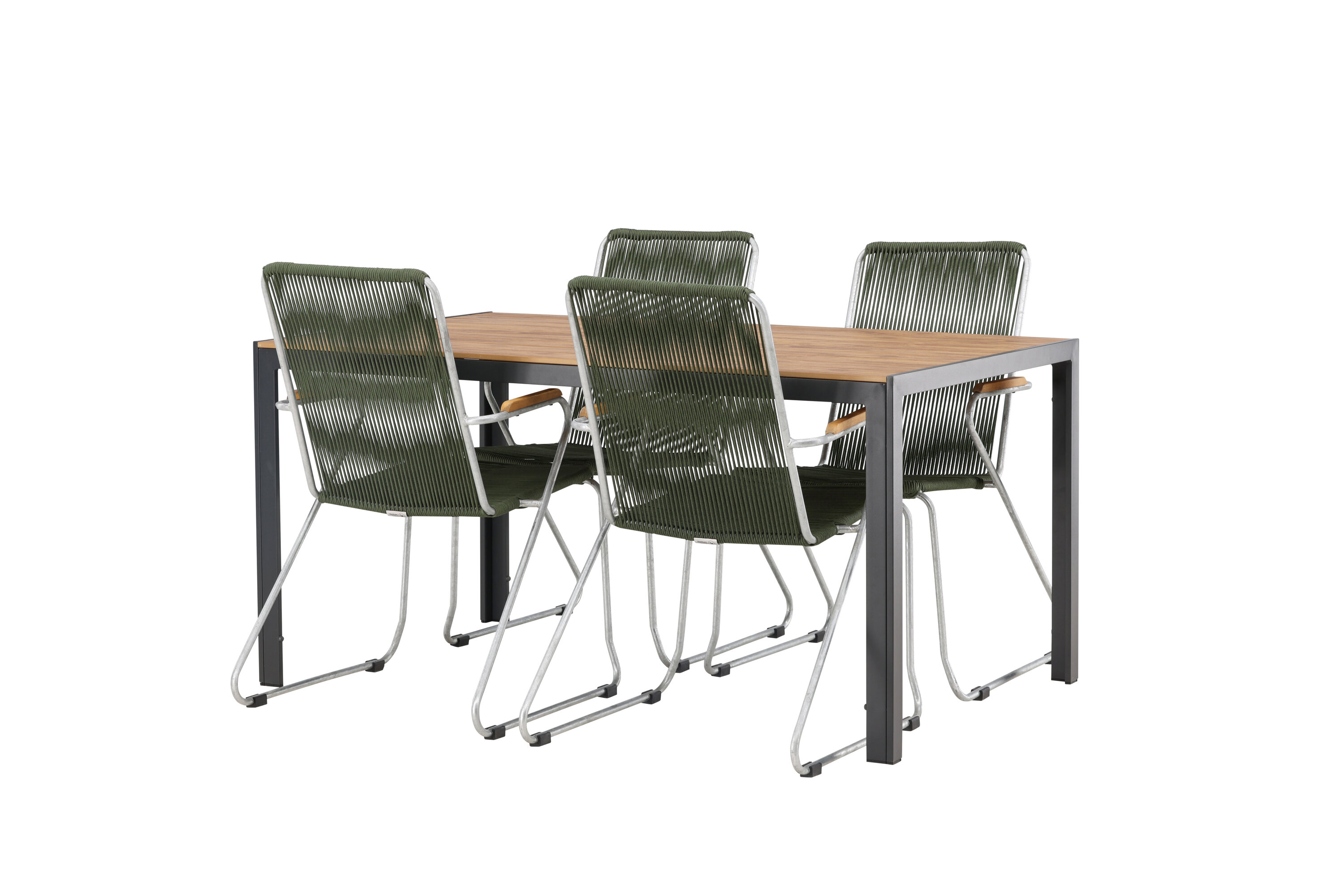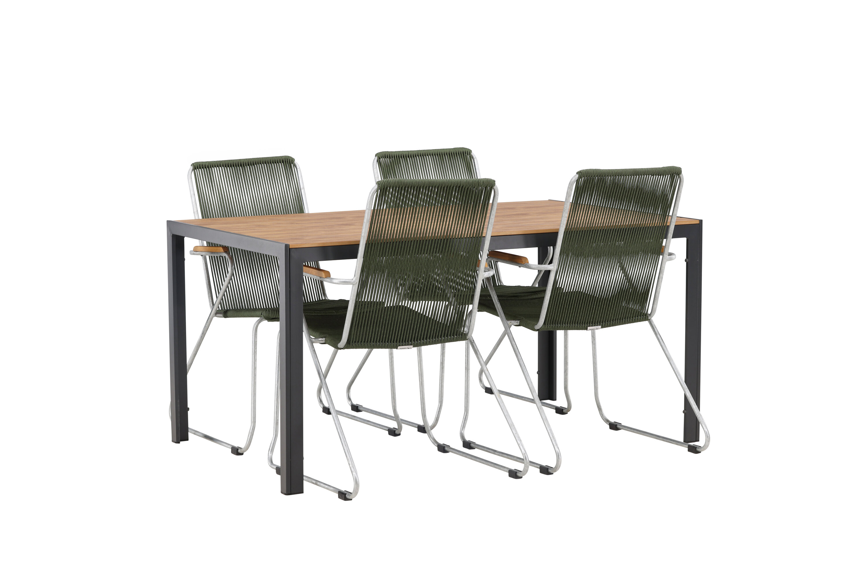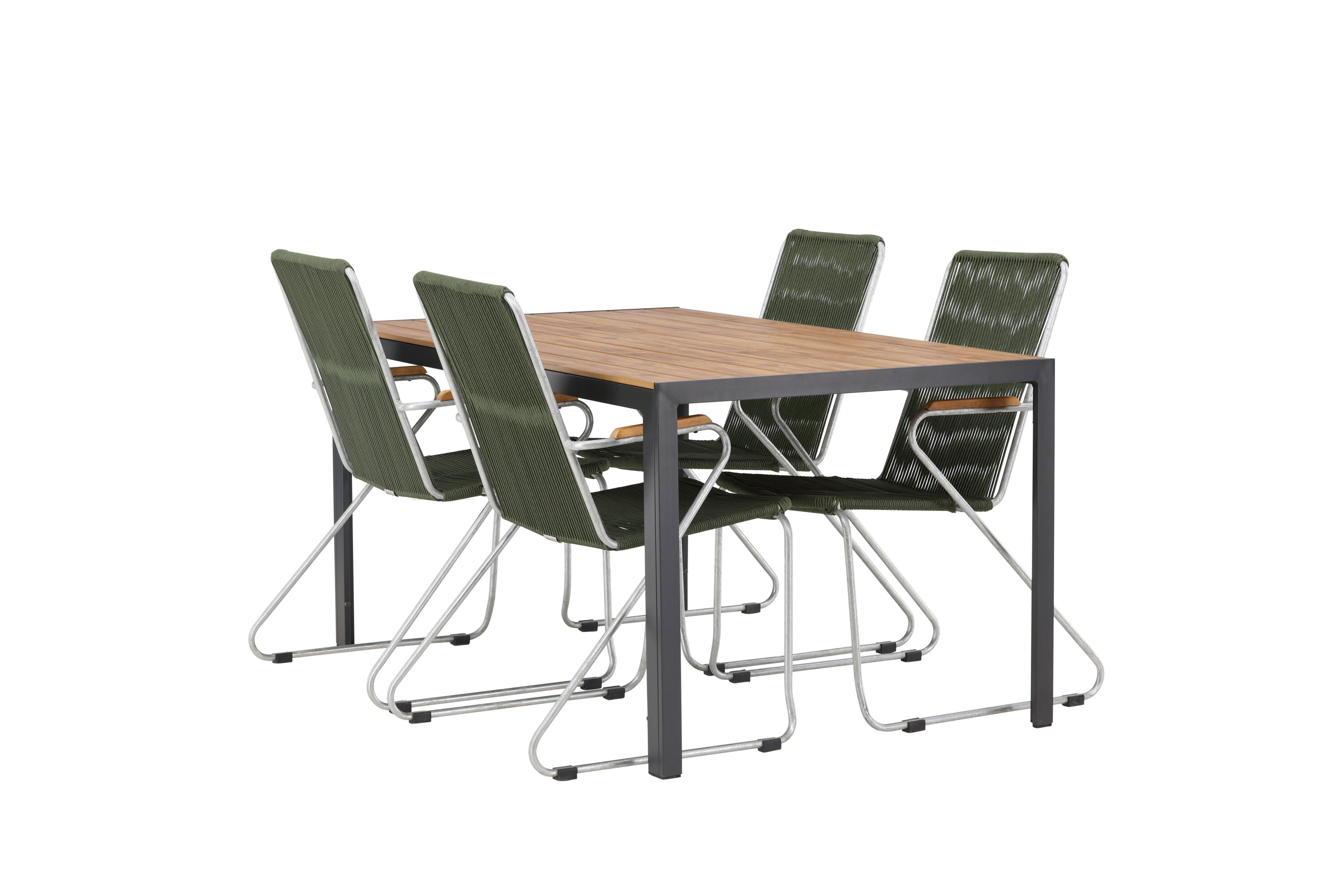 Lõhkuge kõik lihtsad värvid hüppelise värvikombinatsiooniga – siit leiate söögigrupi, mis avaldab muljet! Ristkülikukujuline söögilaud Break on sirgete põhjamaiste vormidega vineerist lauaplaadi ja mustade alumiiniumist lauajalgadega. Siin ainulaadses kombinatsioonis 4 Bois sarja rohelise söögitooliga. Sellel toolil on mugav tsinkkonstruktsioon, iste rohelisest köiest ja dekoratiivsed tiikpuust käetoed. Söögigrupp on välikindel ja sobib nii terrassile kui talveaeda! Laua mõõdud: 150x90cm.